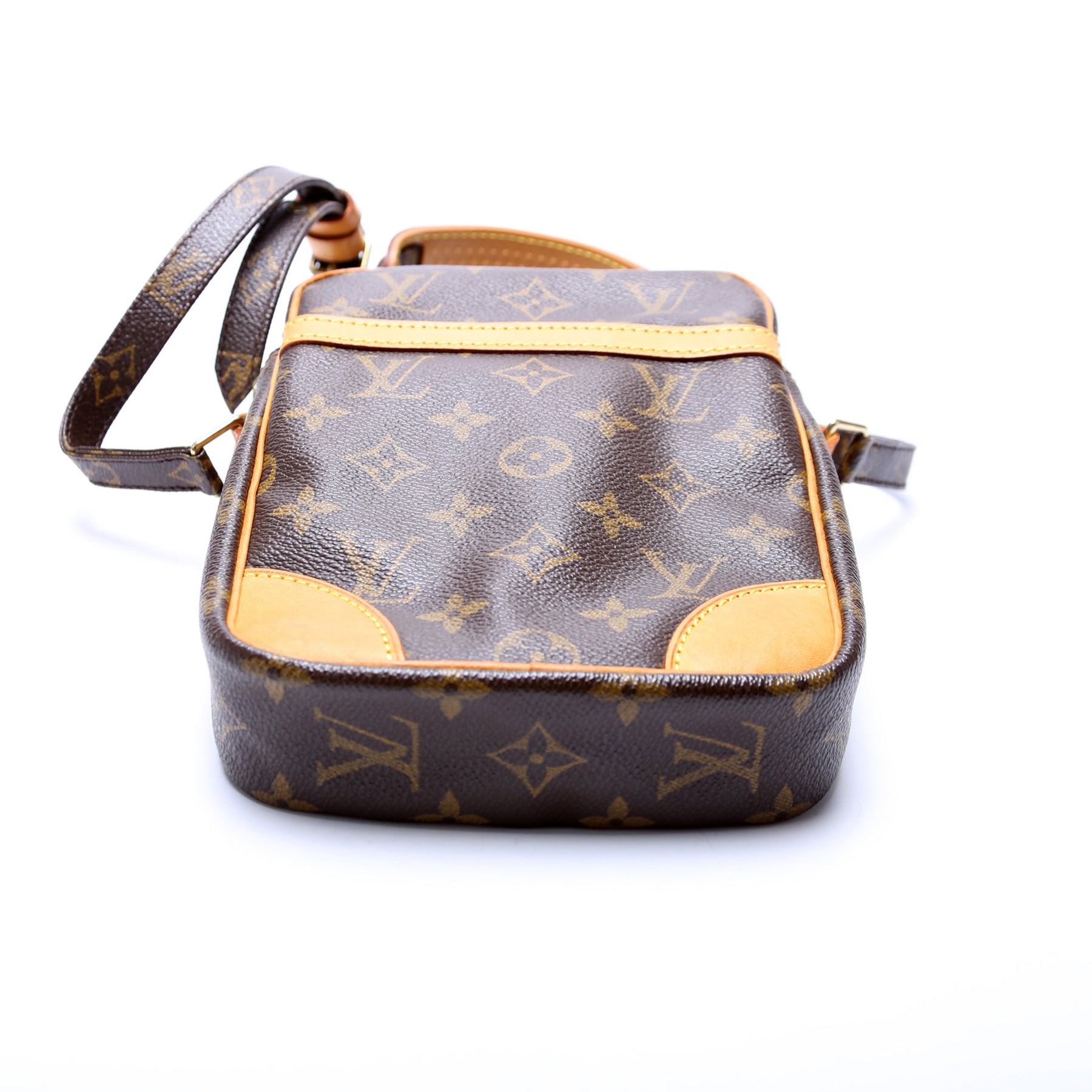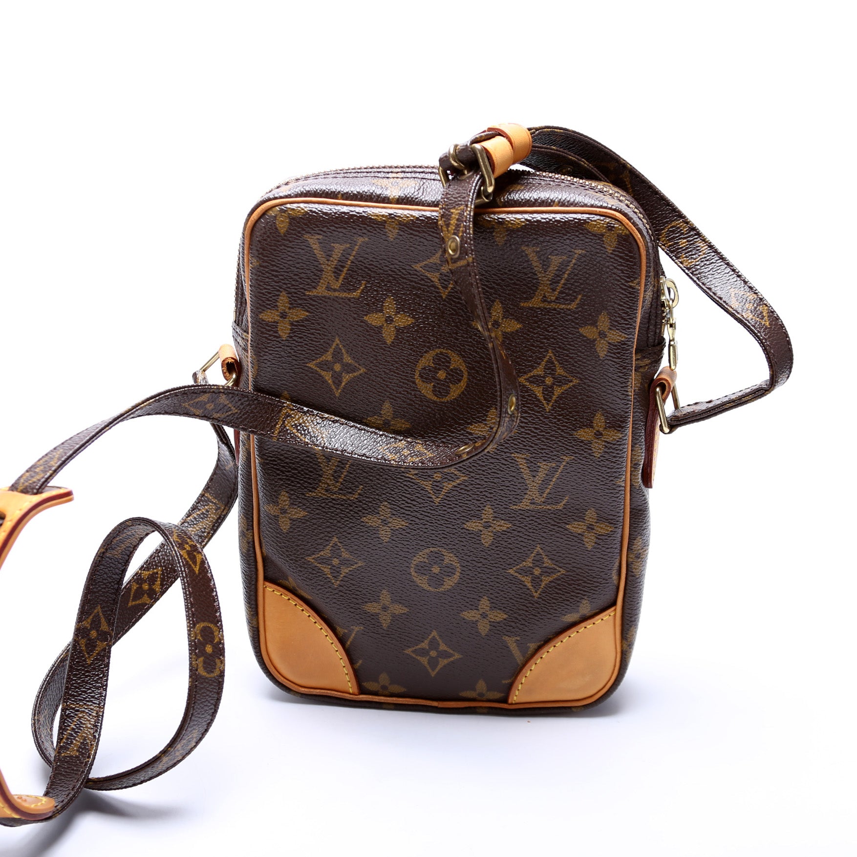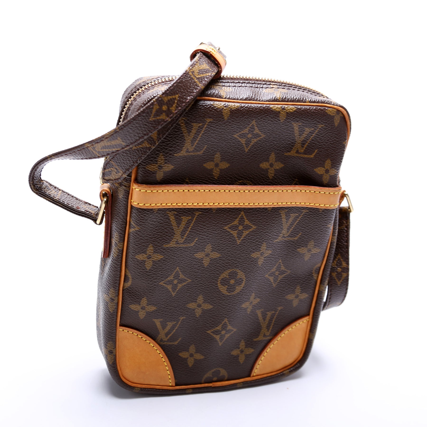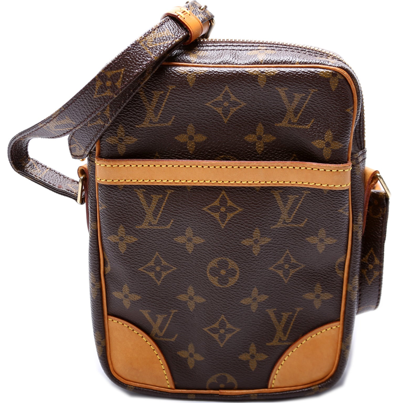 This pre-owned Louis Vuitton Danube is guaranteed 100% authentic. The exterior is in the classic Louis Vuitton Monogram coated canvas.