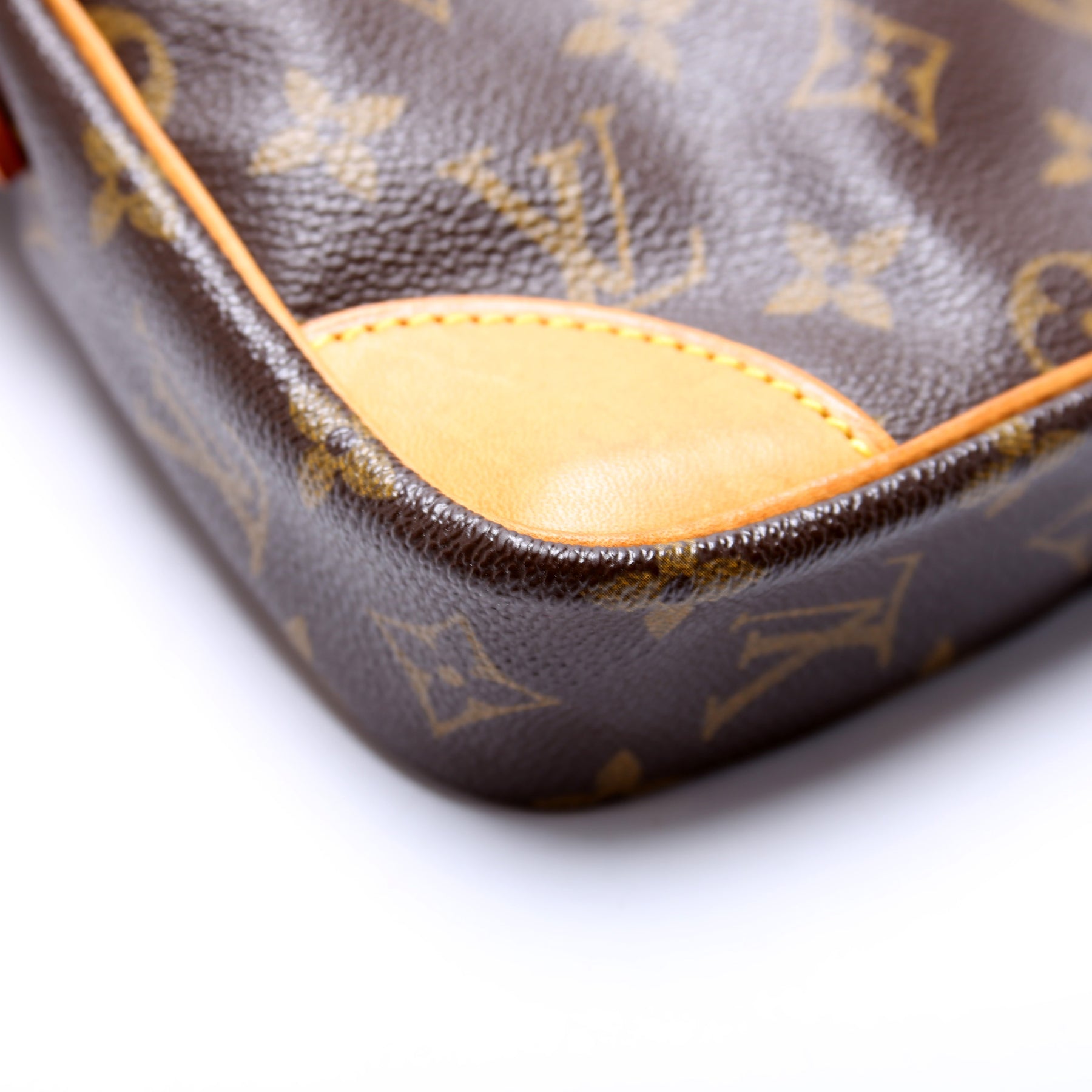 Exterior: The exterior Monogram coated canvas is free of any rips or cracks. The exterior features one open pocket. The leather details show minor discoloration.