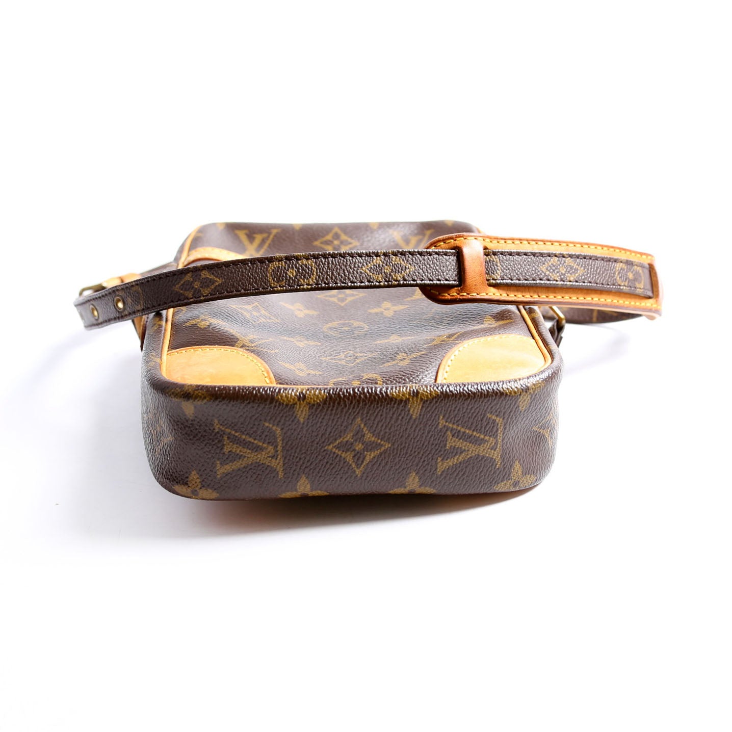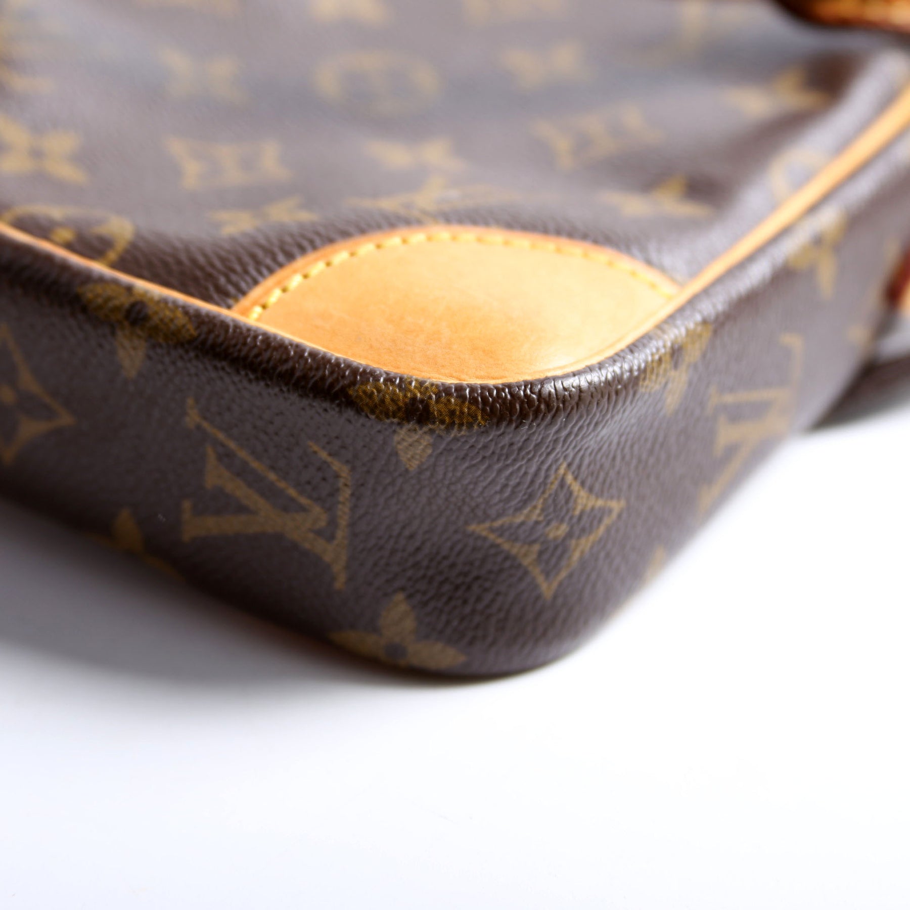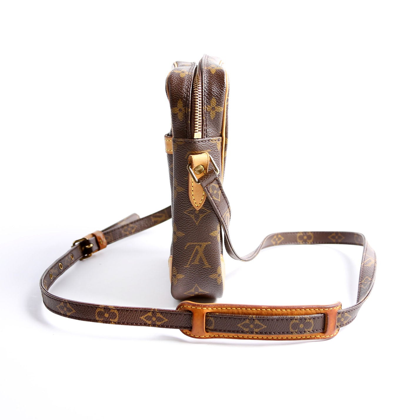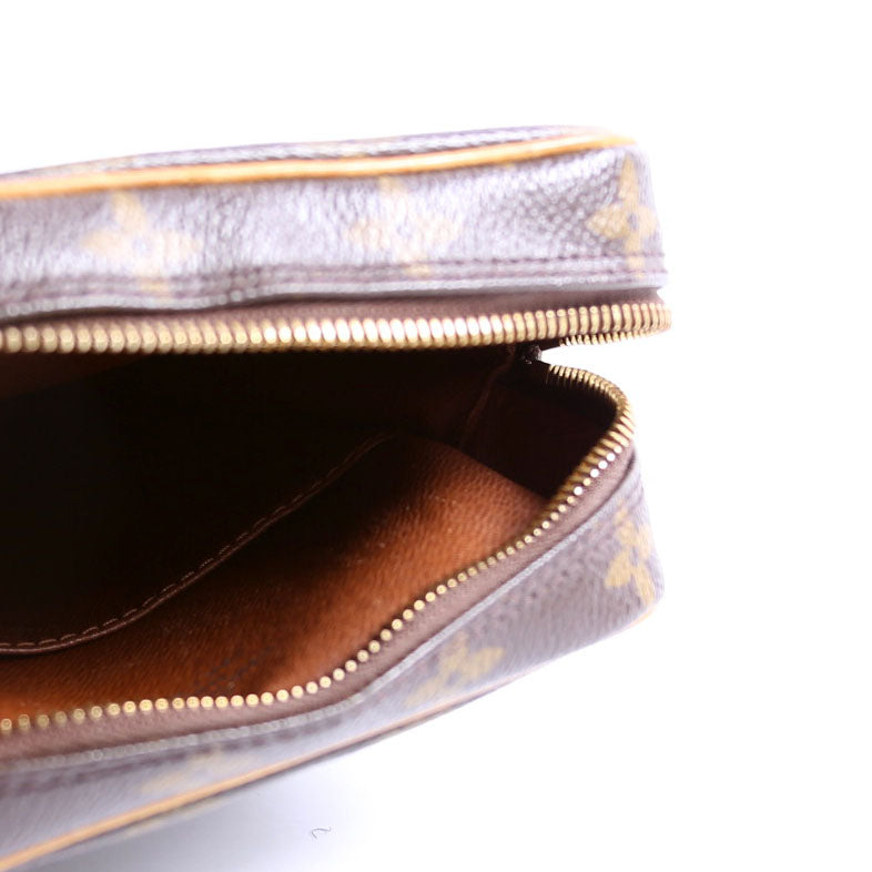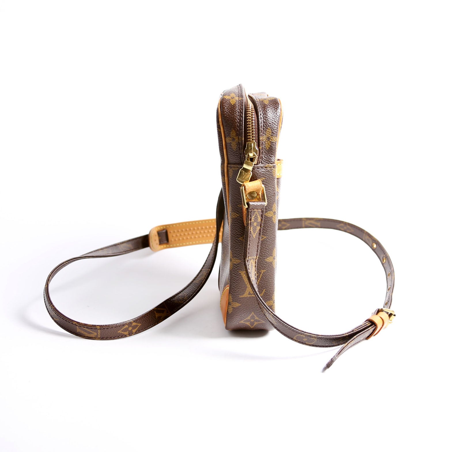 This pre-owned Louis Vuitton Danube is guaranteed 100% authentic. The exterior is in the classic Louis Vuitton Monogram coated canvas.
