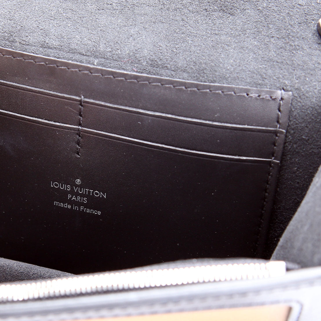 Interior: The interior shows light wear throughout. It features four card slots, one open pocket, and one zip closure pocket.