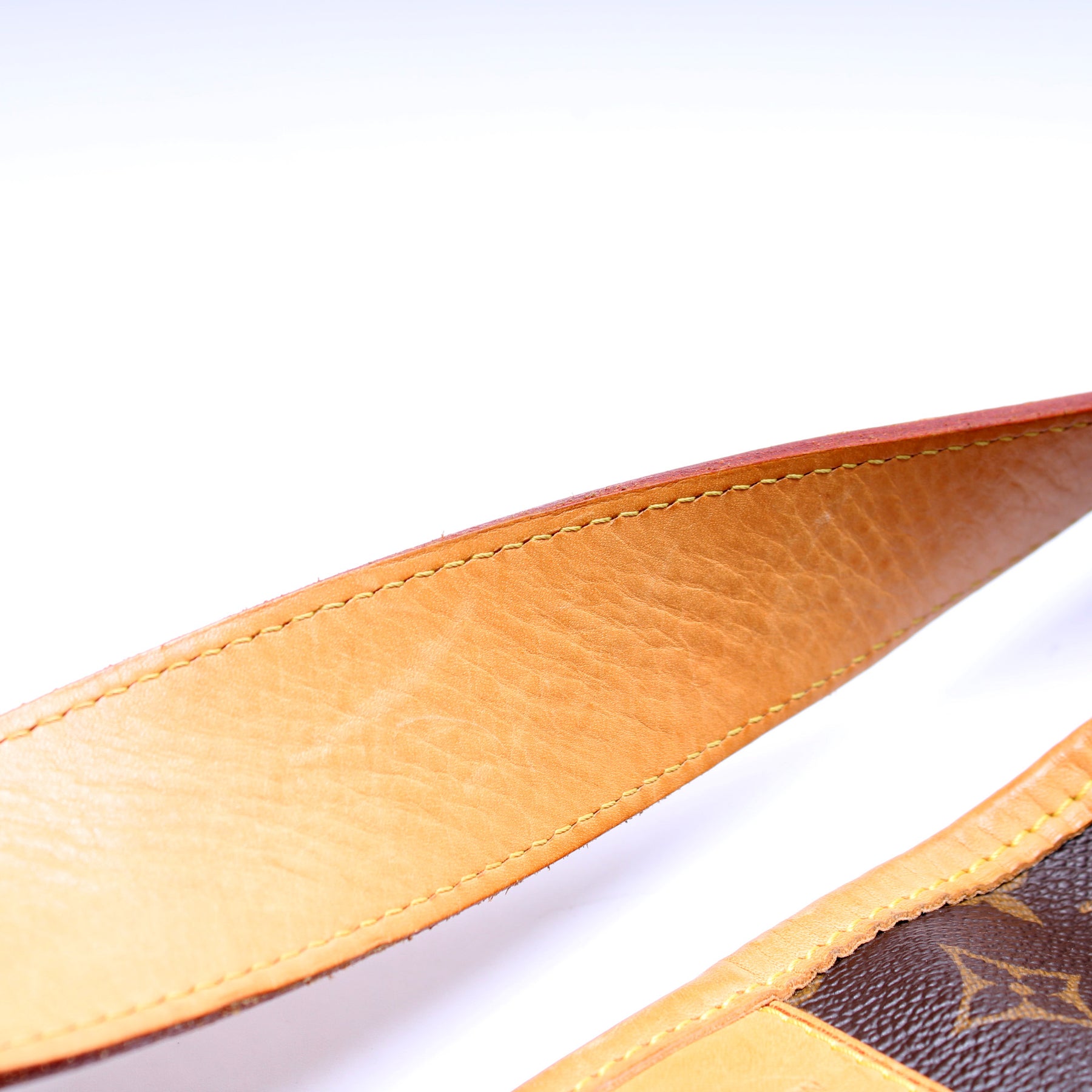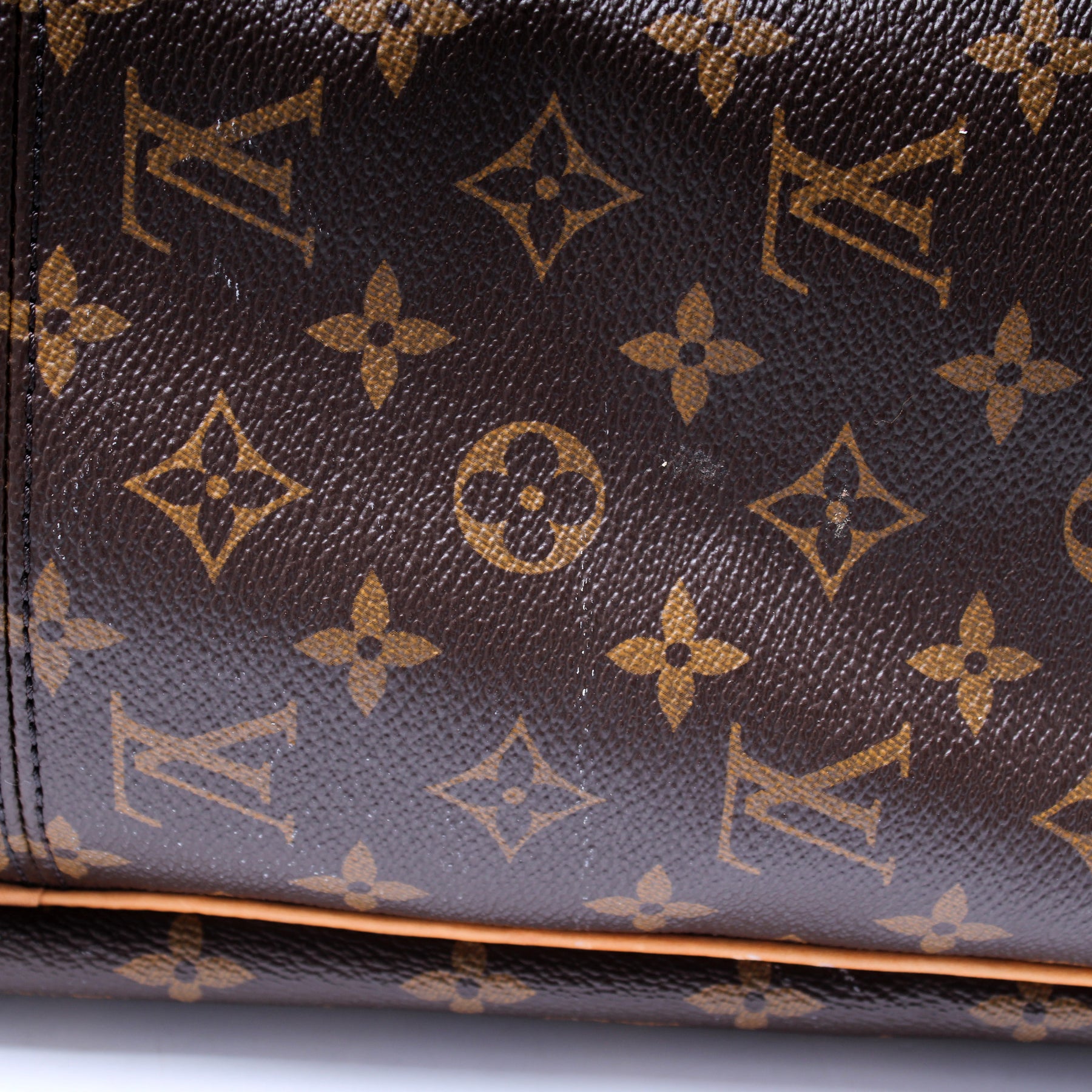 Exterior: The exterior Monogram coated canvas is free of any rips or cracks. The exterior features two zipper pockets. The leather trim shows minor scuffs.