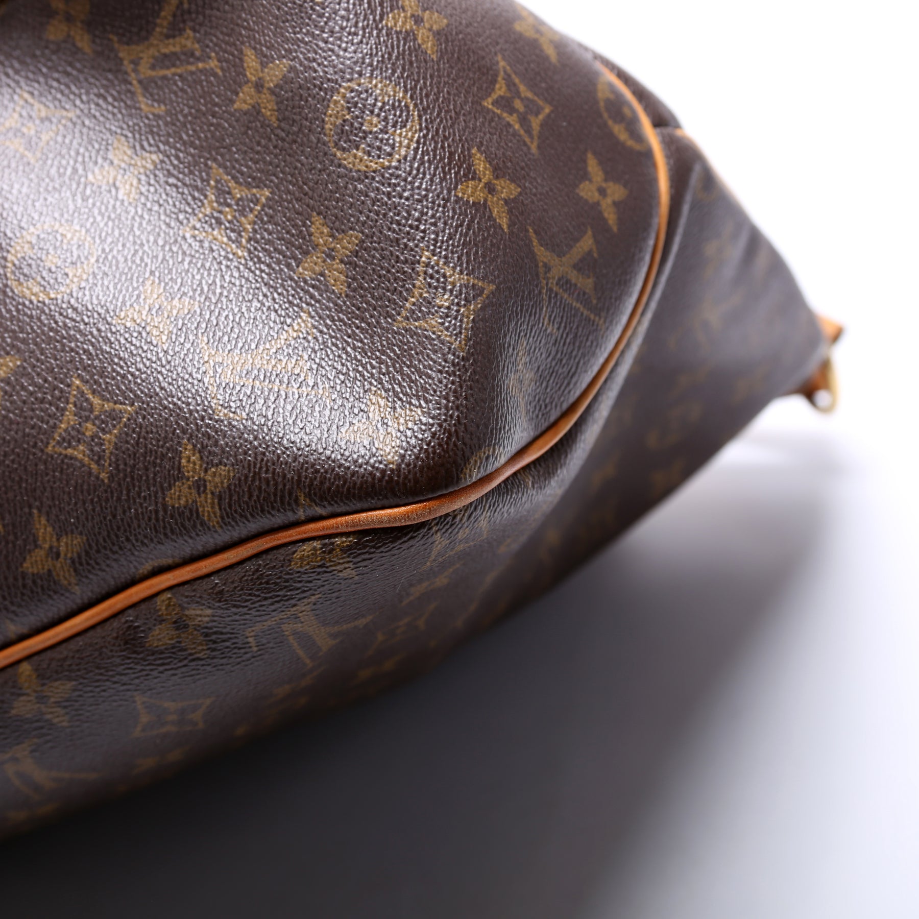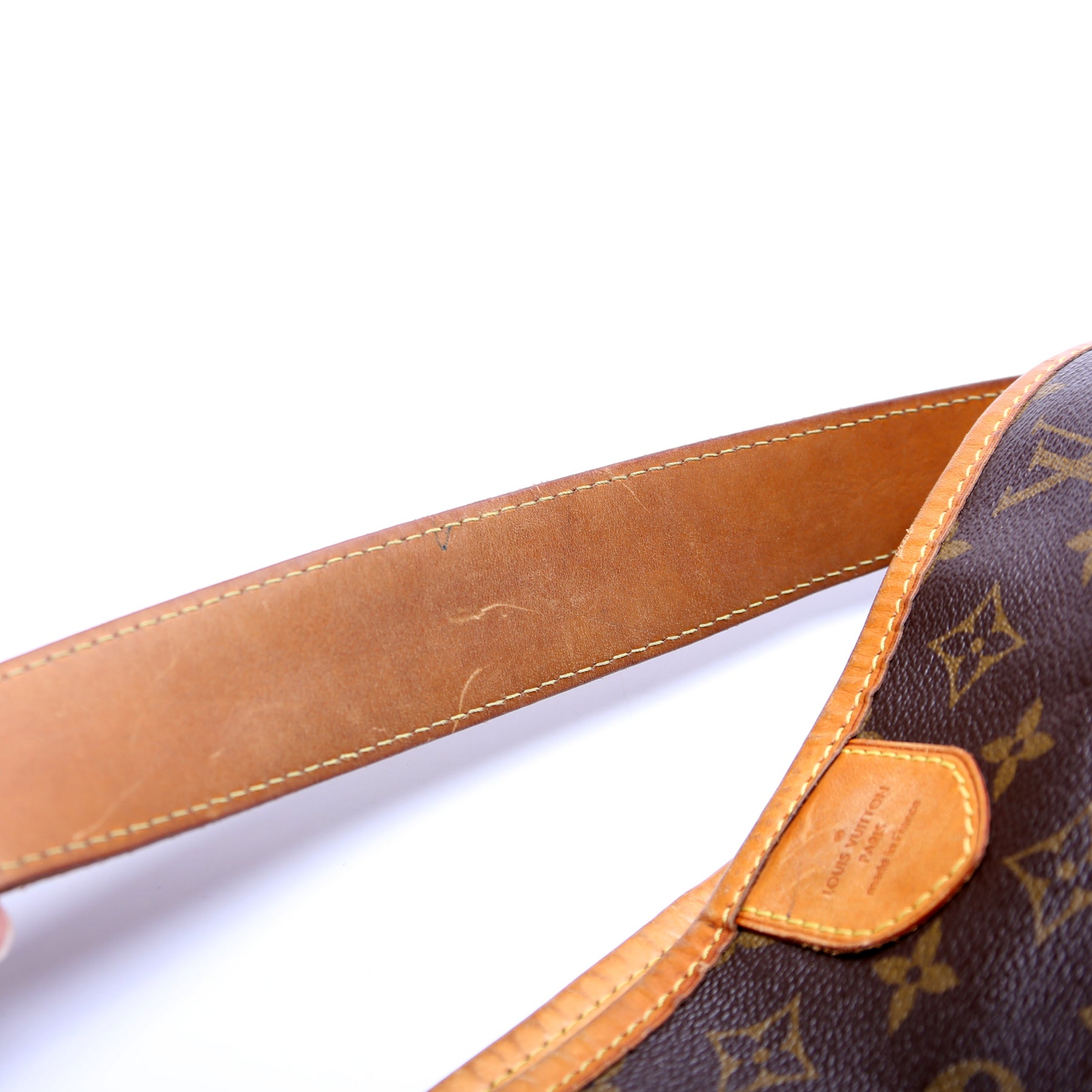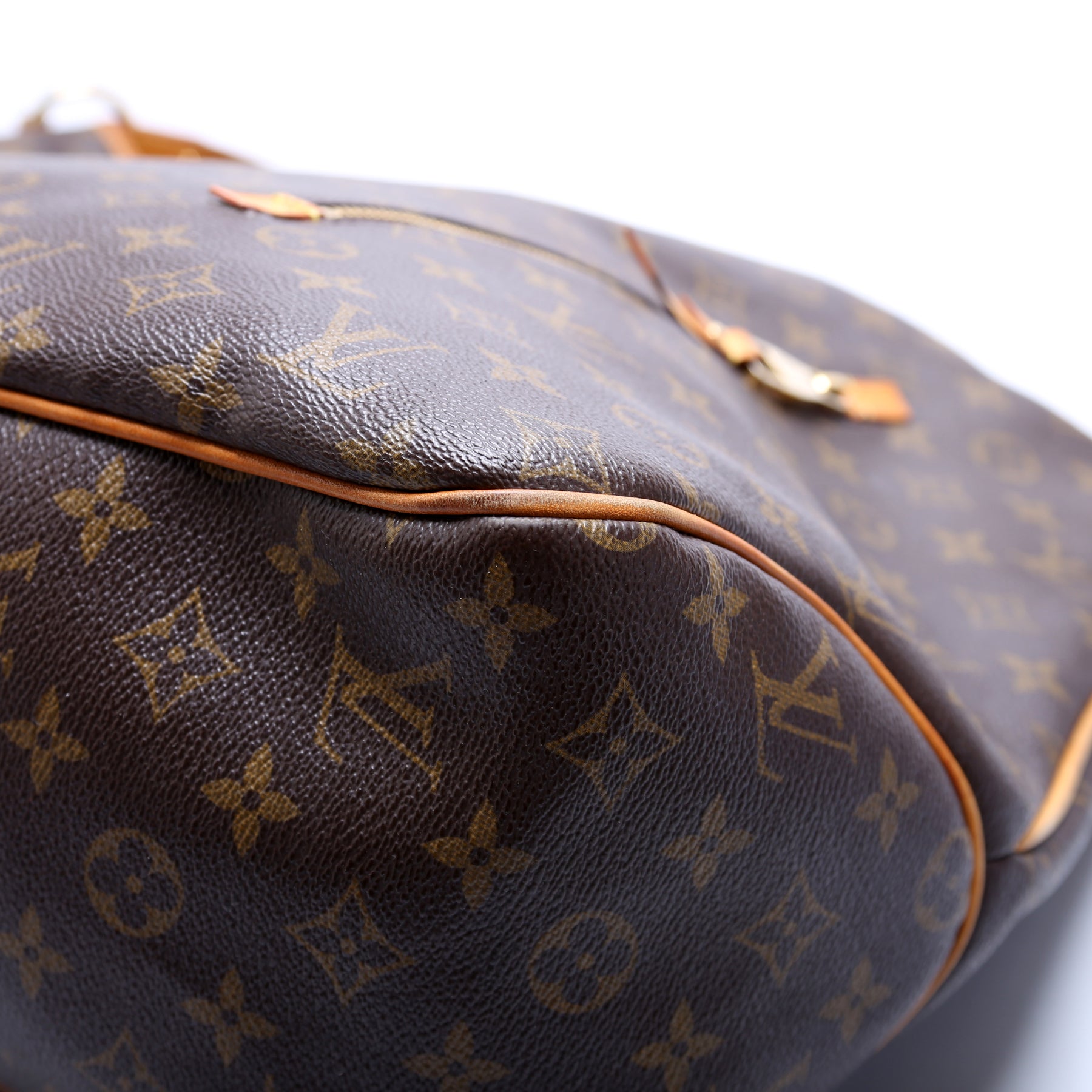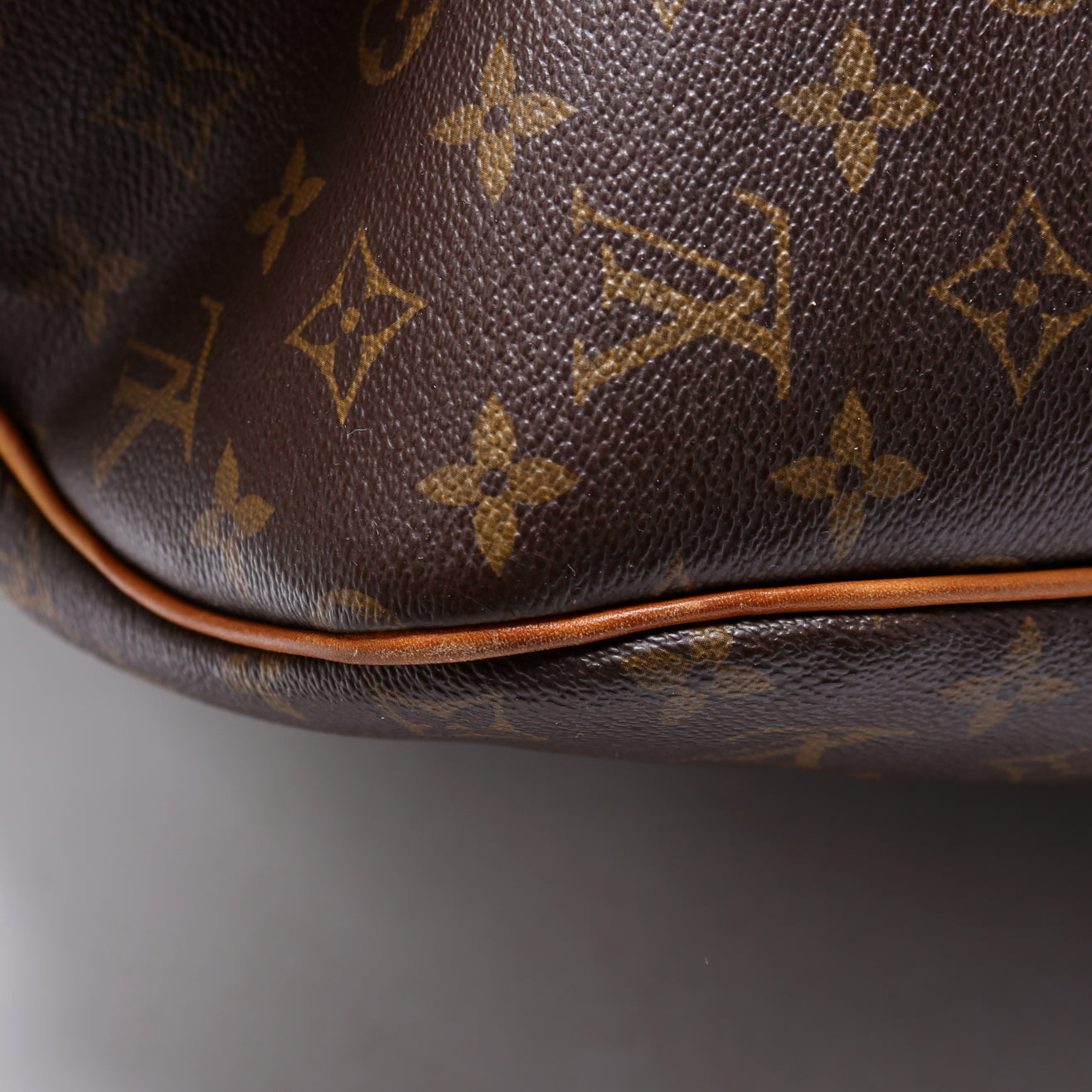 Exterior: The exterior Monogram coated canvas is free of any rips or cracks. The exterior features two zipper pockets. The leather trim shows minor wear.