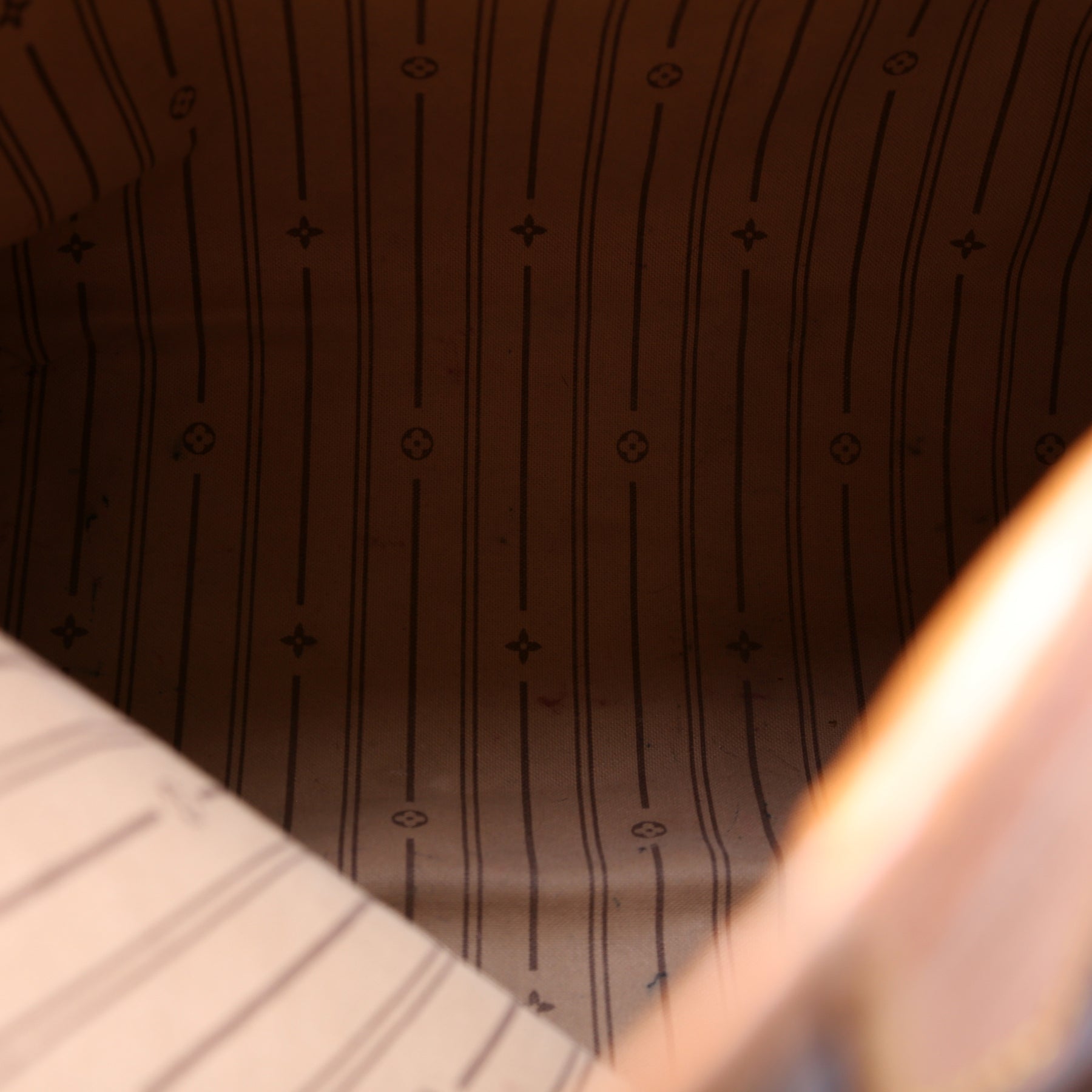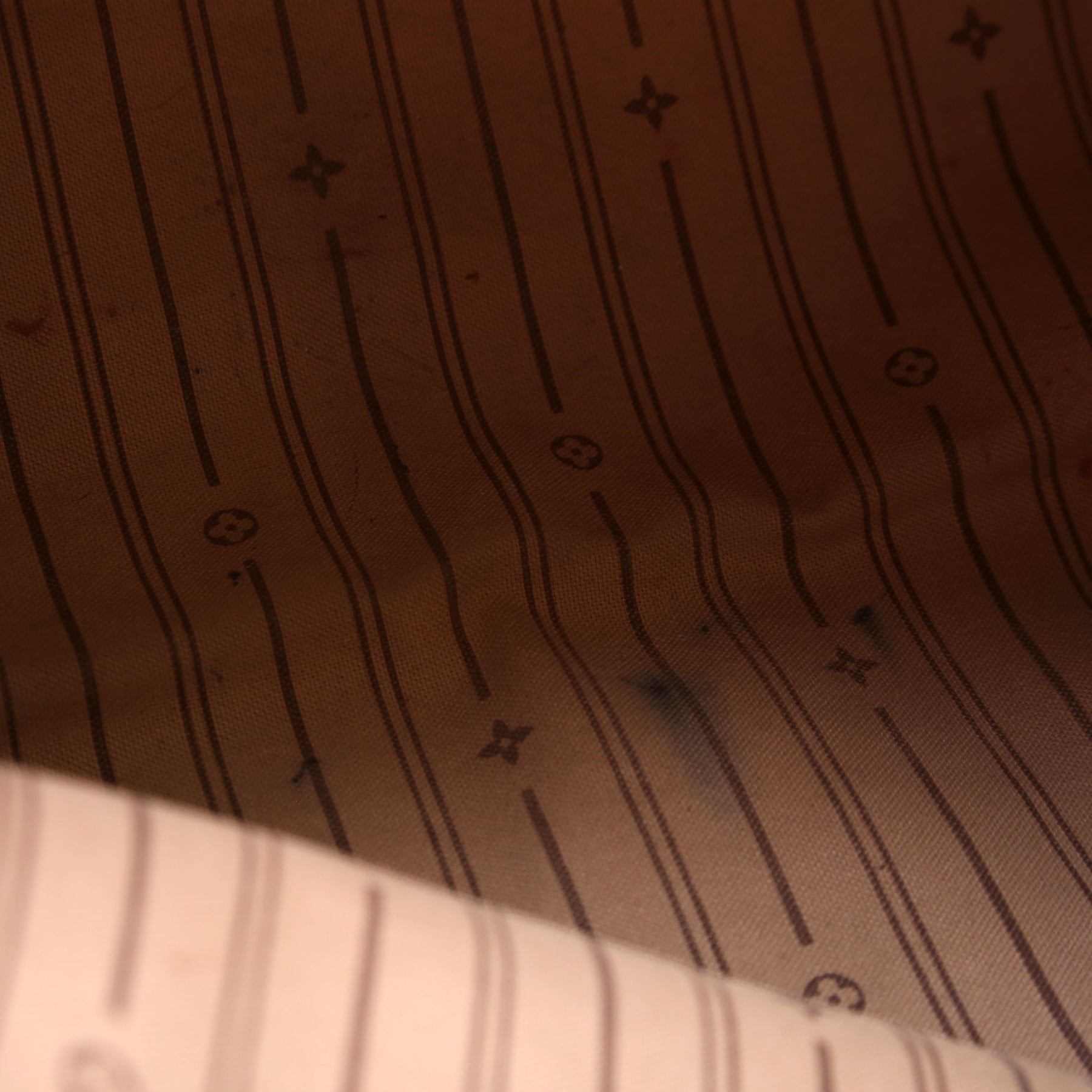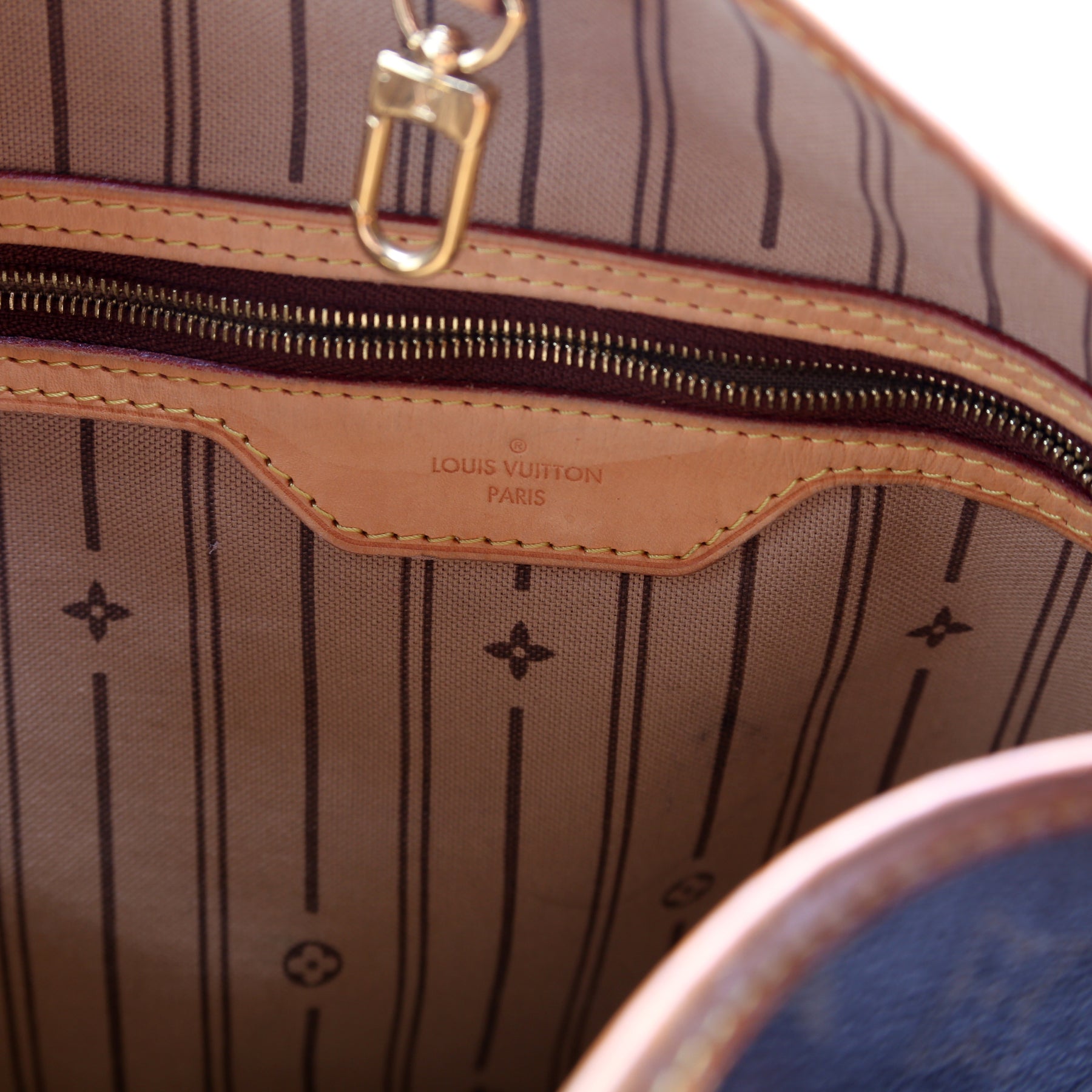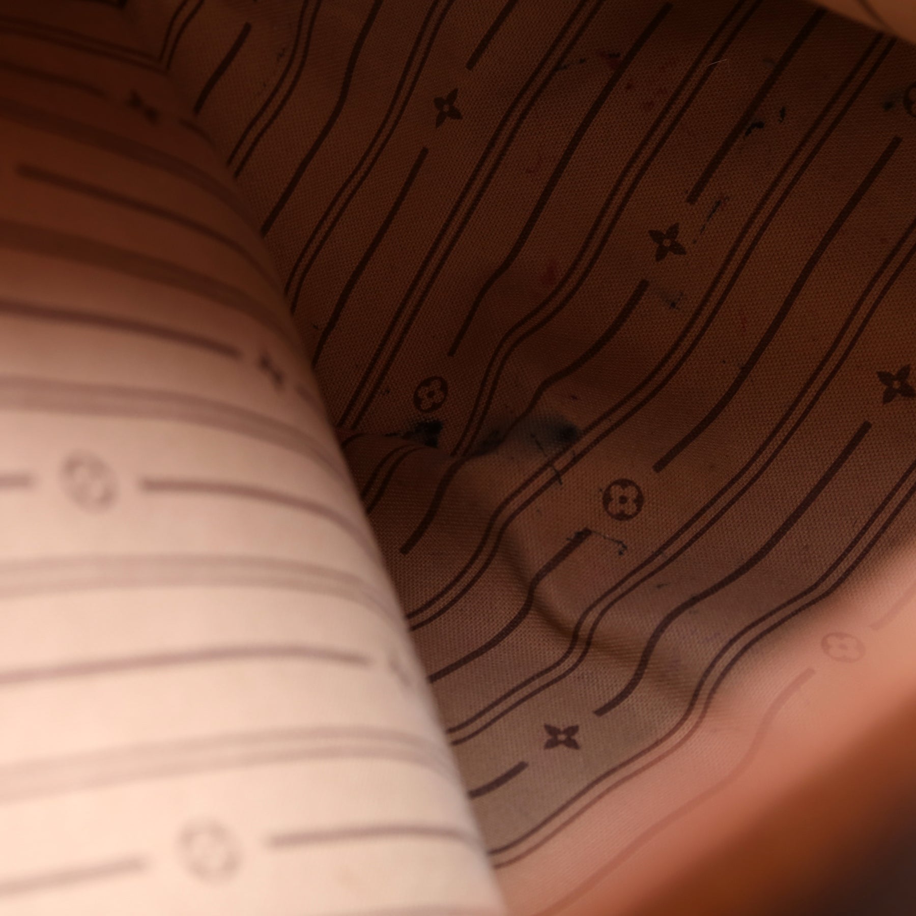 Interior: The interior has minor ink stains throughout. The interior features one zip closure pocket.