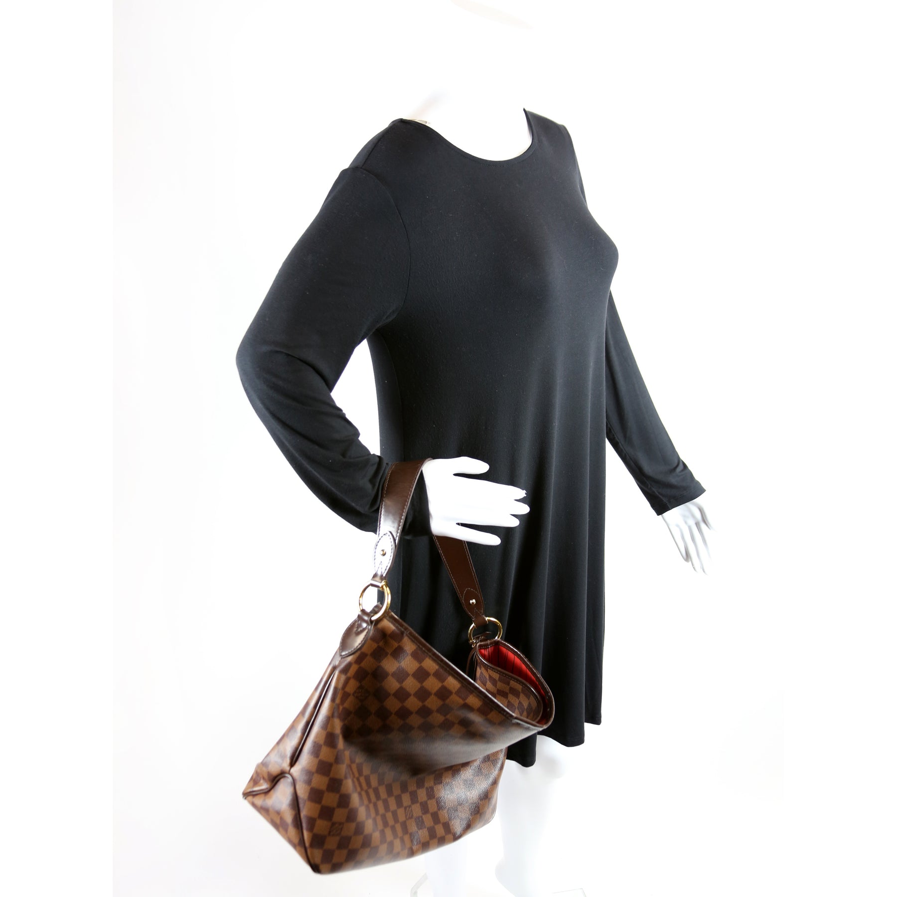This pre-owned Louis Vuitton Delightful MM is guaranteed 100% authentic. The exterior is in the classic Louis Vuitton Damier Ebene coated canvas.