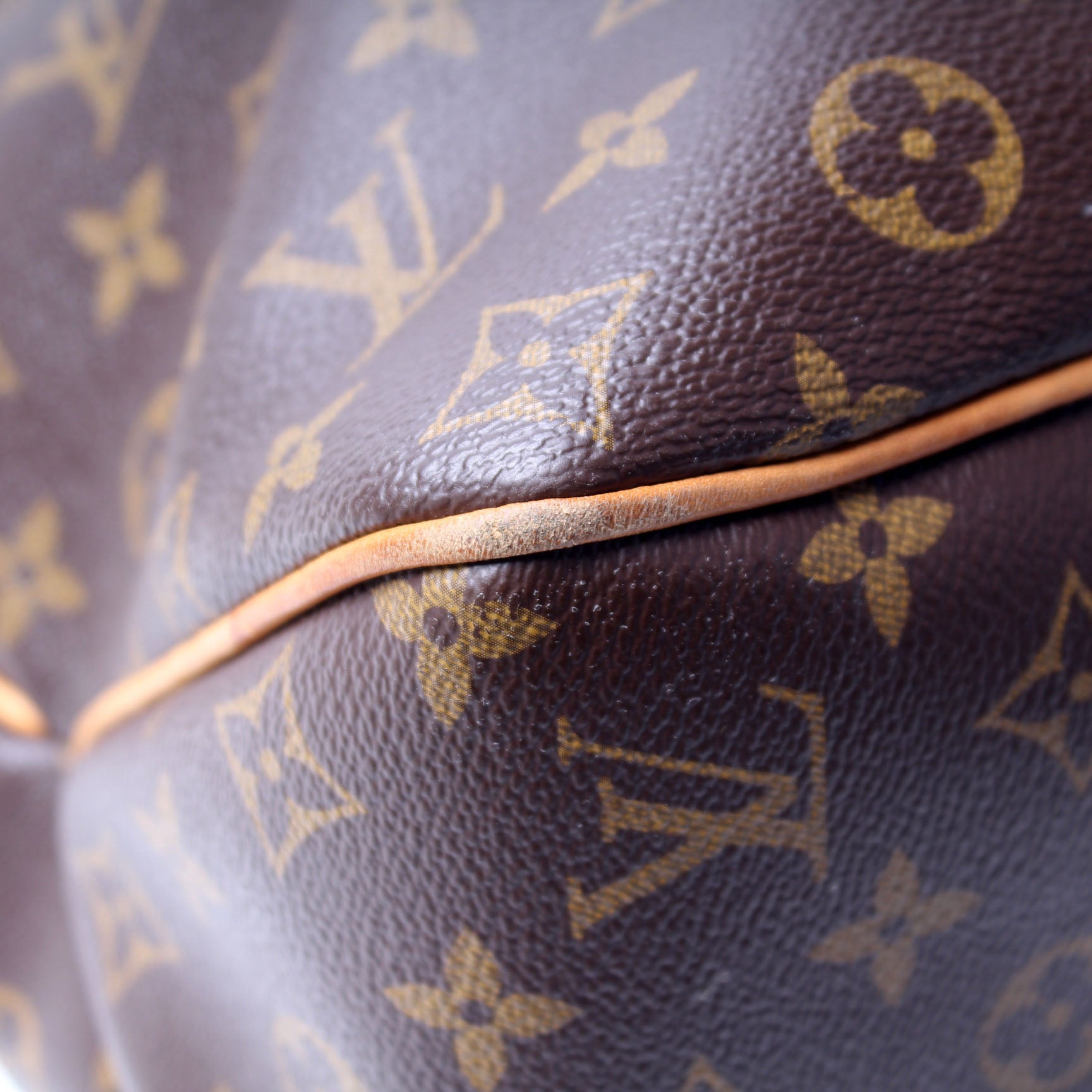 Exterior: The exterior coated canvas is free of any rips or cracks. The corners and leather trim show signs of wear. The canvas is peeling.