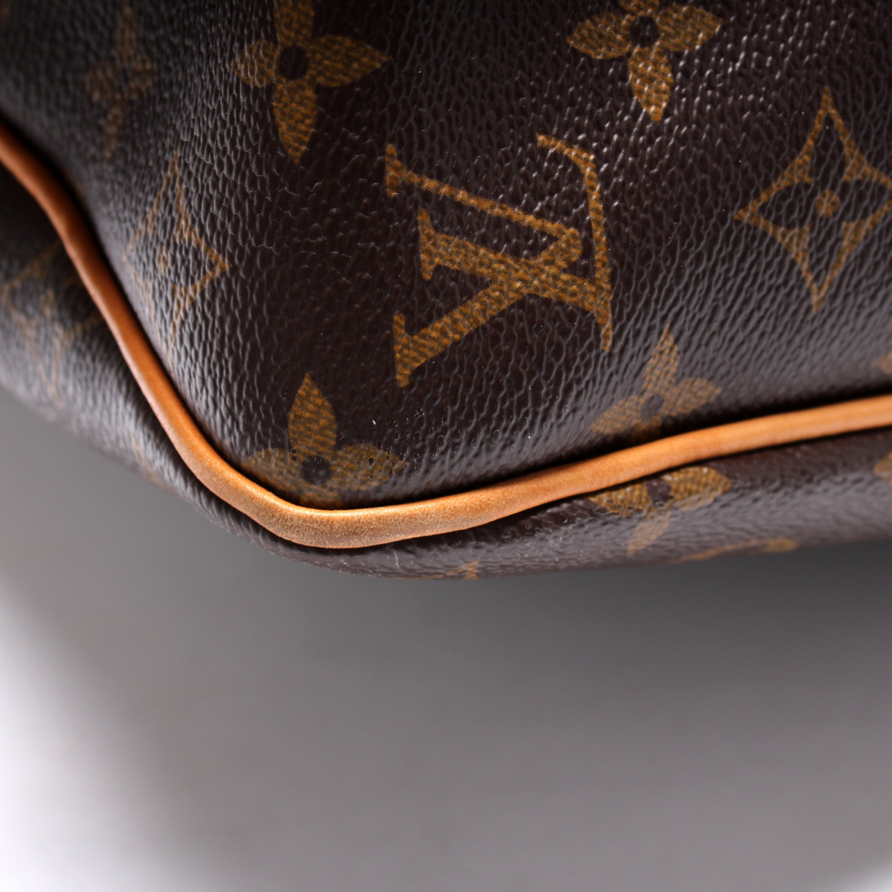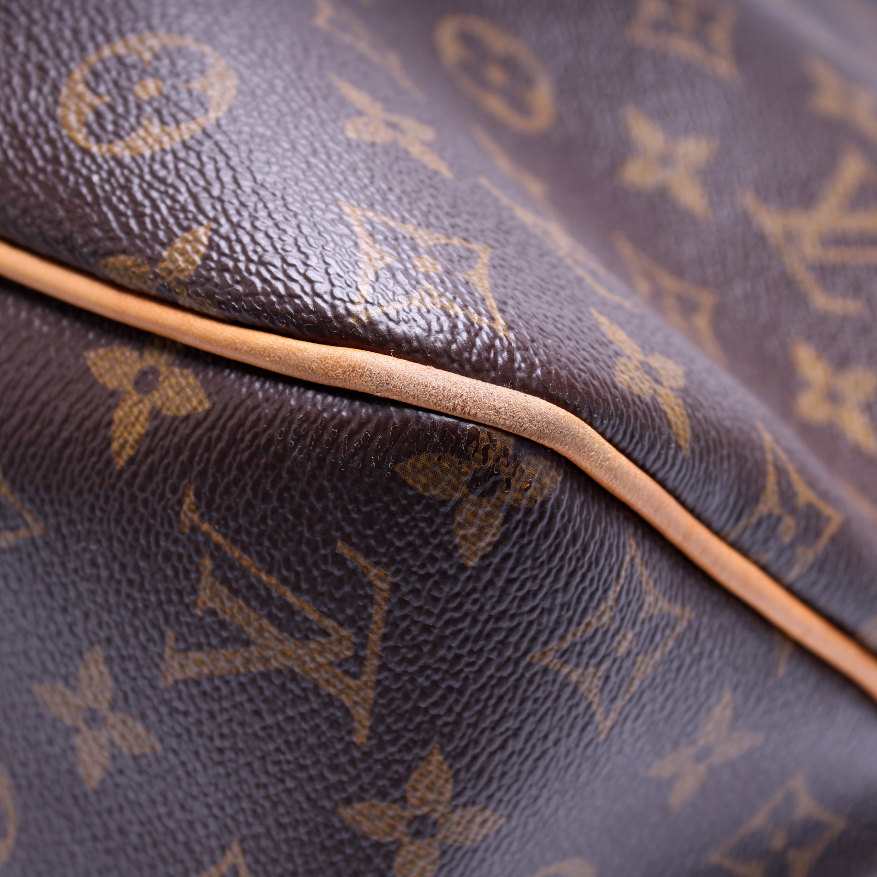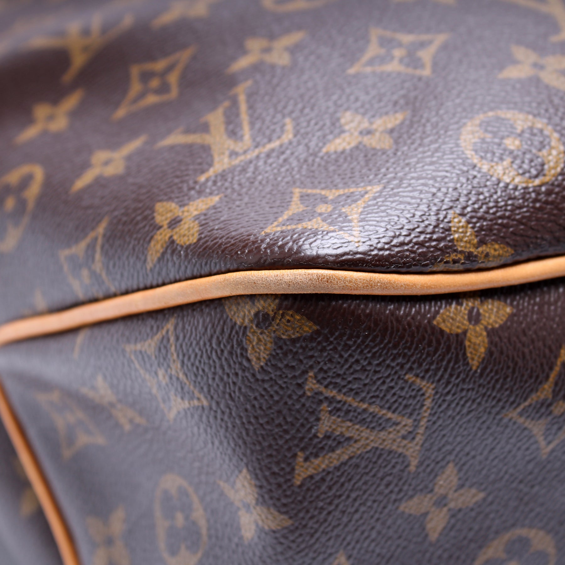 Exterior: The exterior coated canvas is free of any rips or cracks. The leather trim and corners show signs of wear and discoloration.