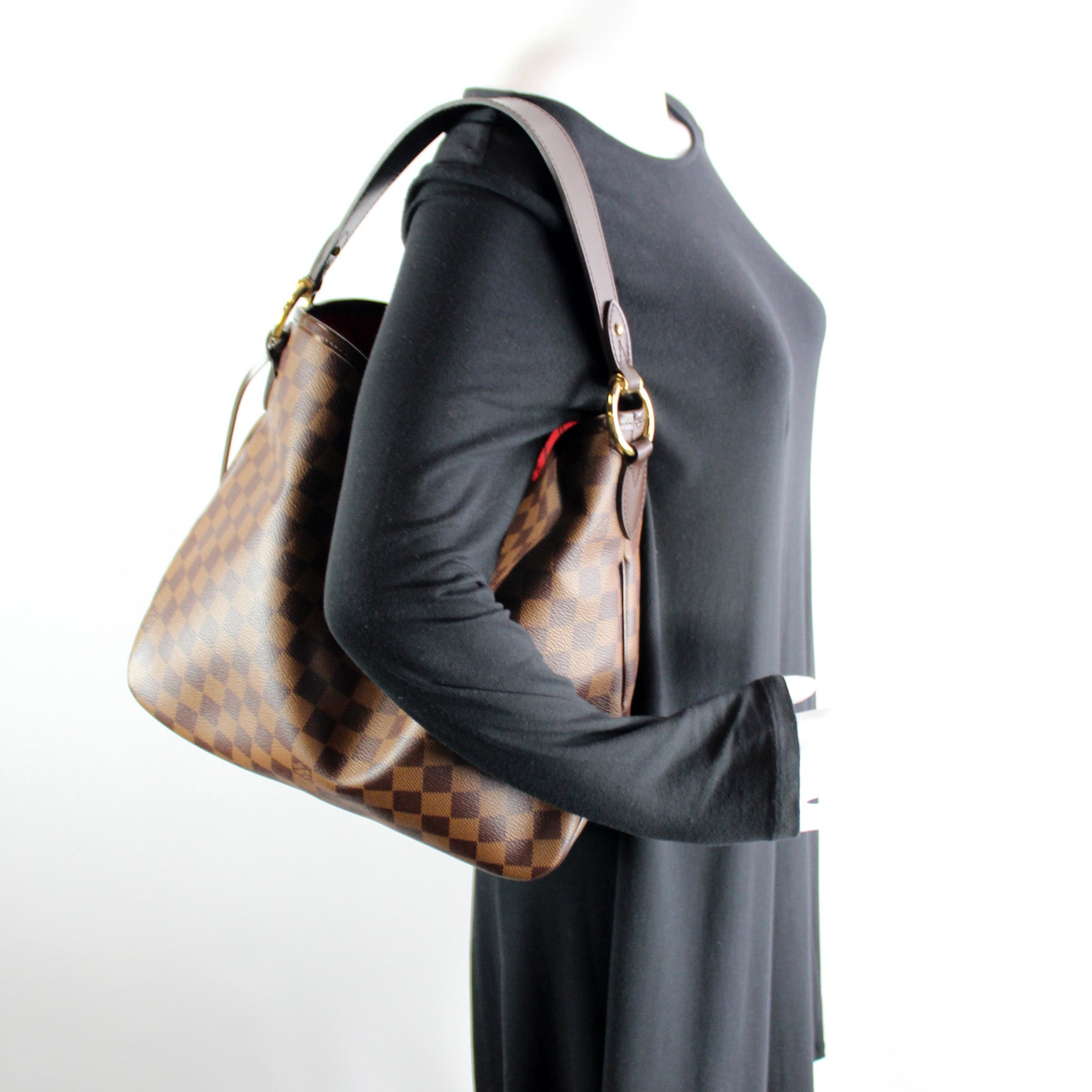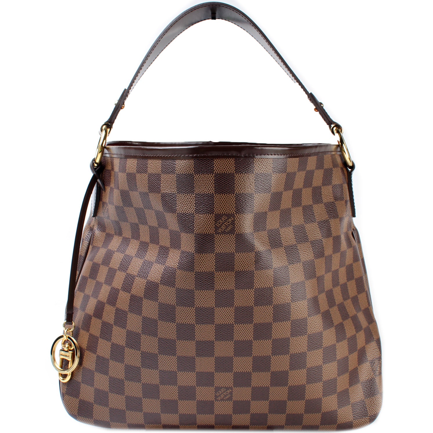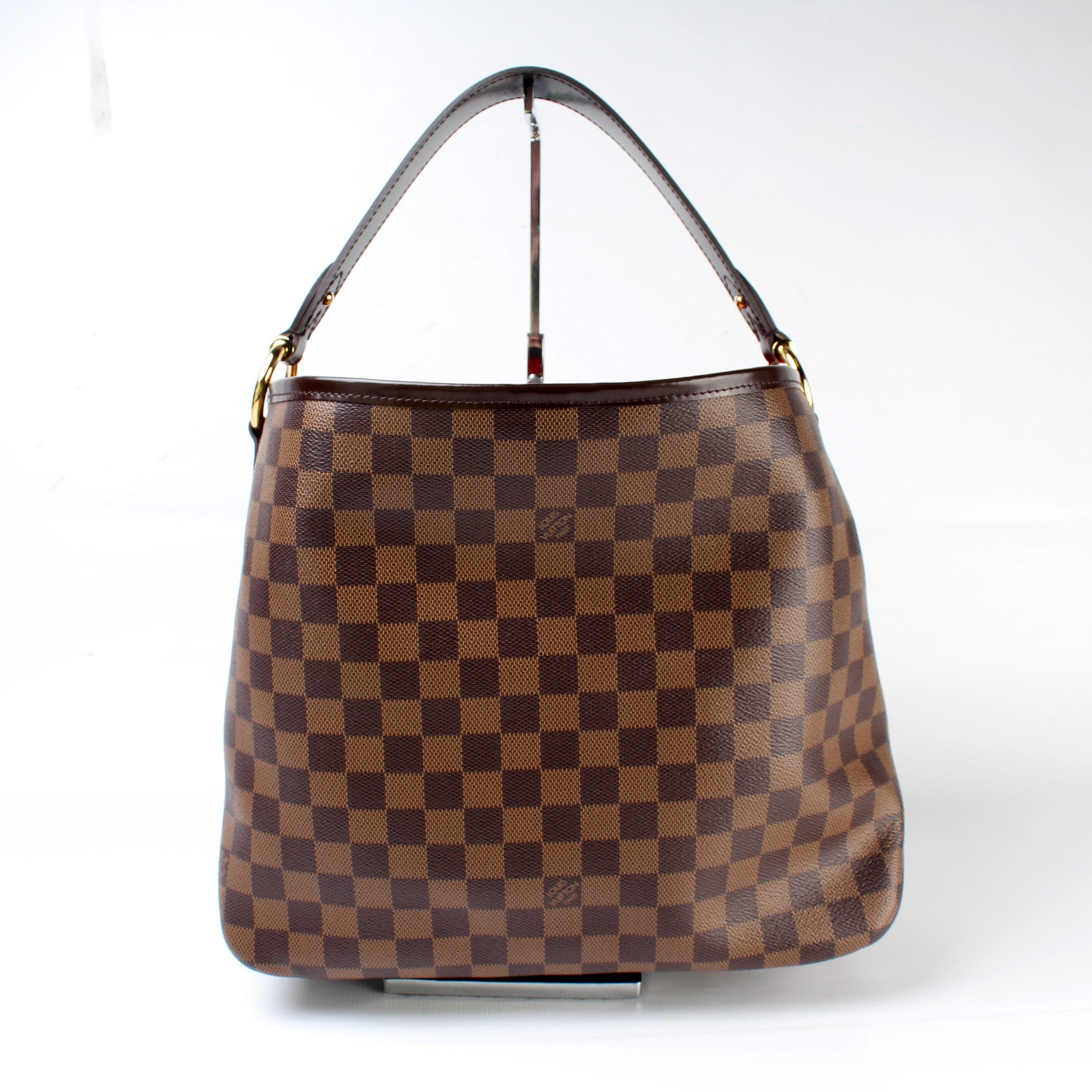 This pre-owned Louis Vuitton Delightful PM is guaranteed 100% authentic. The exterior is in the classic Louis Vuitton Damier Ebene coated canvas.