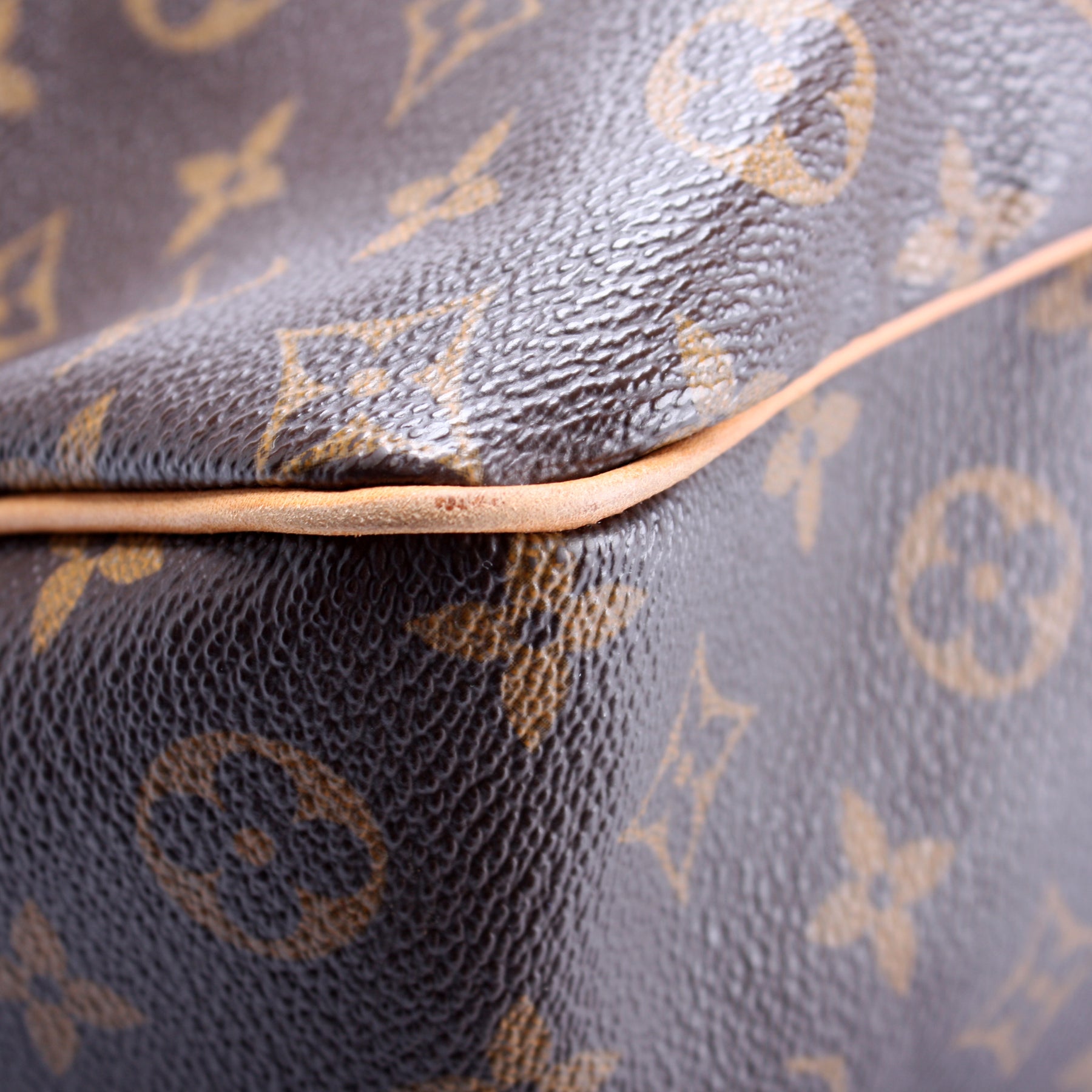 Exterior: The exterior canvas is free of any rips or cracks. The corners show signs of wear as pictured. The leather trim shows discoloration and water stains throughout.