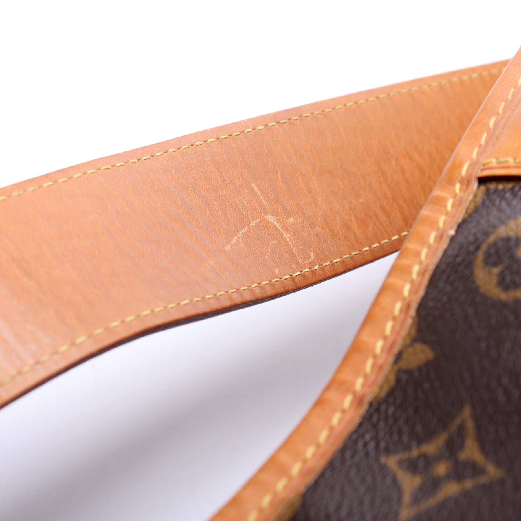 Handle: The leather handle shows discoloration and staining throughout.