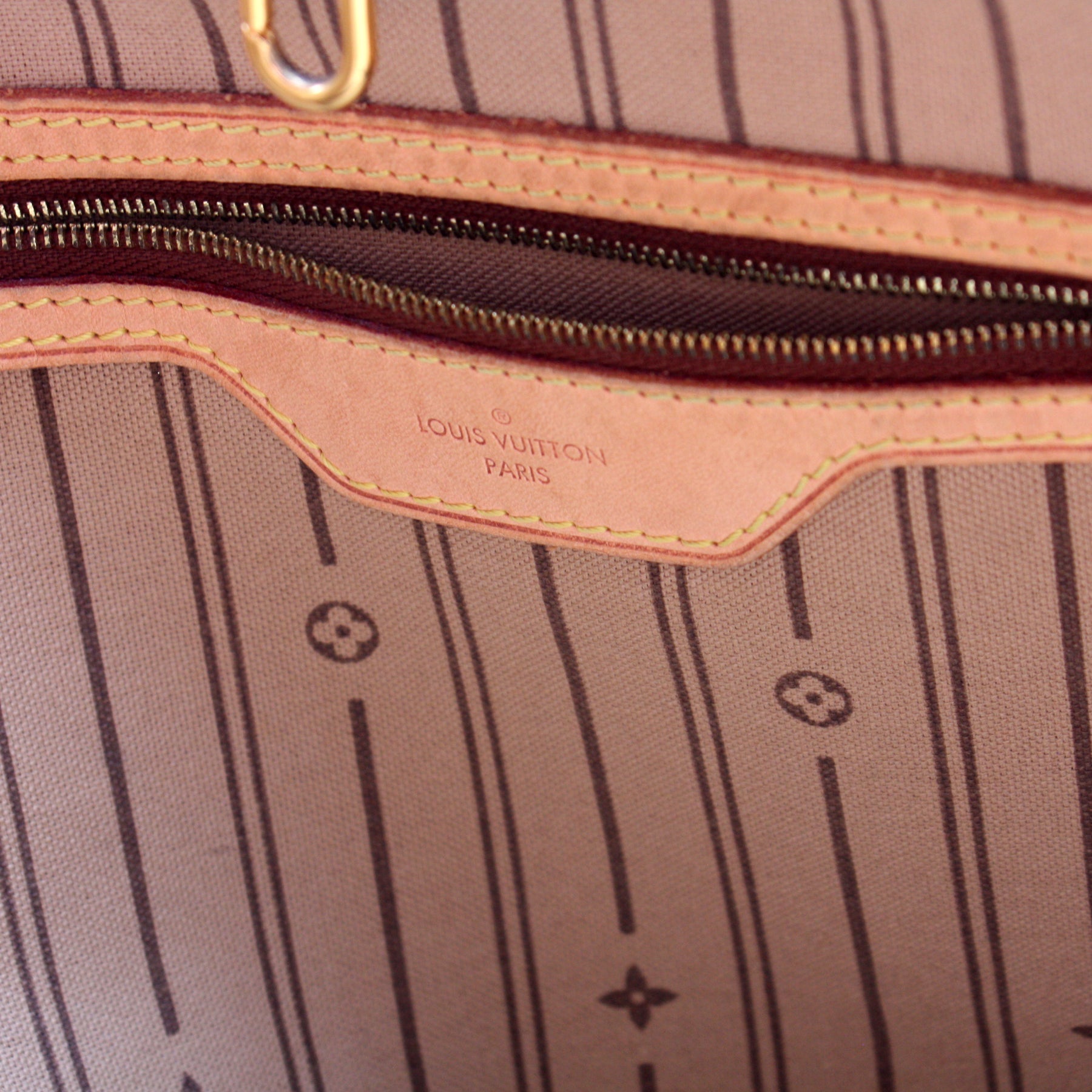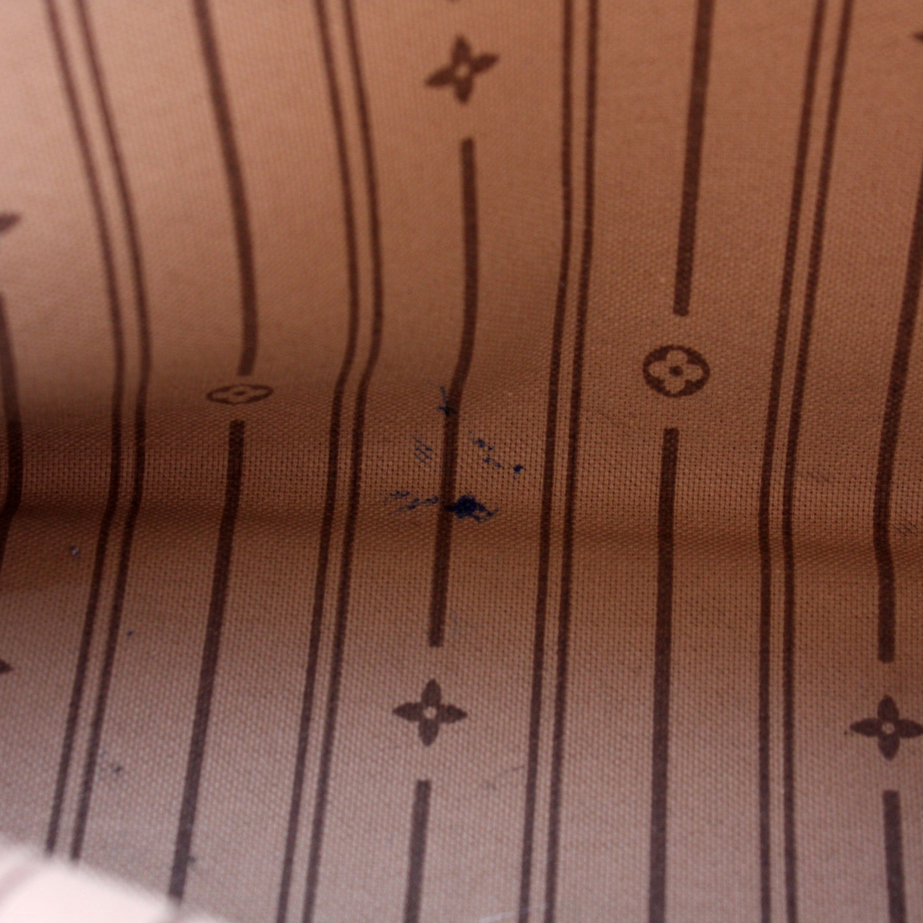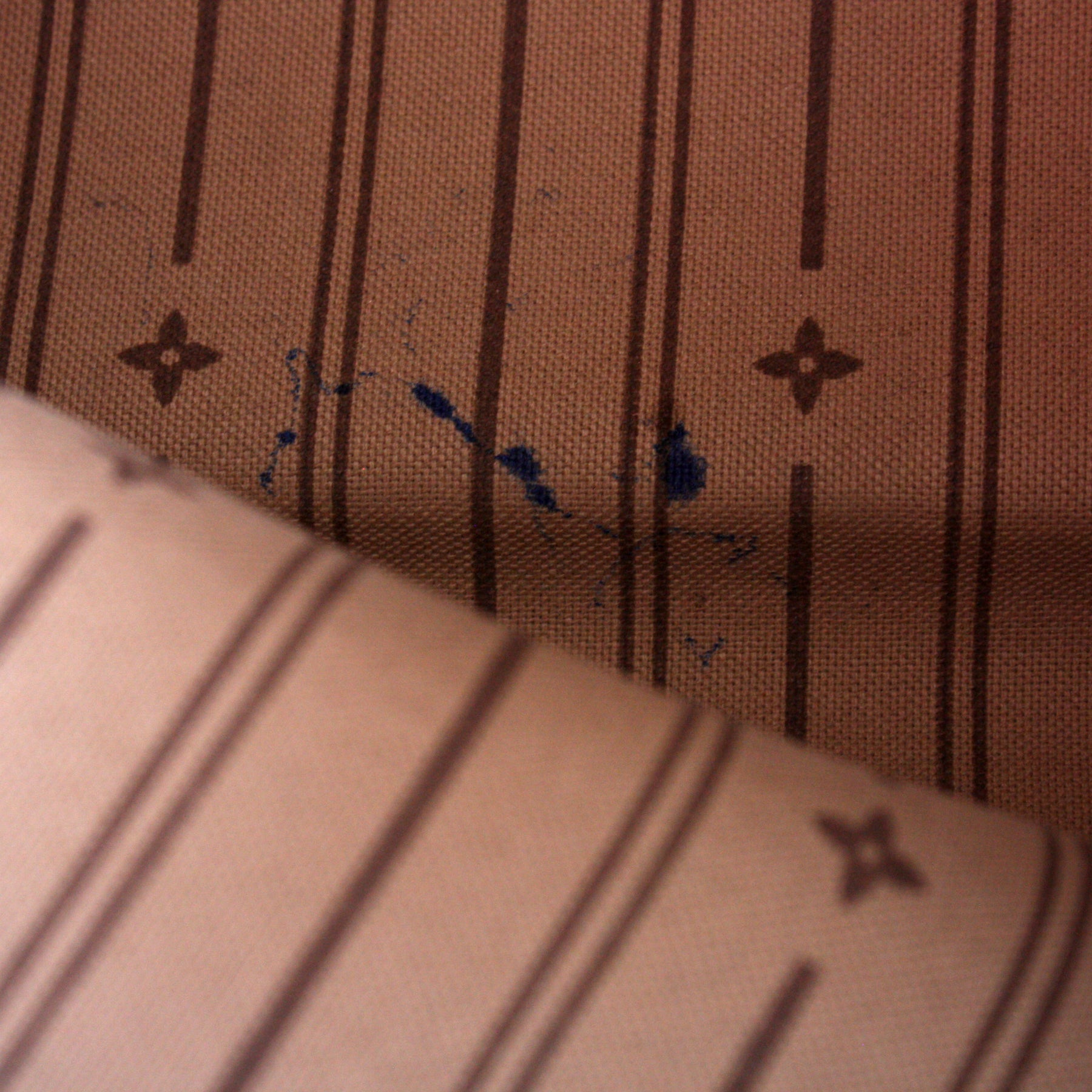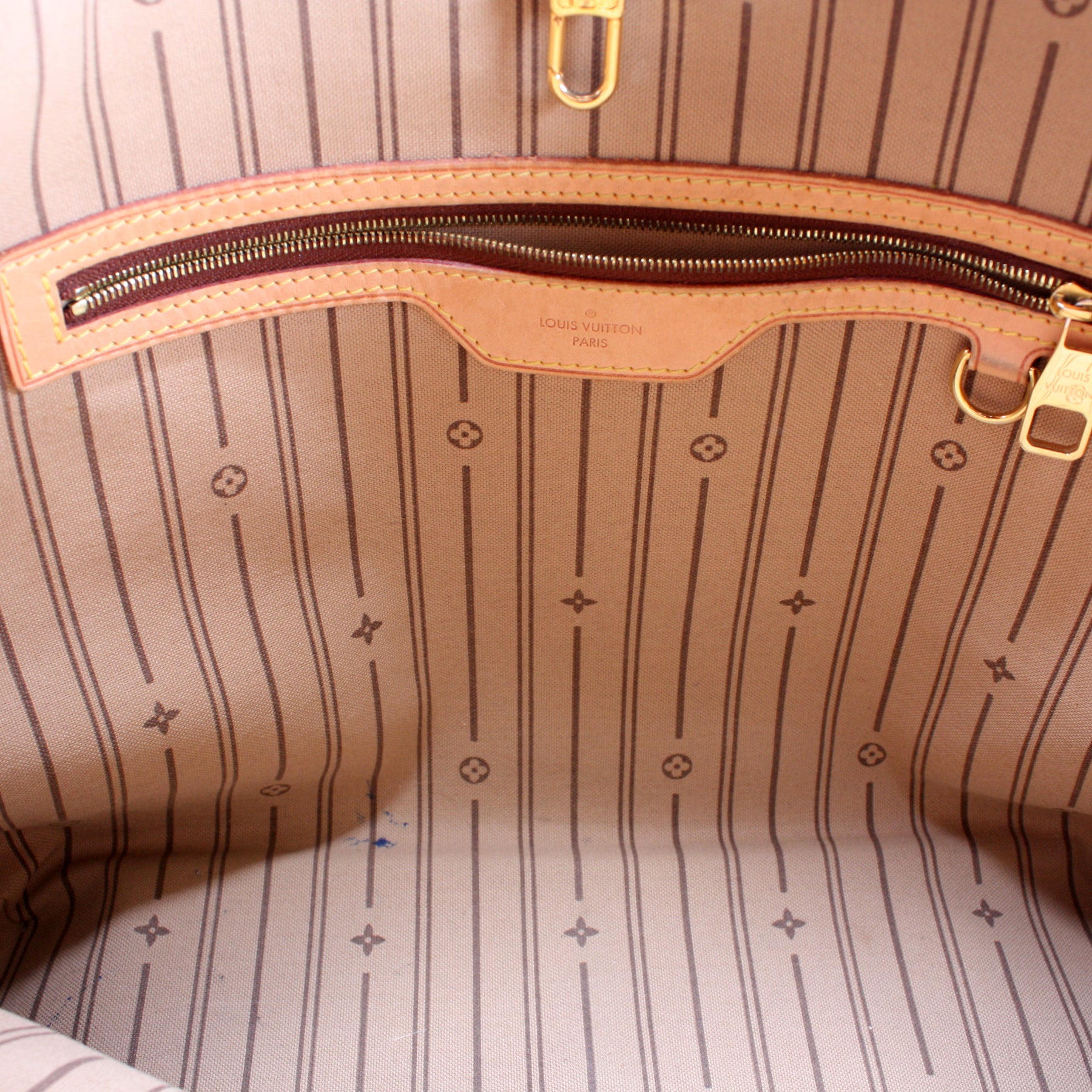 Interior: The interior shows minor staining throughout, and features one zip pocket.