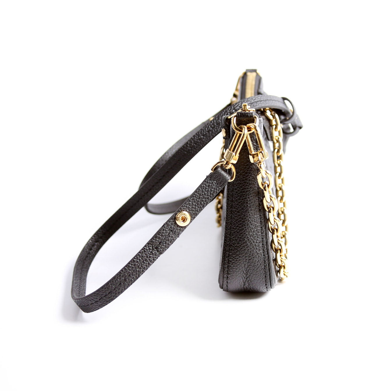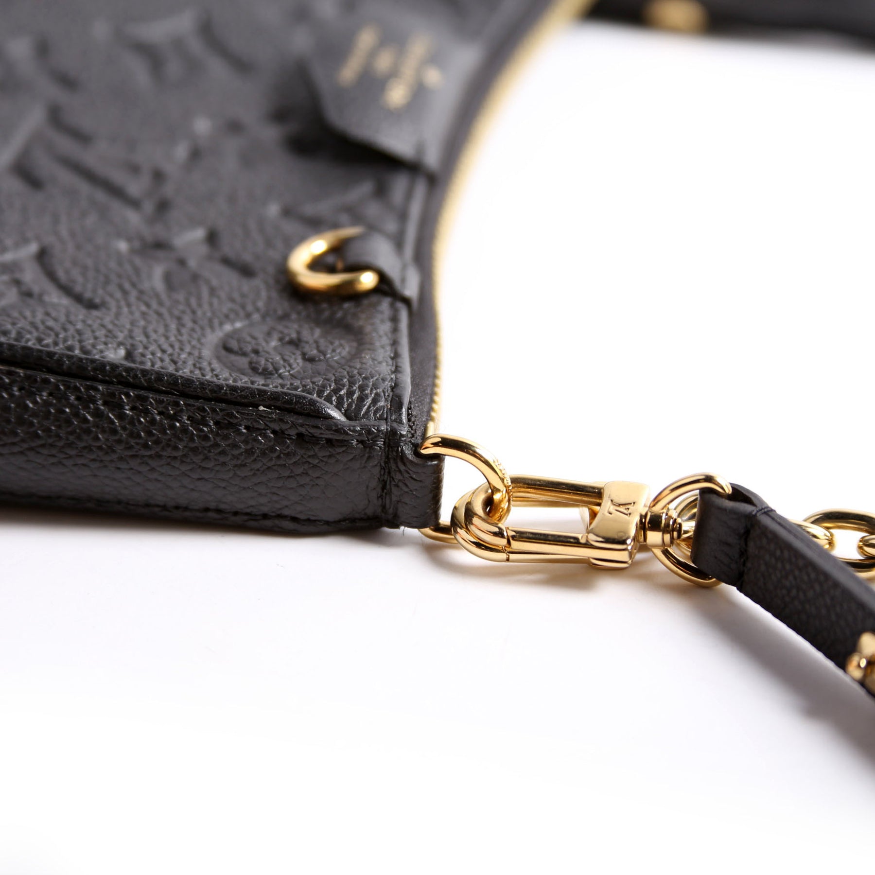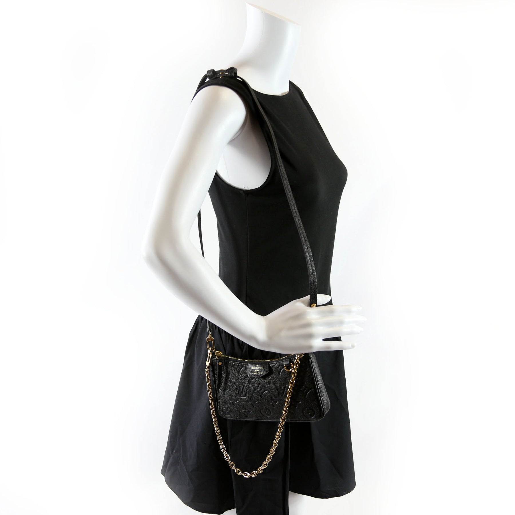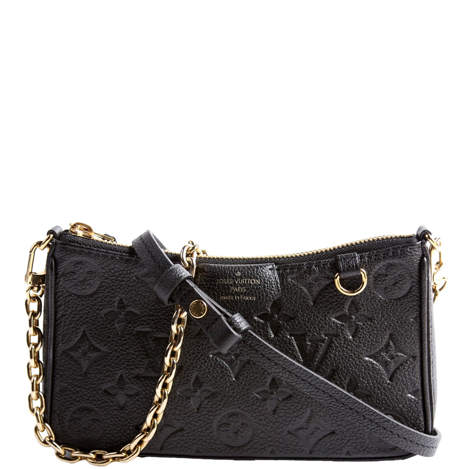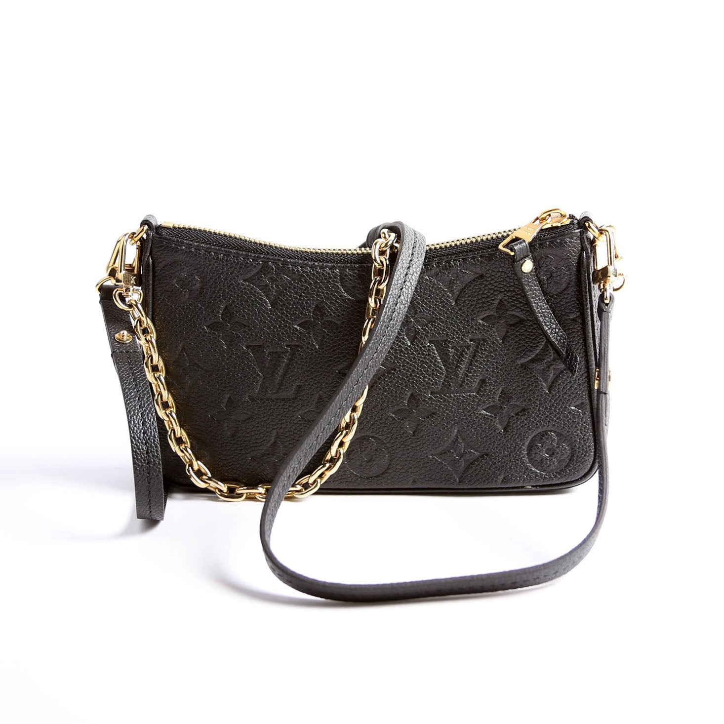 This pre-owned Louis Vuitton Easy Pouch On Strap is guaranteed 100% authentic. The exterior is in the classic Louis Vuitton Empreinte Leather.