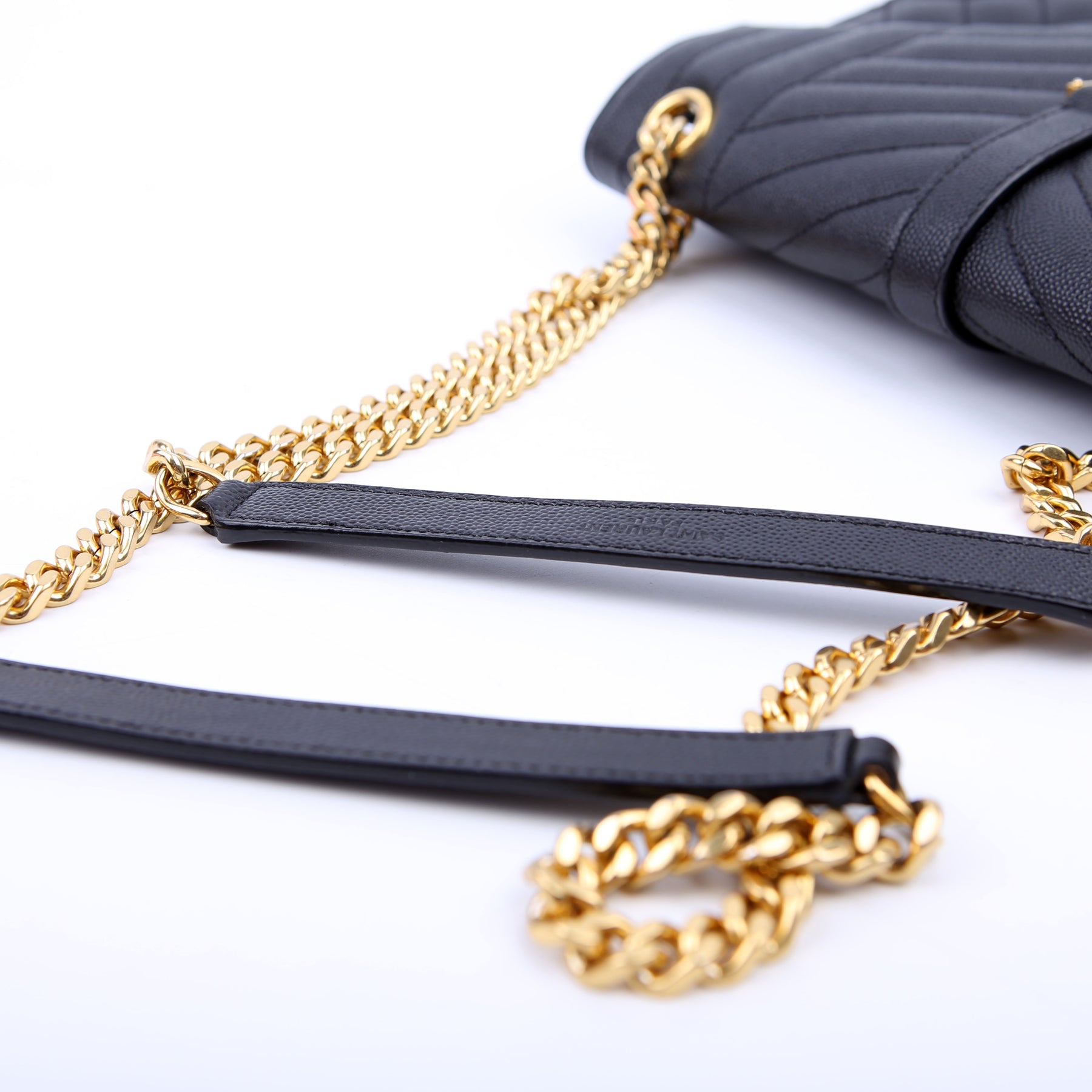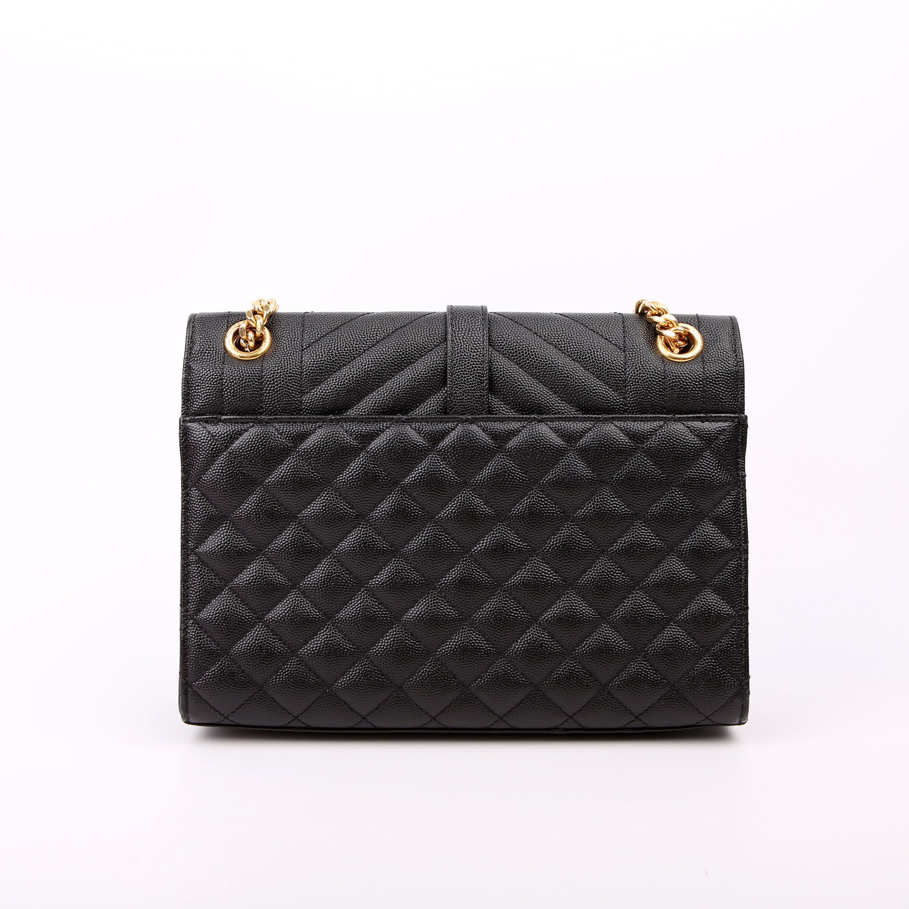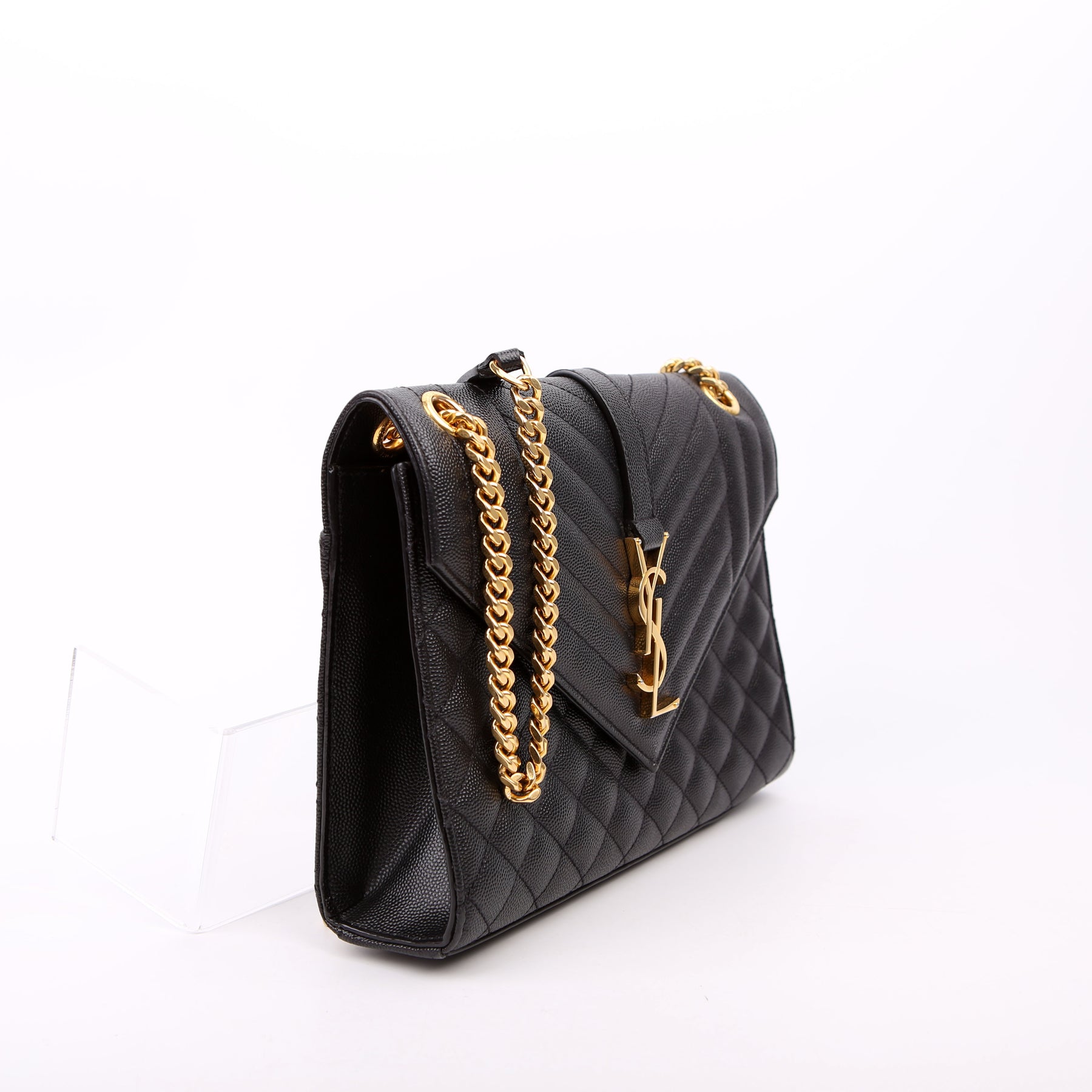 This pre-owned Saint Laurent Envelope Medium Tri-Quilted Bag is guaranteed 100% authentic. The exterior is in the classic Saint Laurent Quilted Leather.