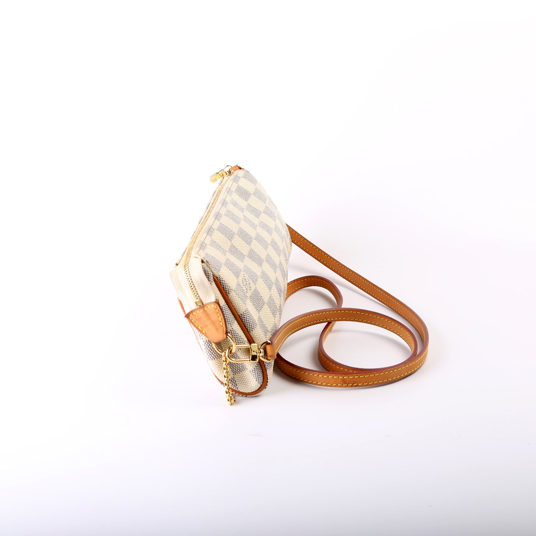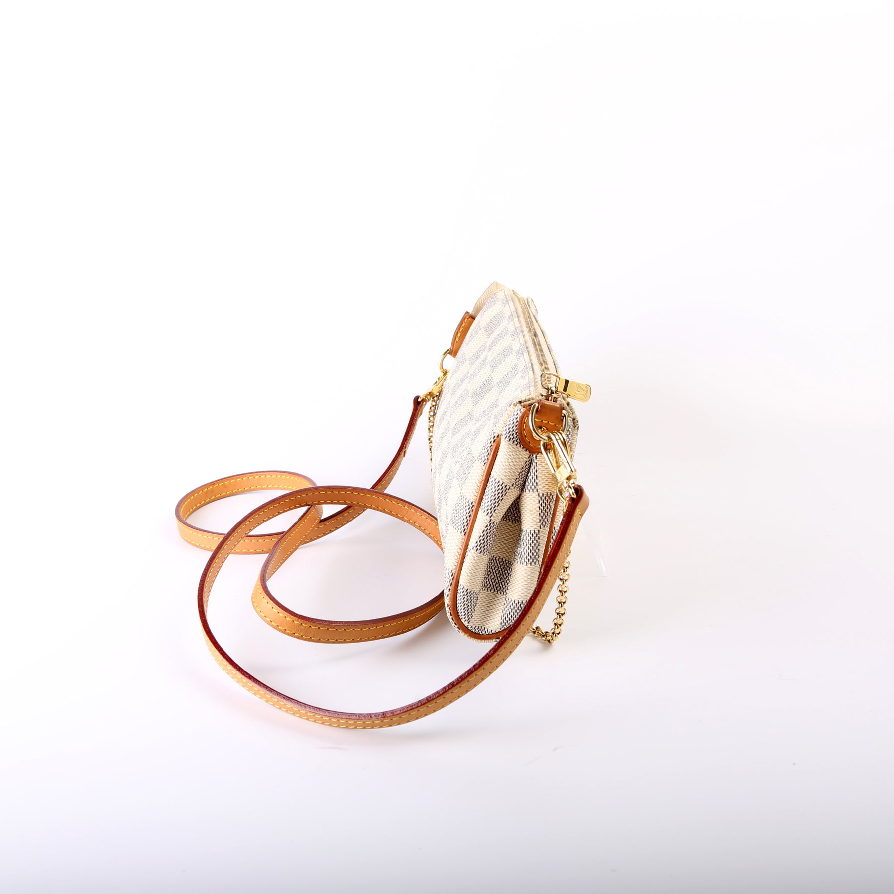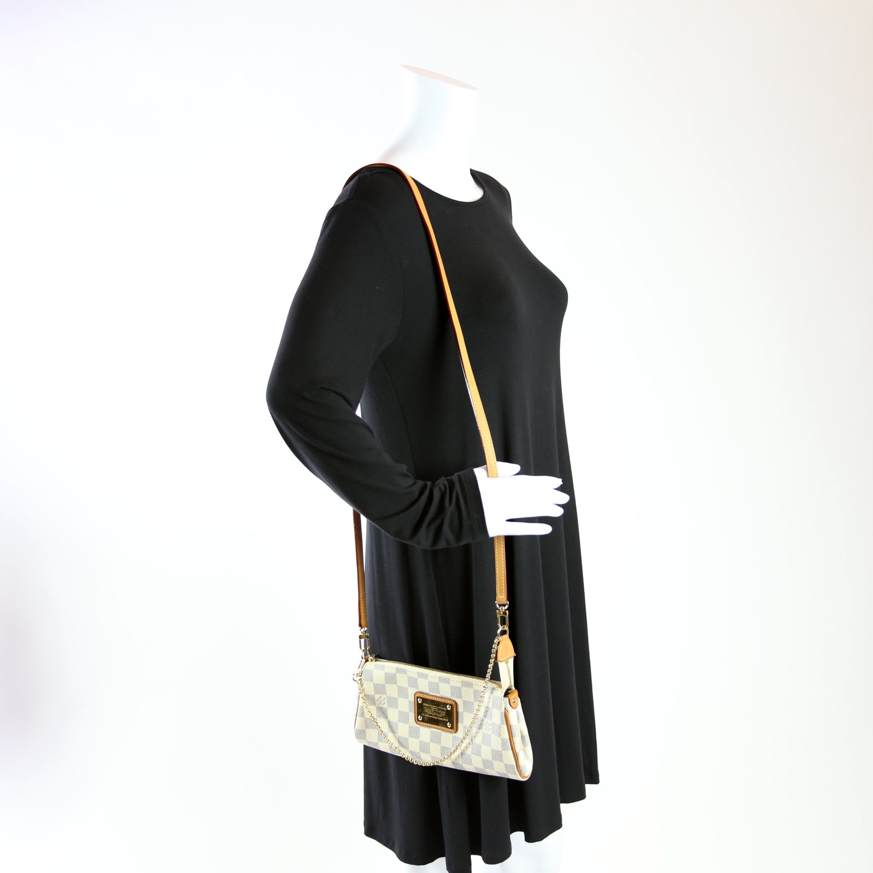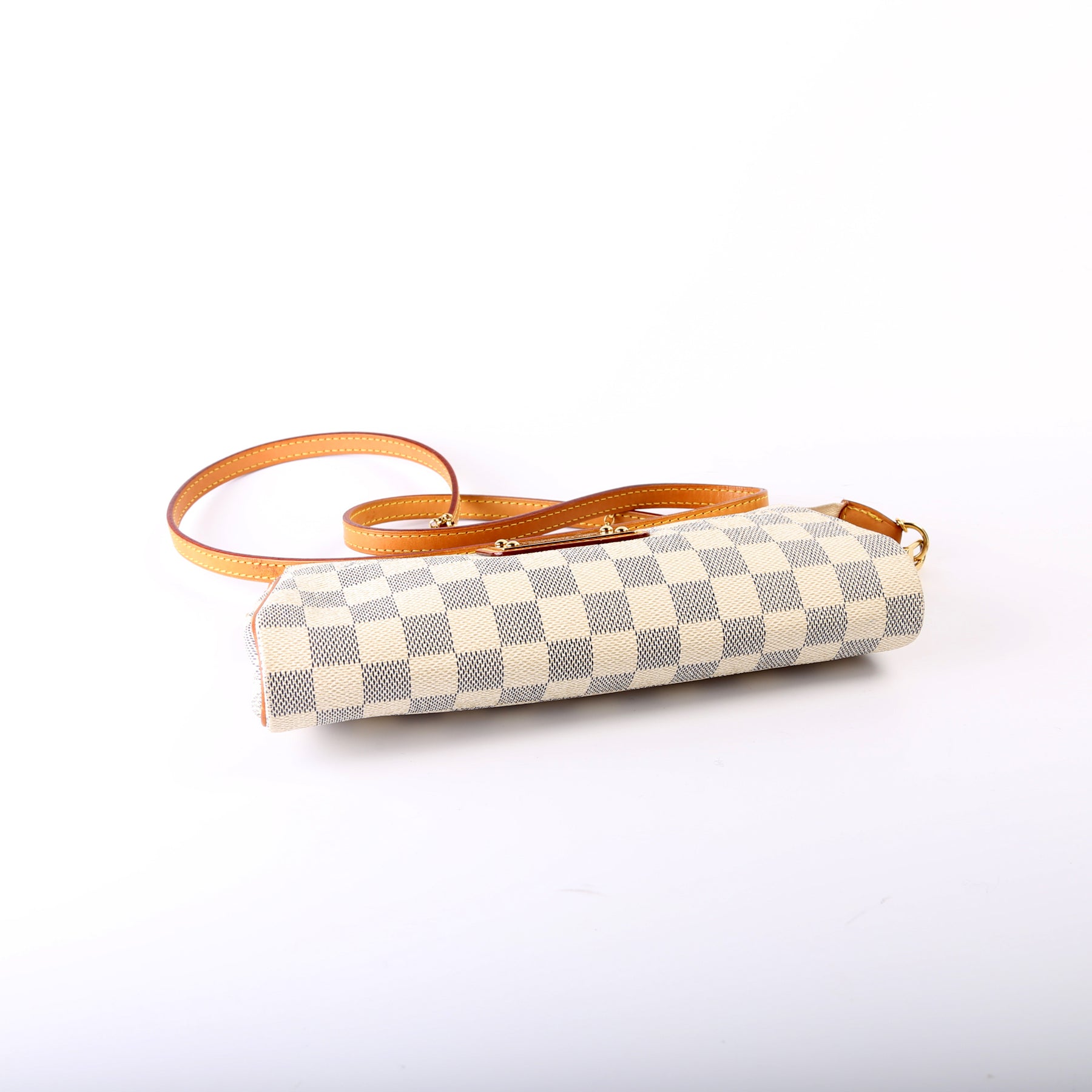 This pre-owned Louis Vuitton Eva Clutch is guaranteed 100% authentic. The exterior is in the classic Louis Vuitton Damier Azur coated canvas.