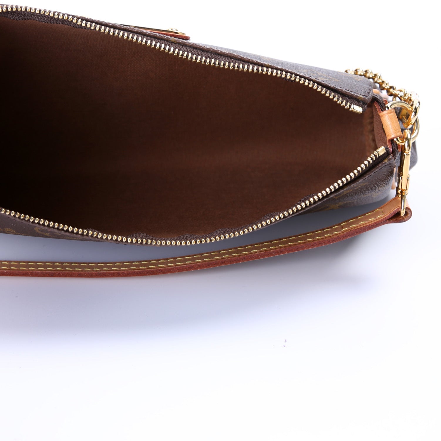 This pre-owned Louis Vuitton Eva Clutch is guaranteed 100% authentic. The exterior is in the classic Monogram coated canvas.