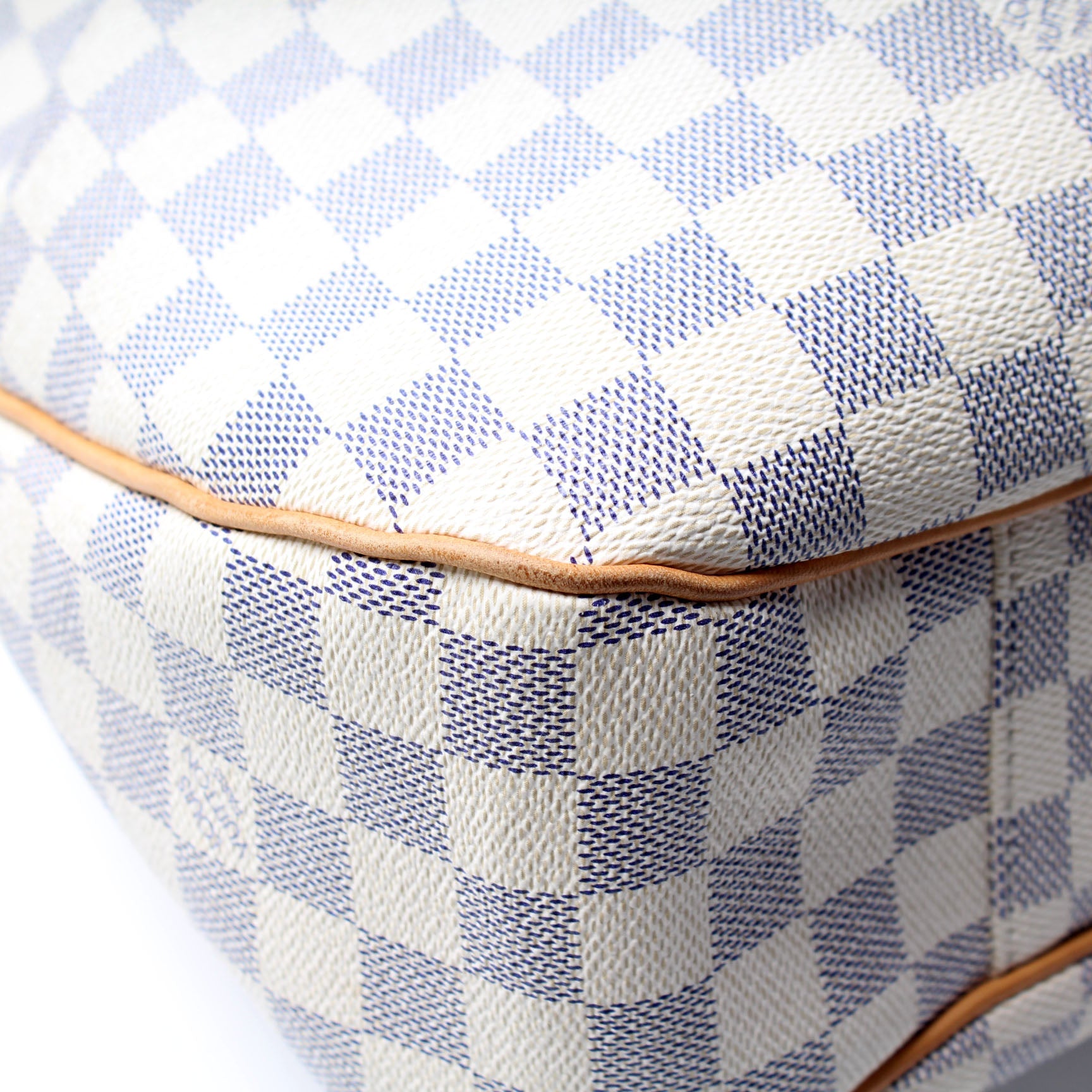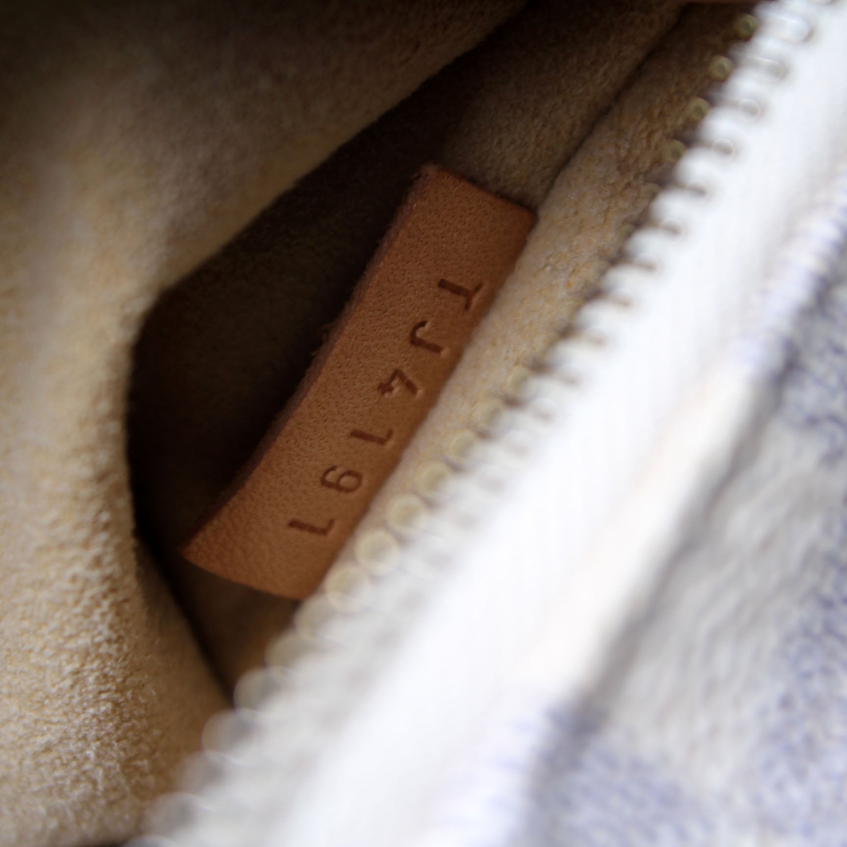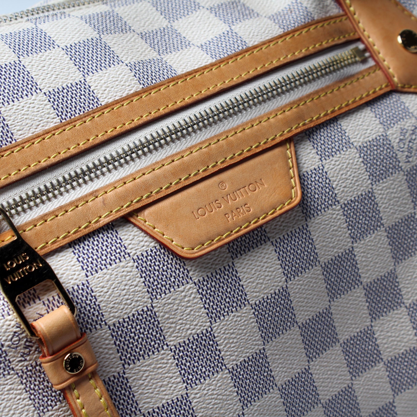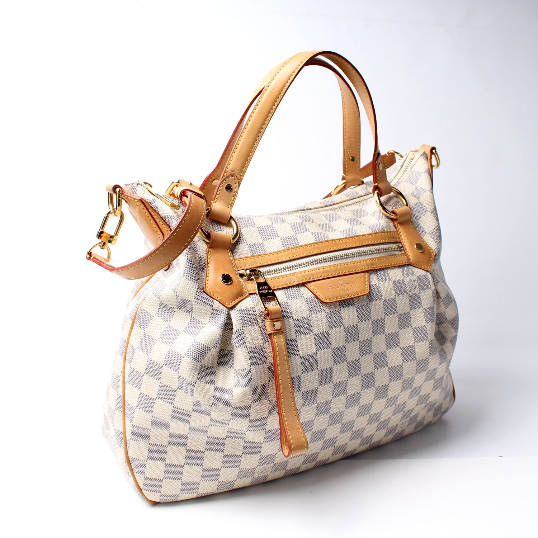 This pre-owned Louis Vuitton Evora MM is guaranteed 100% authentic. The exterior is in the classic Louis Vuitton Damier Azur coated canvas.