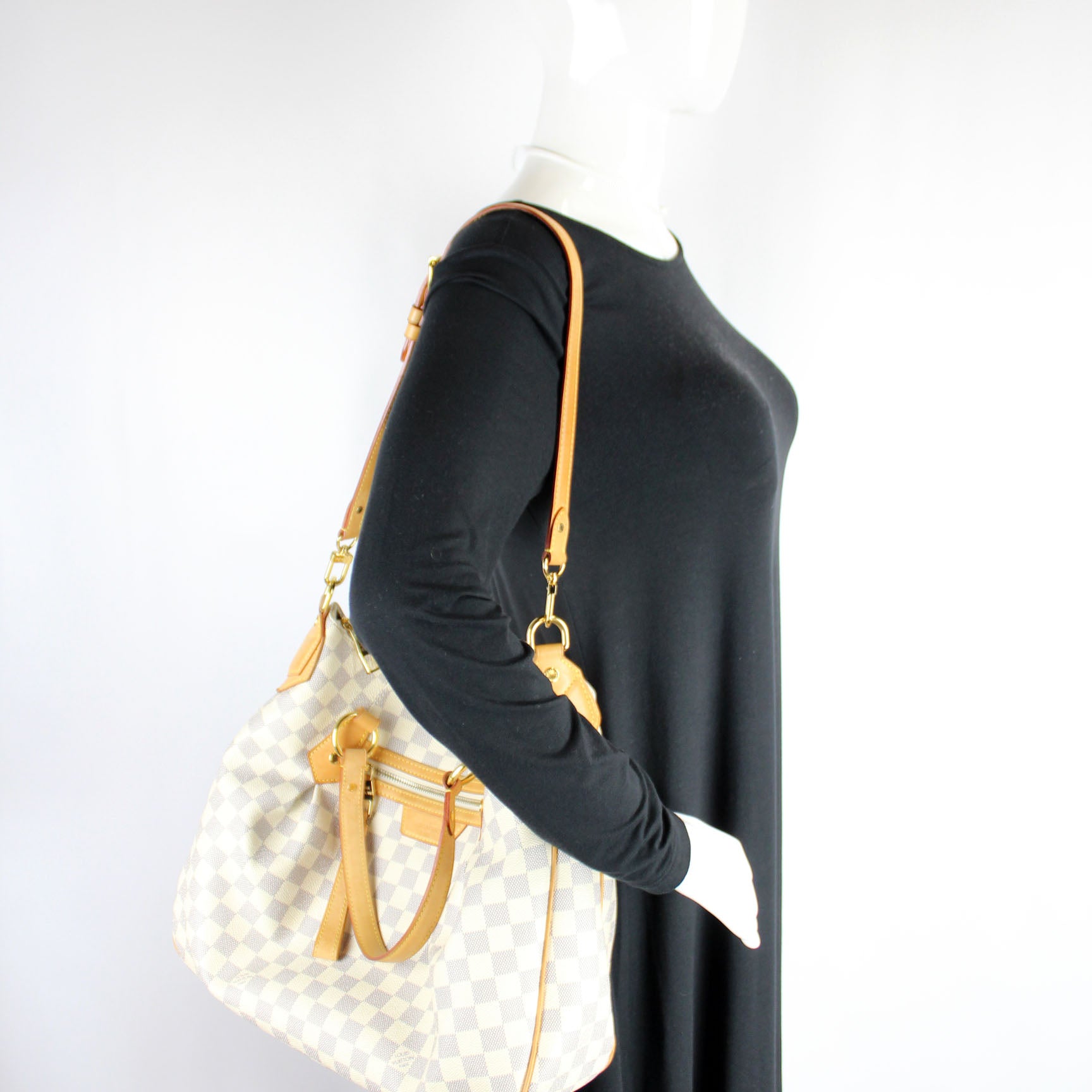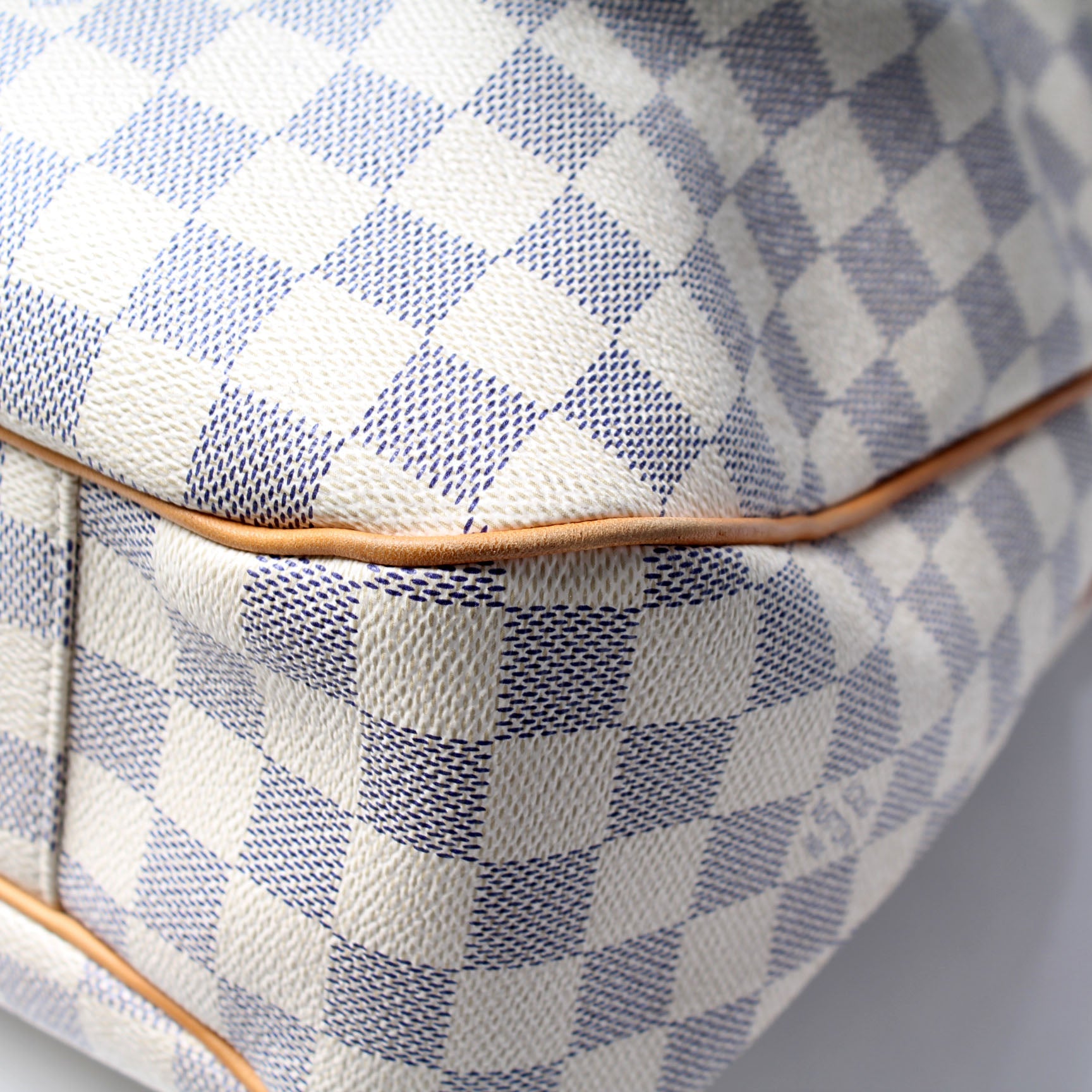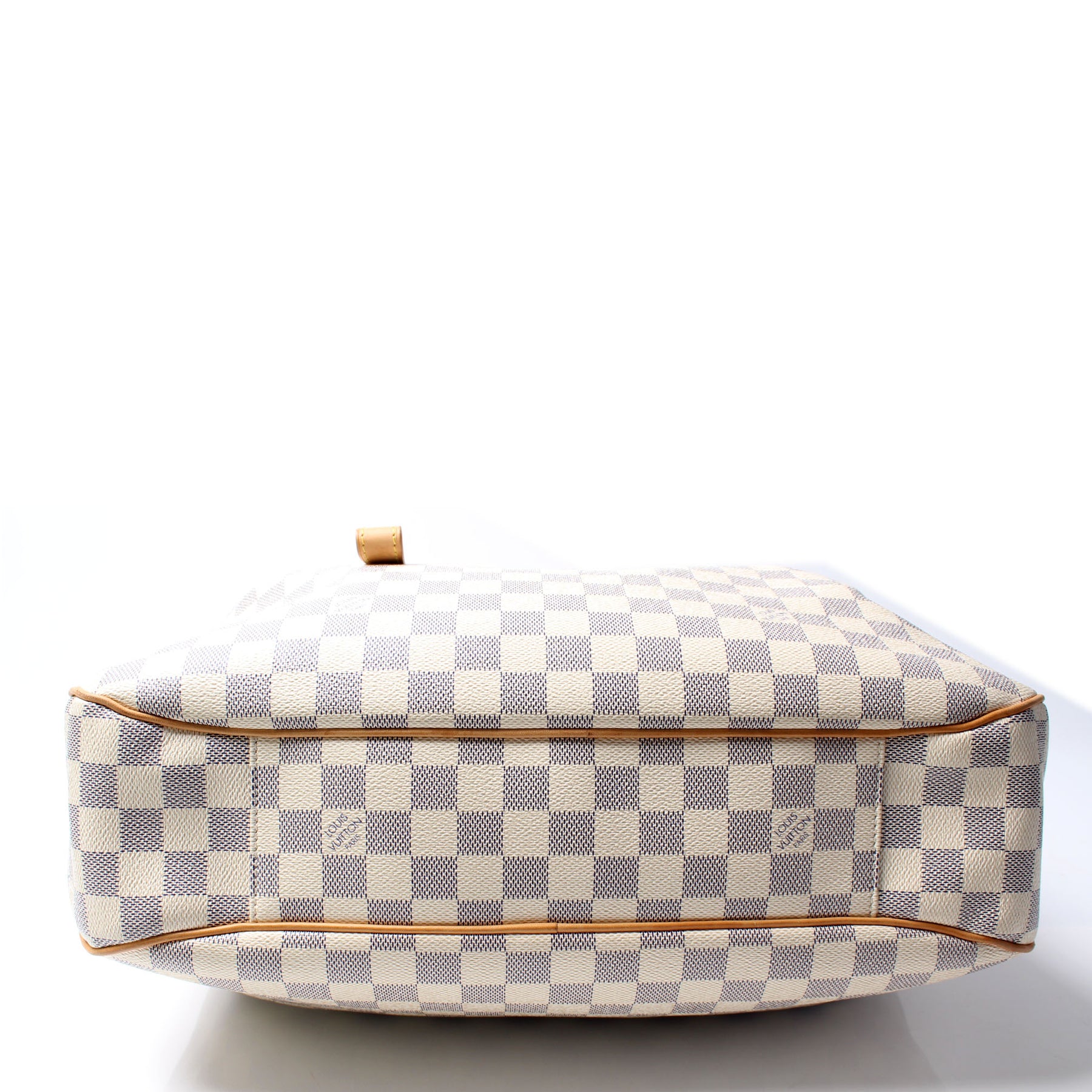 This pre-owned Louis Vuitton Evora MM is guaranteed 100% authentic. The exterior is in the classic Louis Vuitton Damier Azur coated canvas.