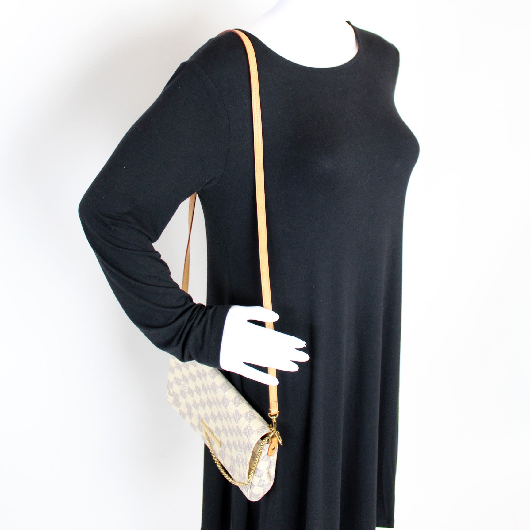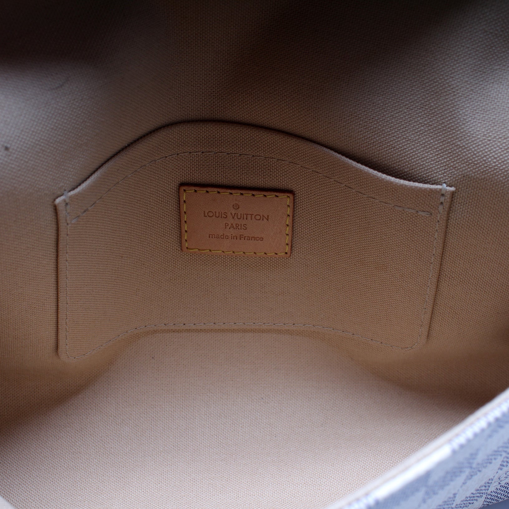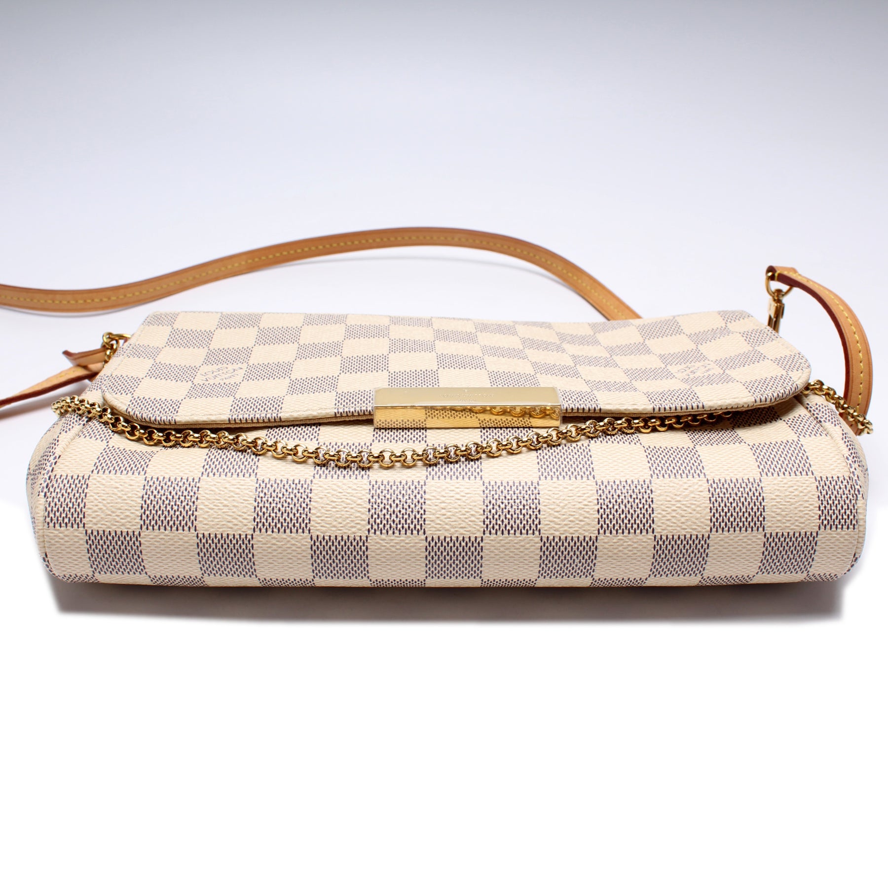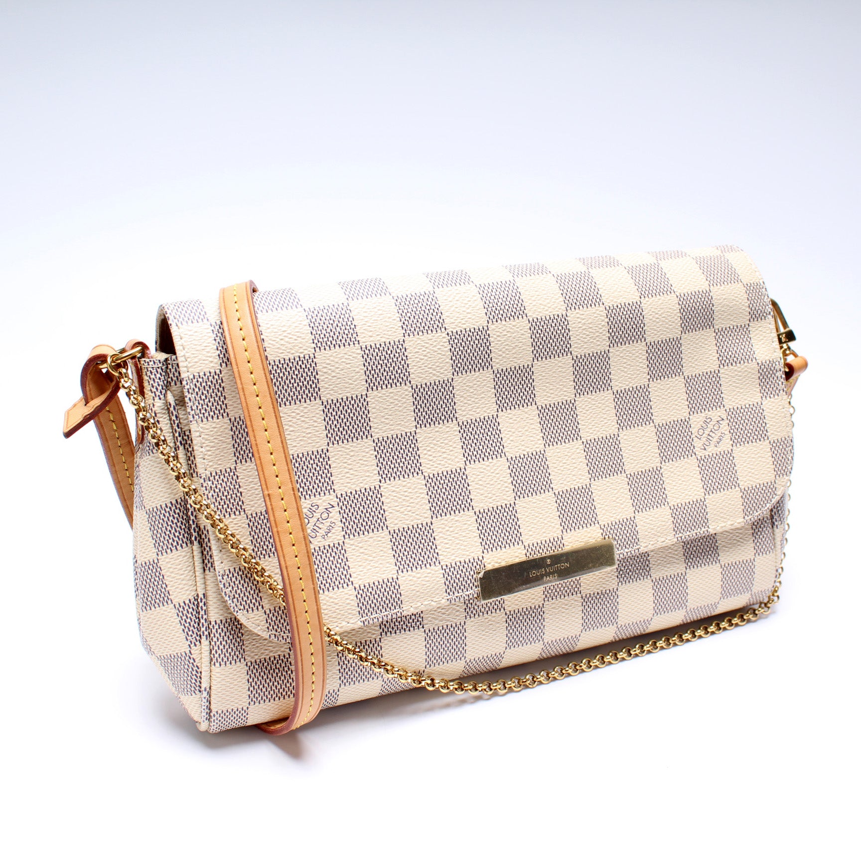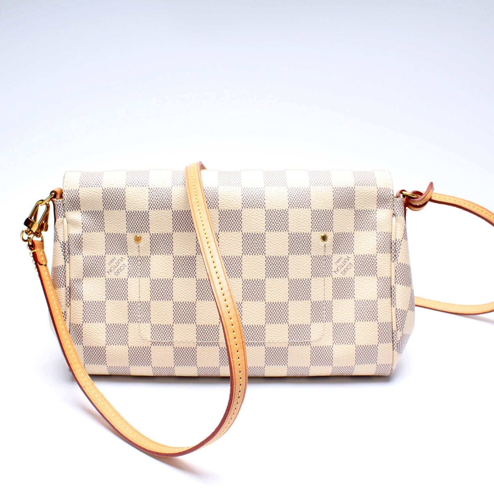 This pre-owned Louis Vuitton Favorite MM is guaranteed 100% authentic. The exterior is in the classic Damier Azur coated canvas.
