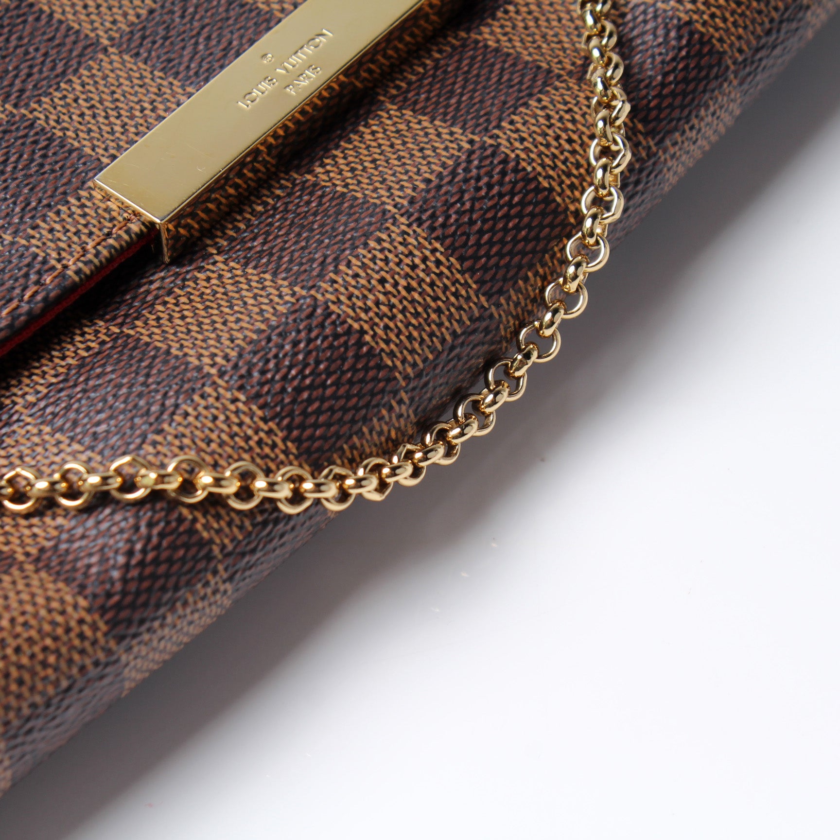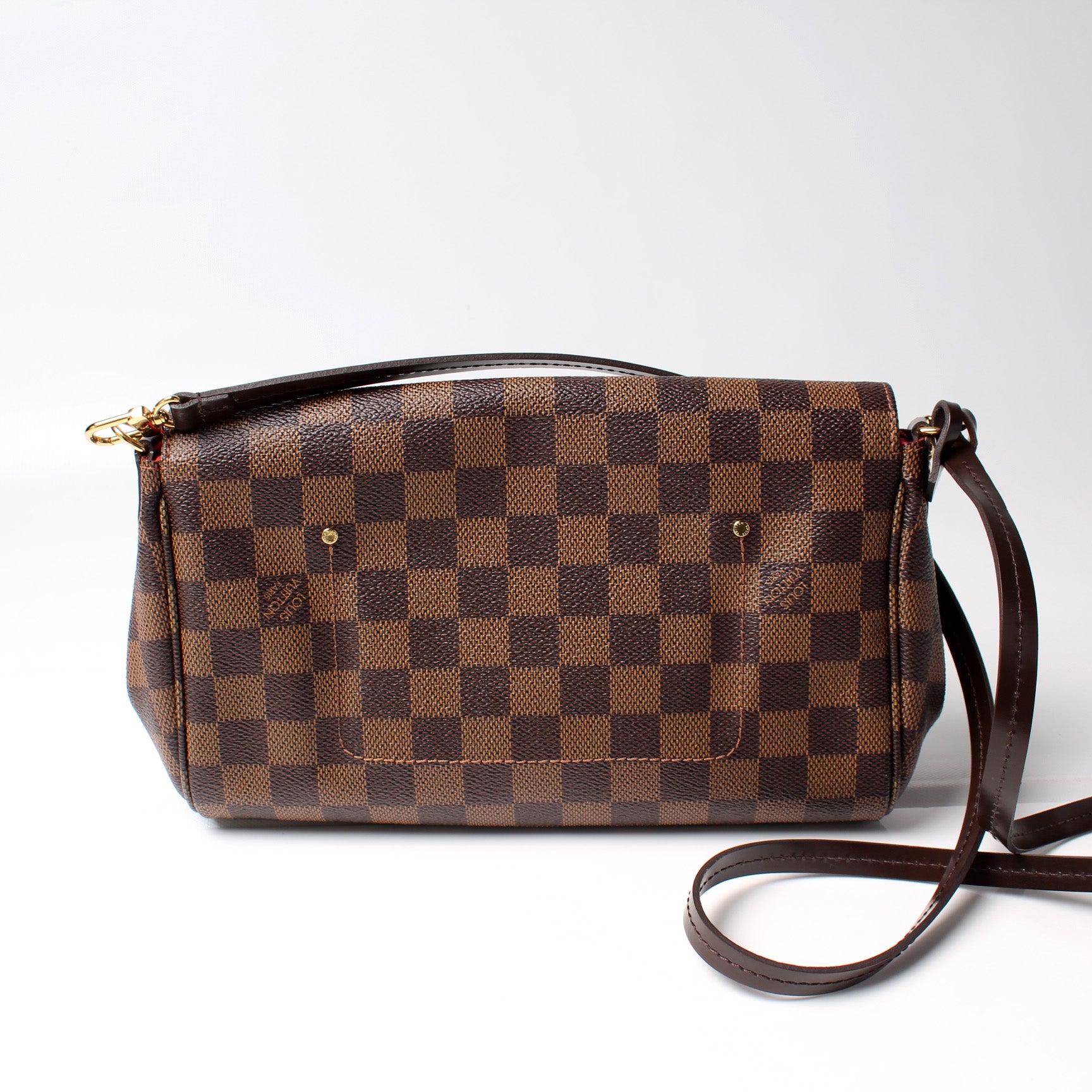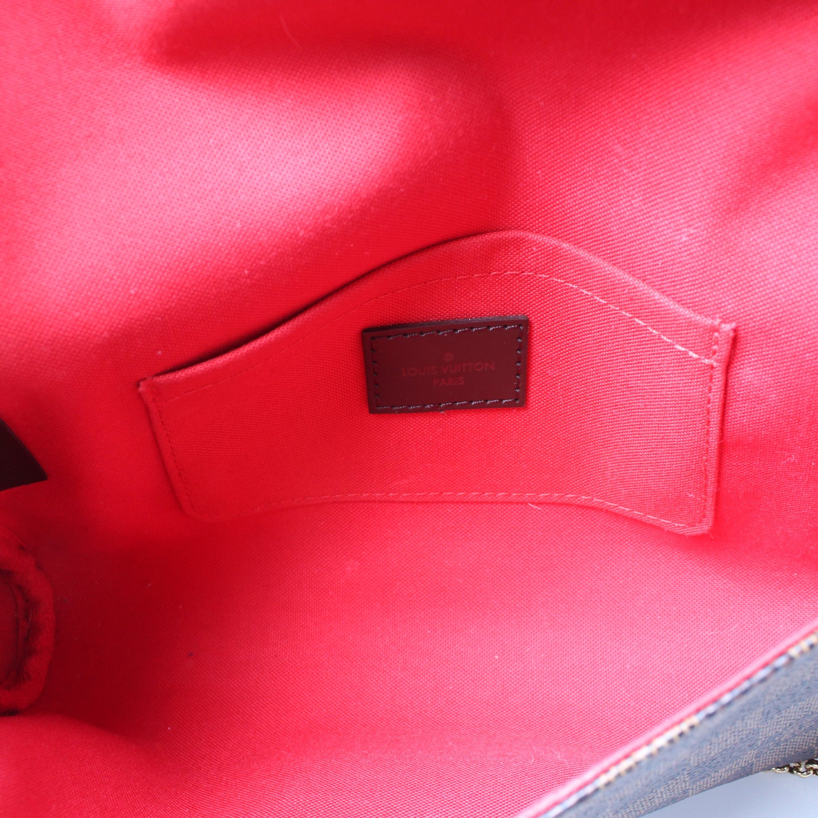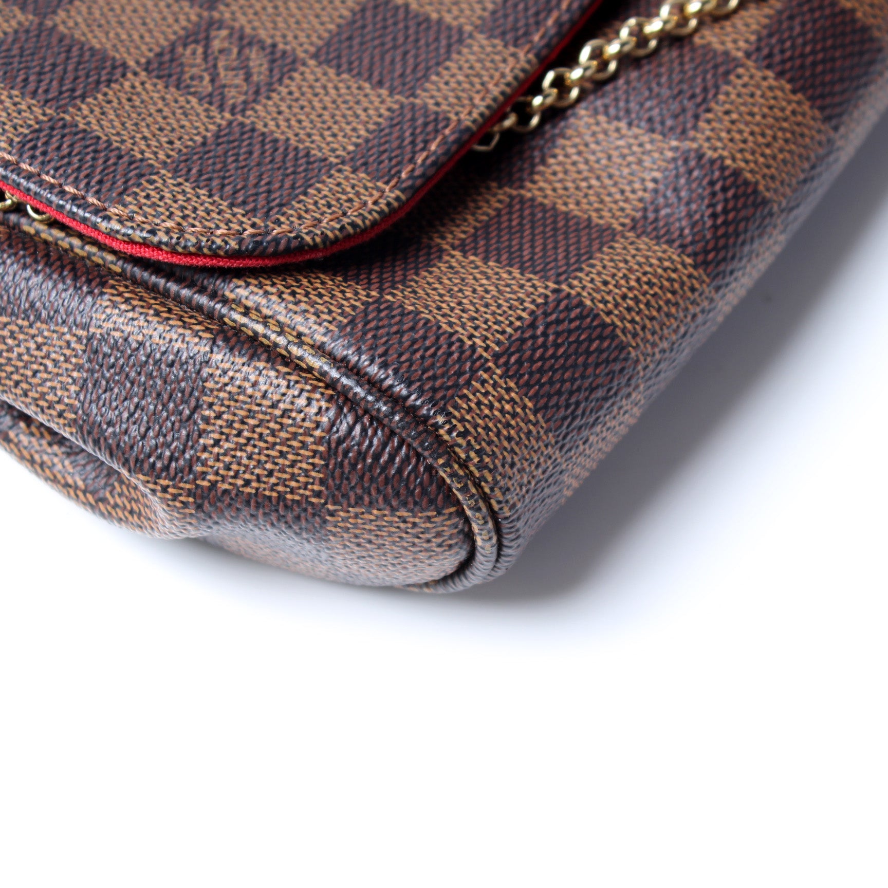 This pre-owned Louis Vuitton Favorite MM is guaranteed 100% authentic. The exterior is in the classic Damier Ebene coated canvas.