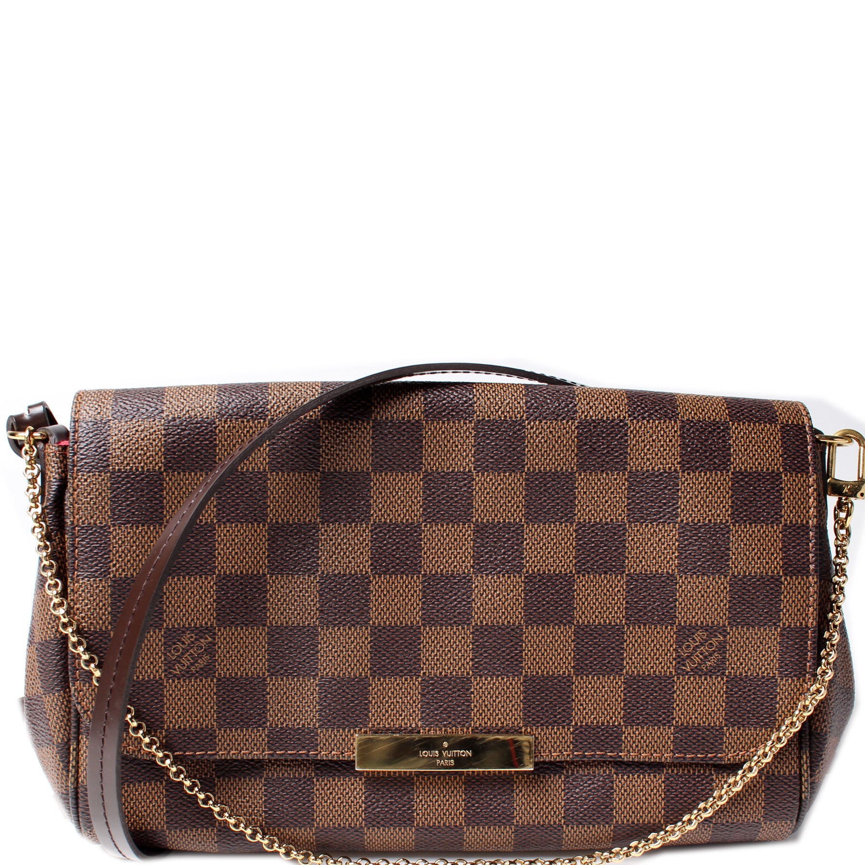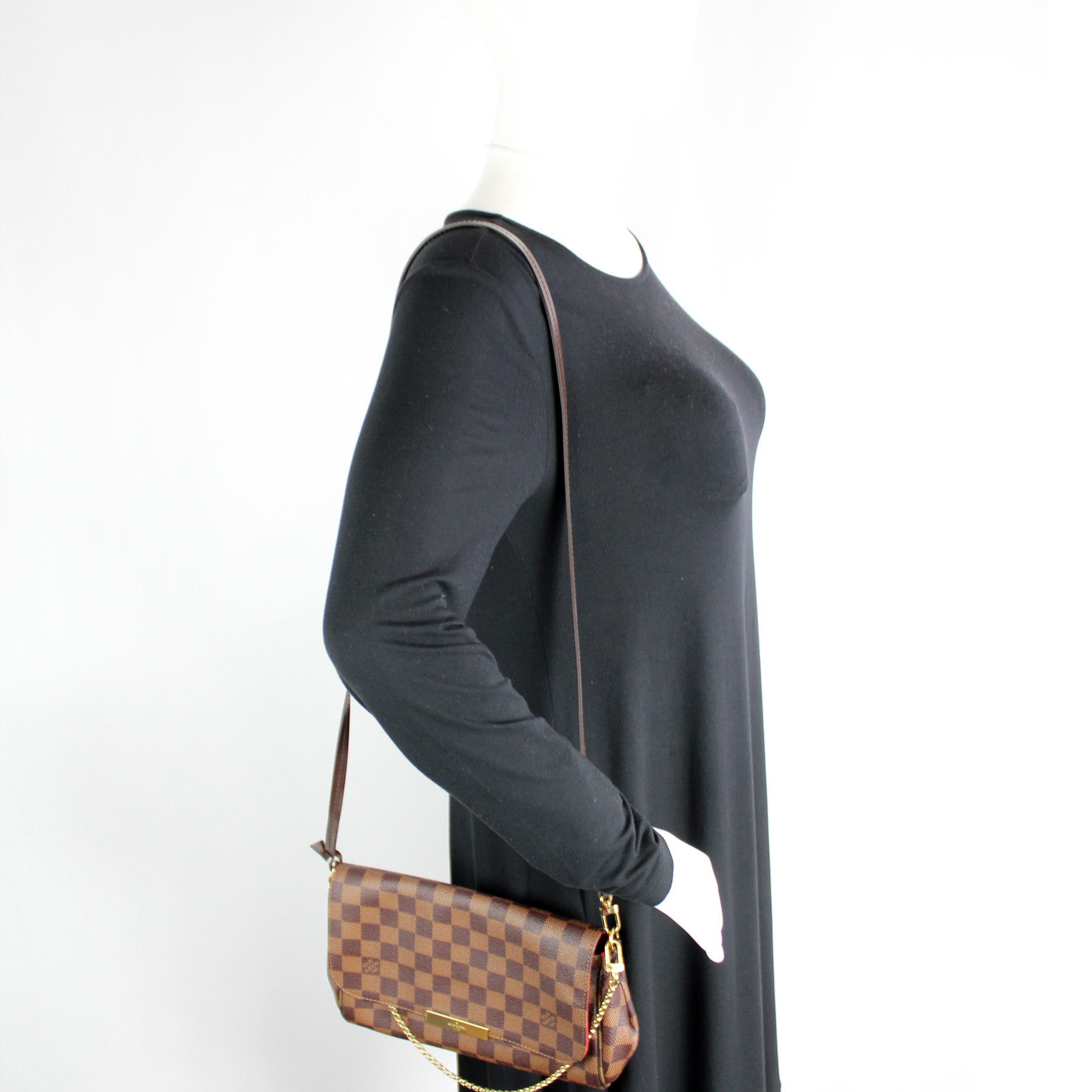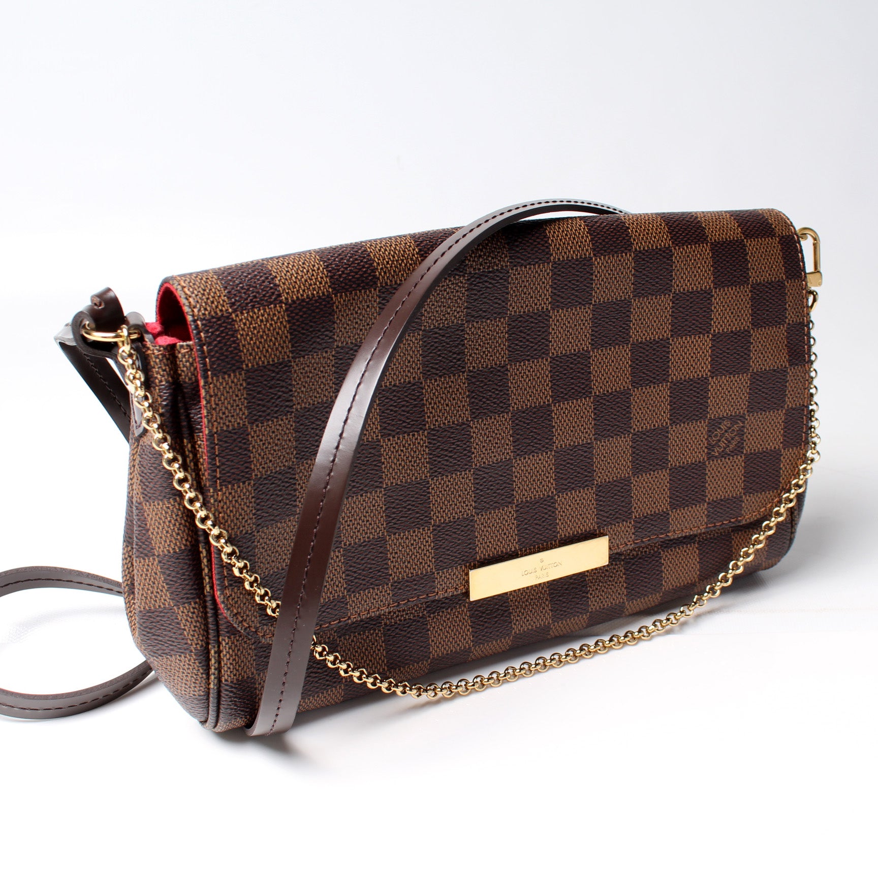 This pre-owned Louis Vuitton Favorite MM is guaranteed 100% authentic. The exterior is in the classic Damier Ebene coated canvas.