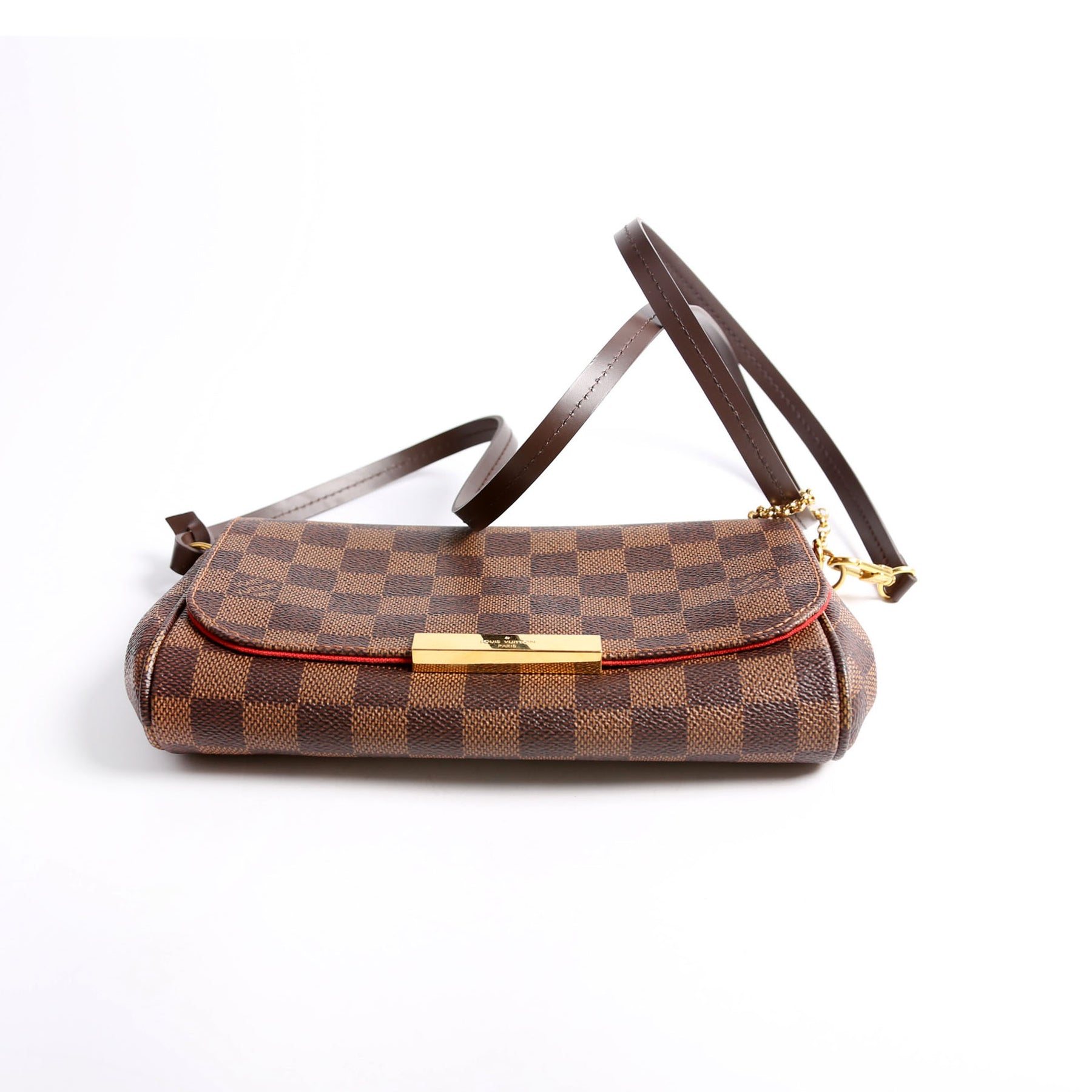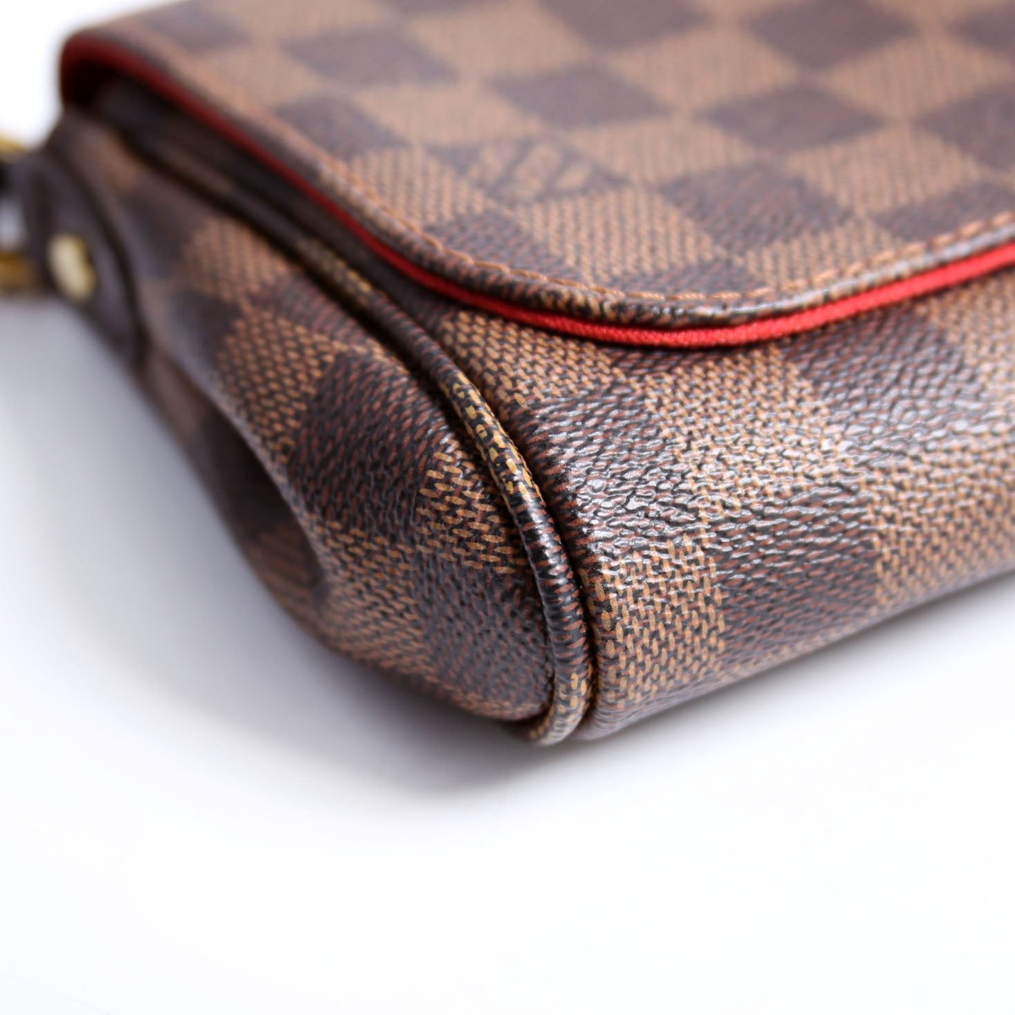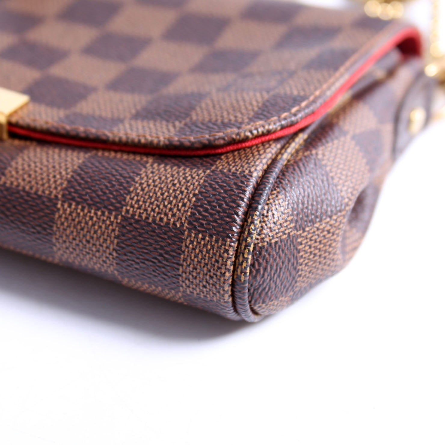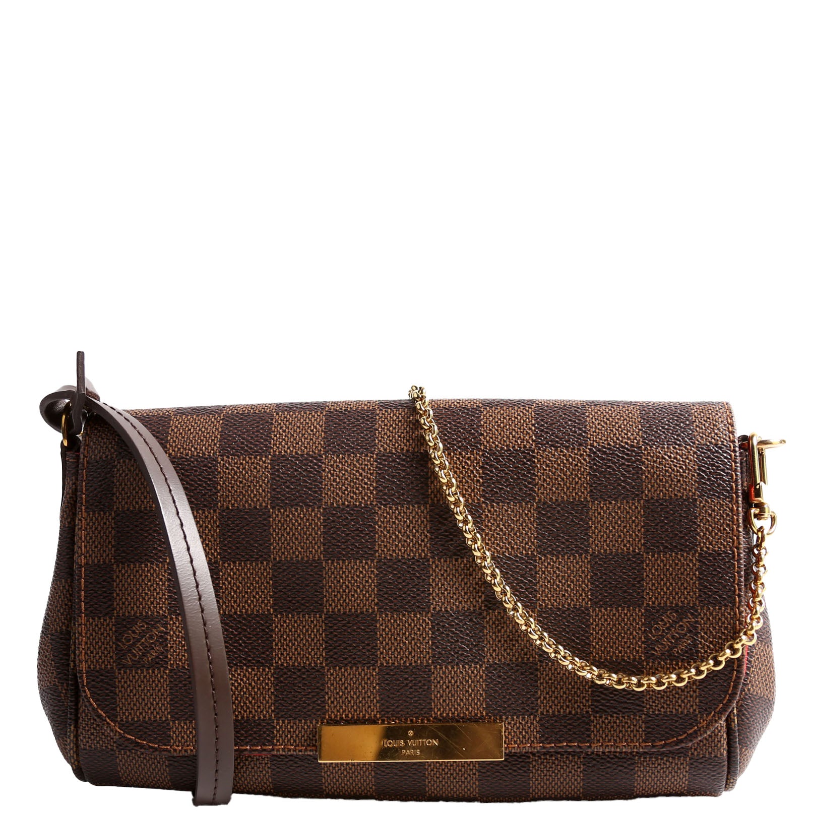 This pre-owned Louis Vuitton Favorite PM is guaranteed 100% authentic. The exterior is in the classic Louis Vuitton Damier Ebene coated canvas.