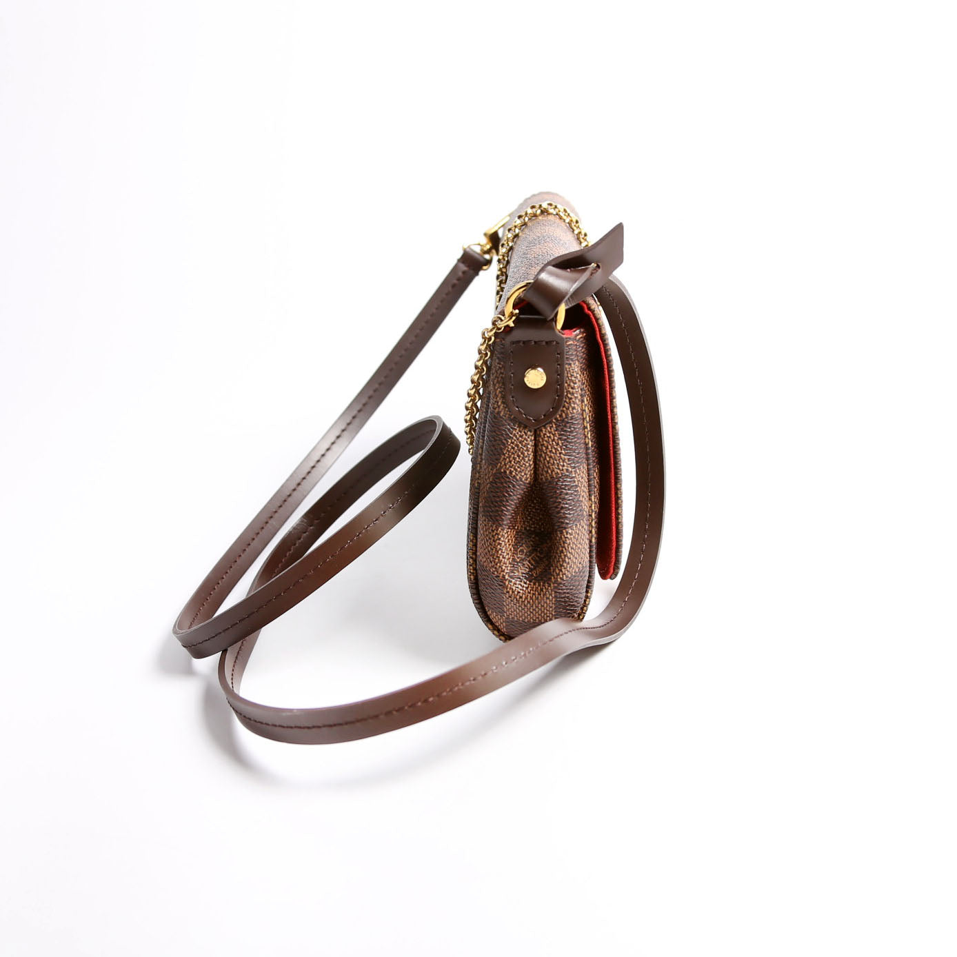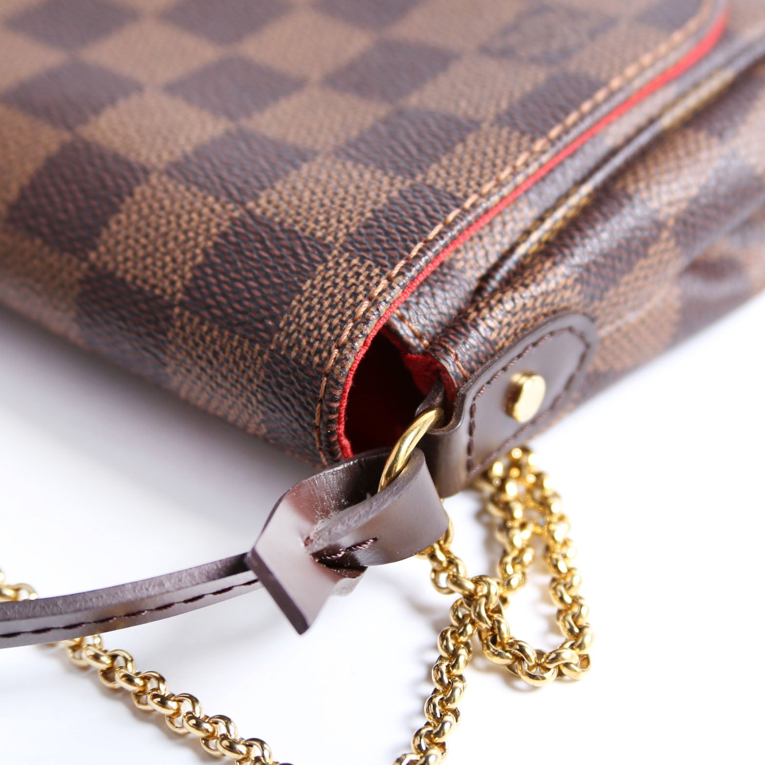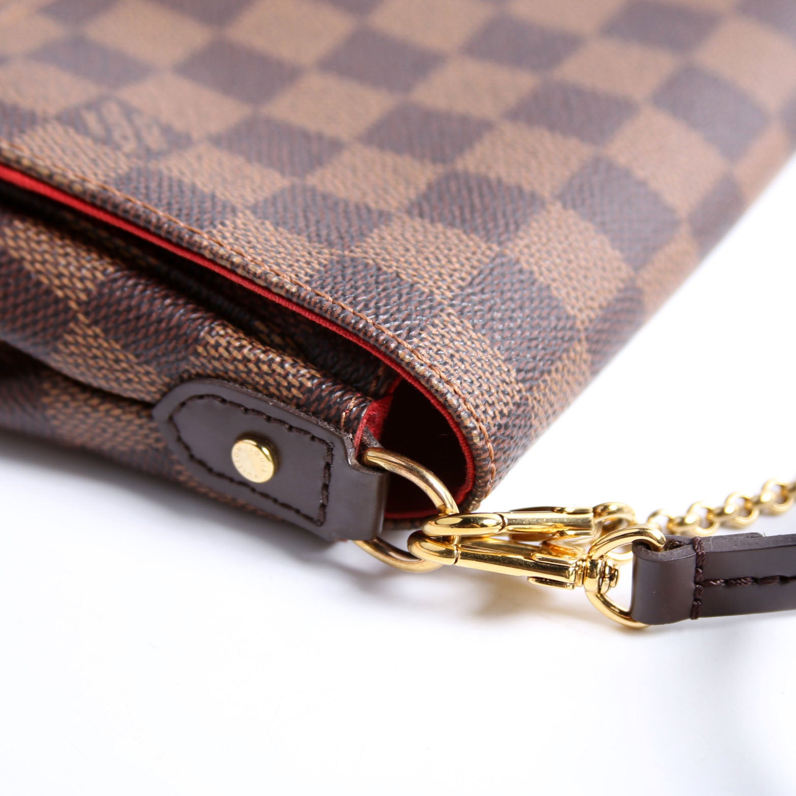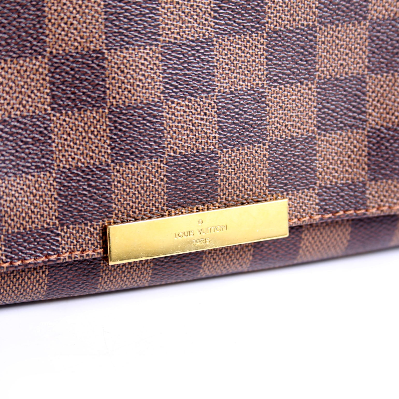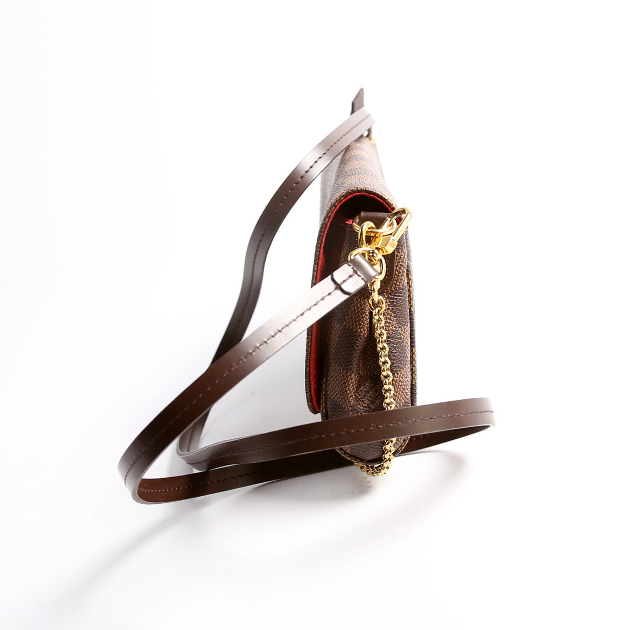 This pre-owned Louis Vuitton Favorite PM is guaranteed 100% authentic. The exterior is in the classic Louis Vuitton Damier Ebene coated canvas.