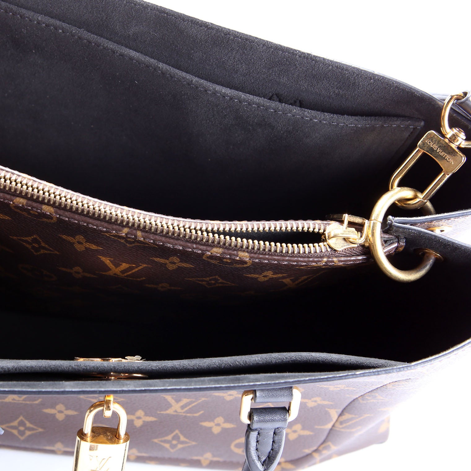 Interior: The interior is free from wear. It features one open pocket, one zip closure pocket, and two open sections.