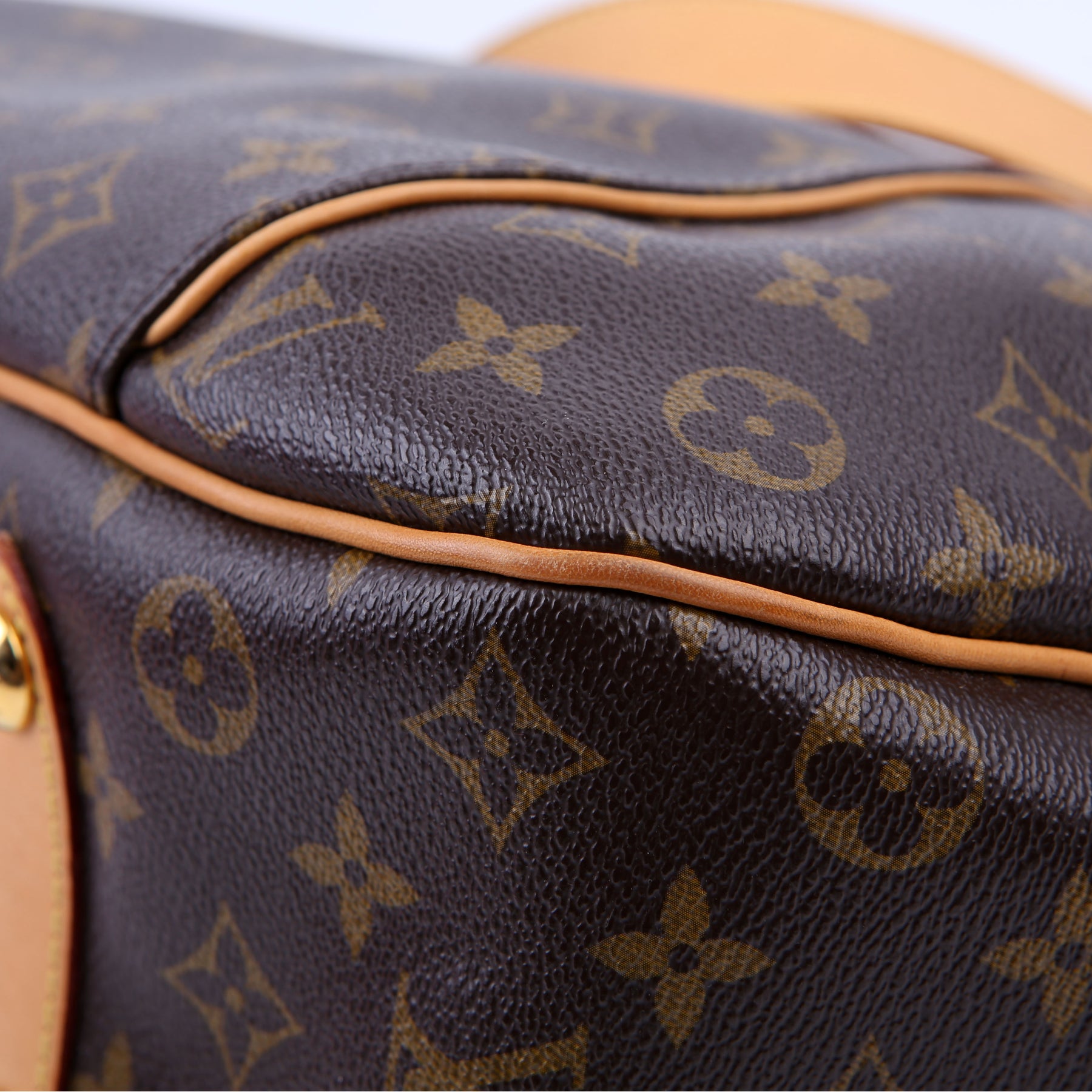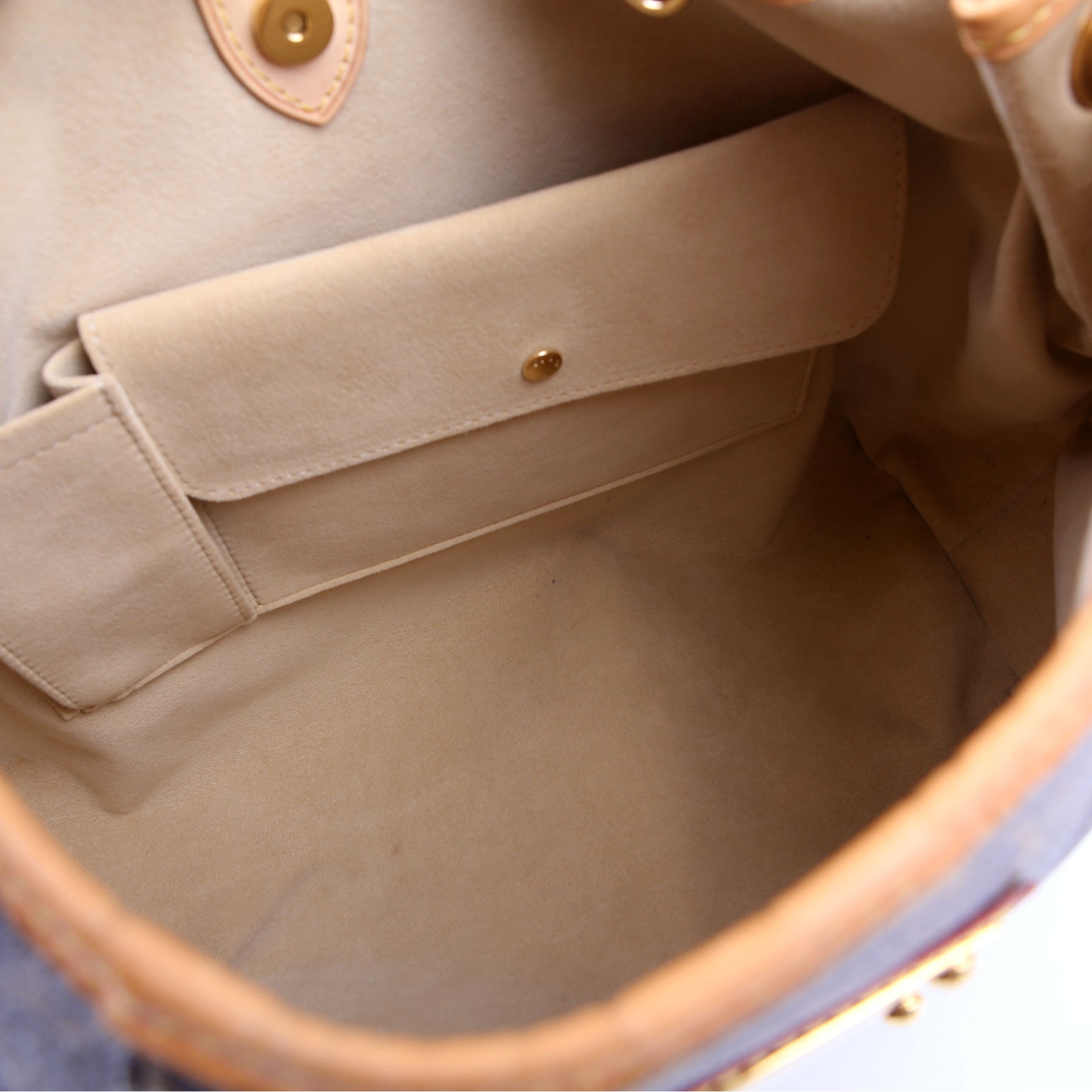 Exterior: The exterior coated canvas has minor discoloration throughout. The corners and leather trim show minor wear and discoloration.