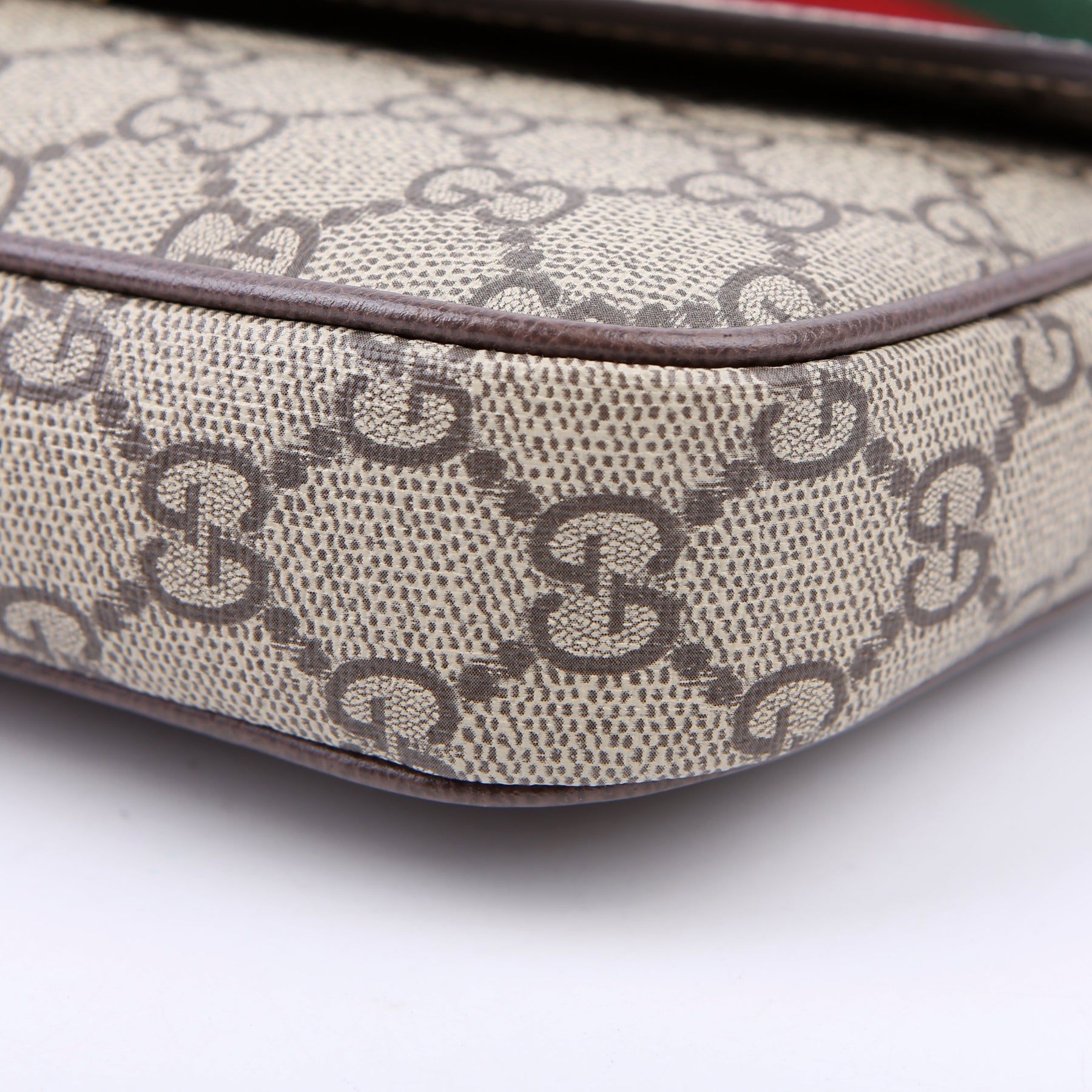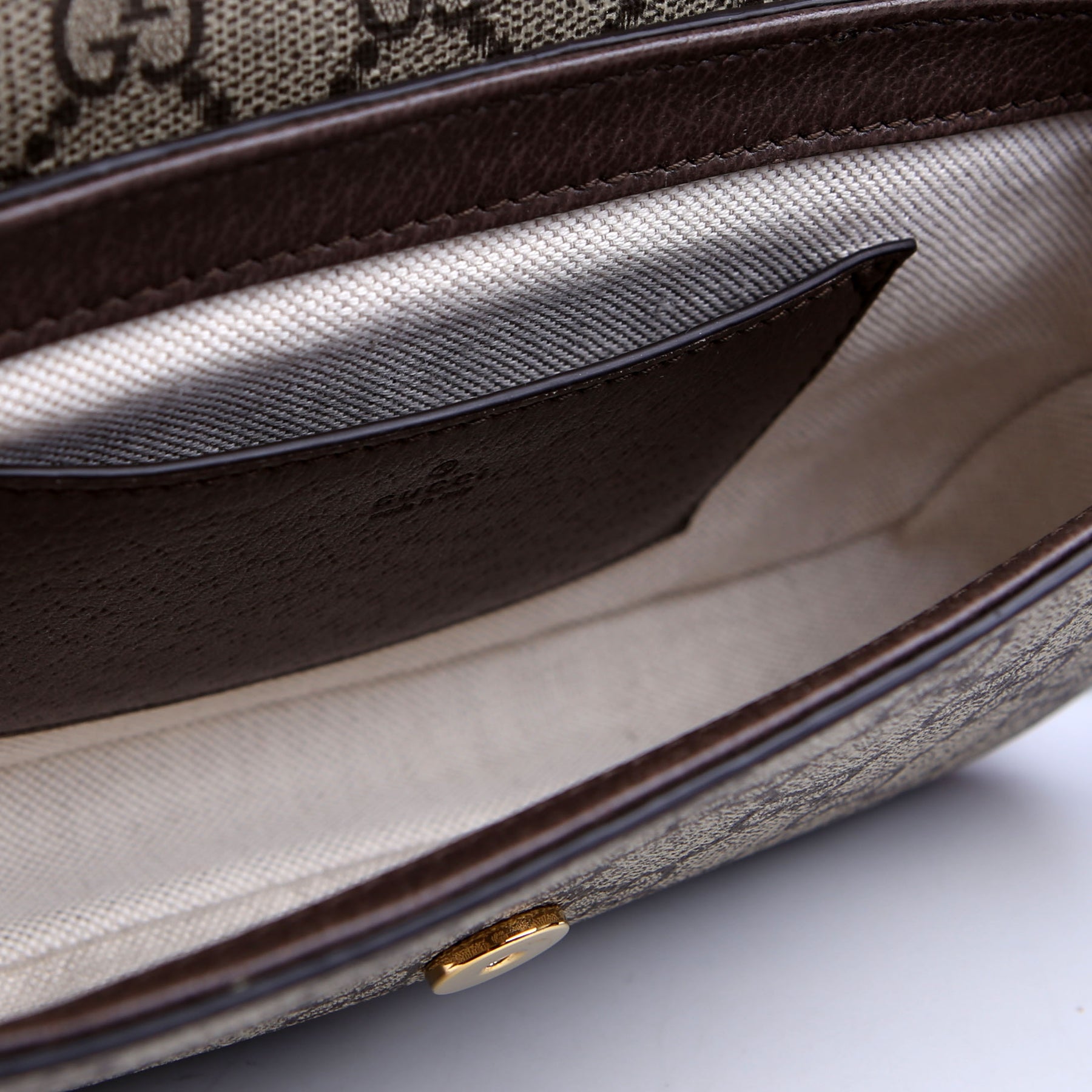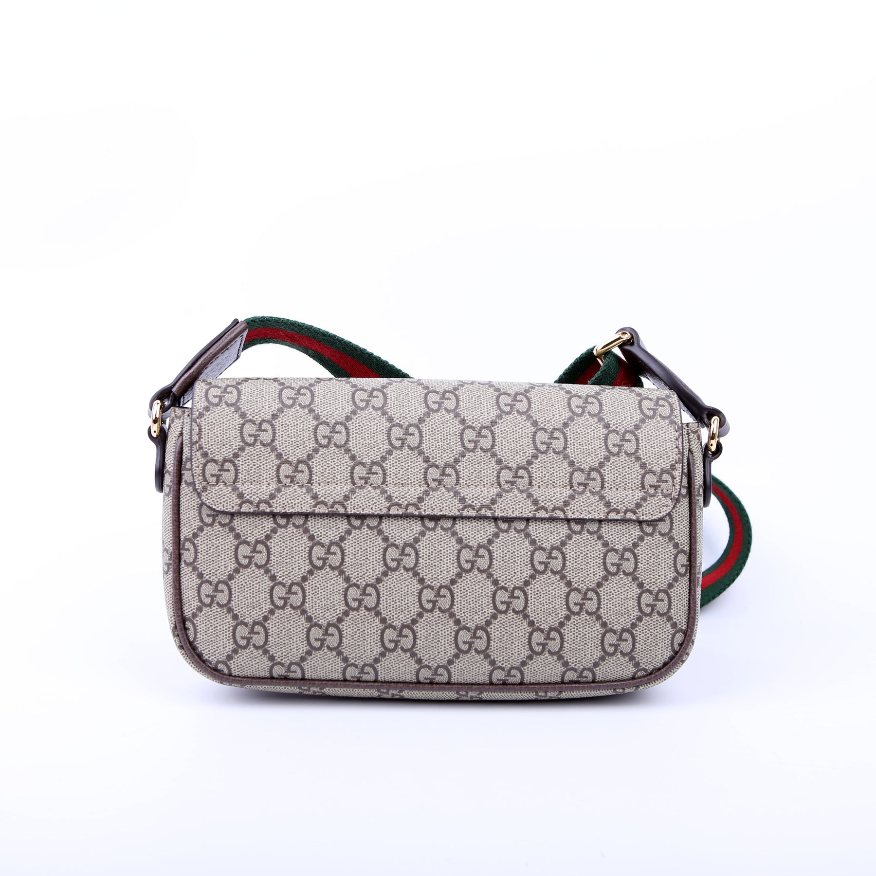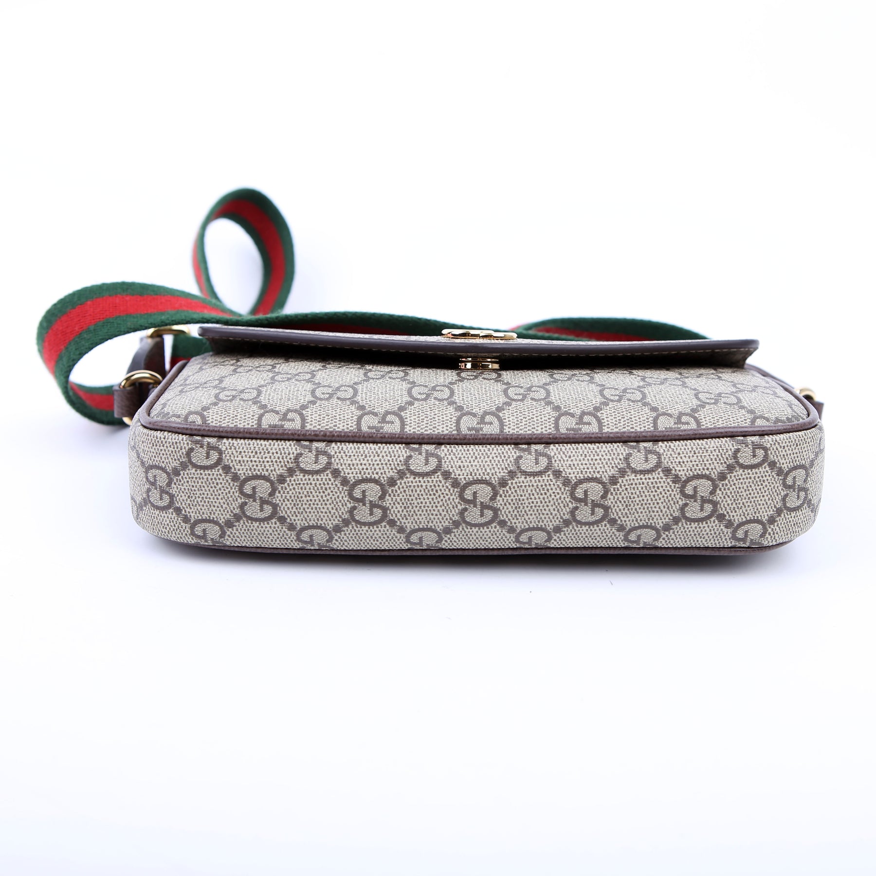 This pre-owned Gucci Ophidia GG Supreme Mini Bag is guaranteed 100% authentic. The exterior is in the classic Gucci GG Supreme coated canvas.