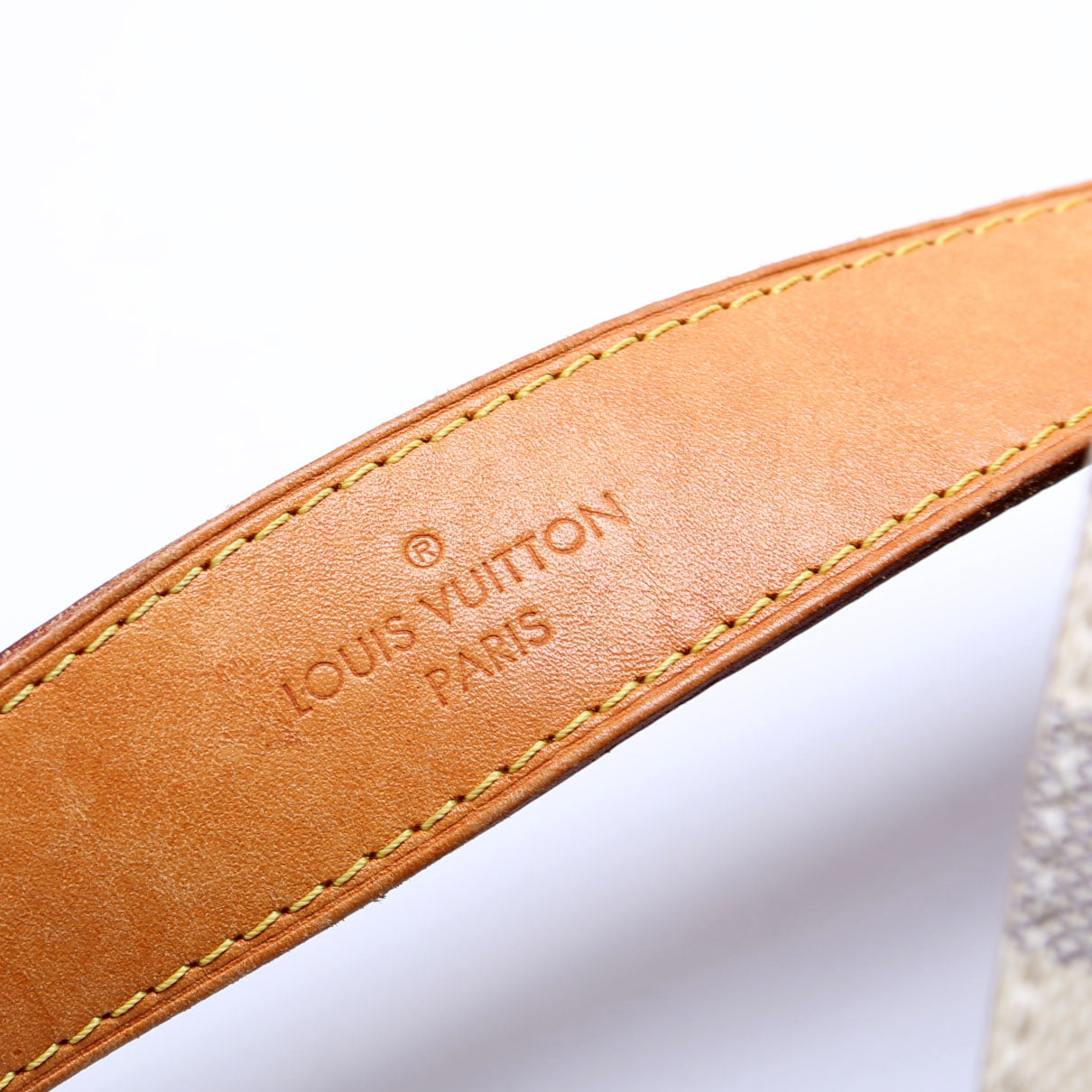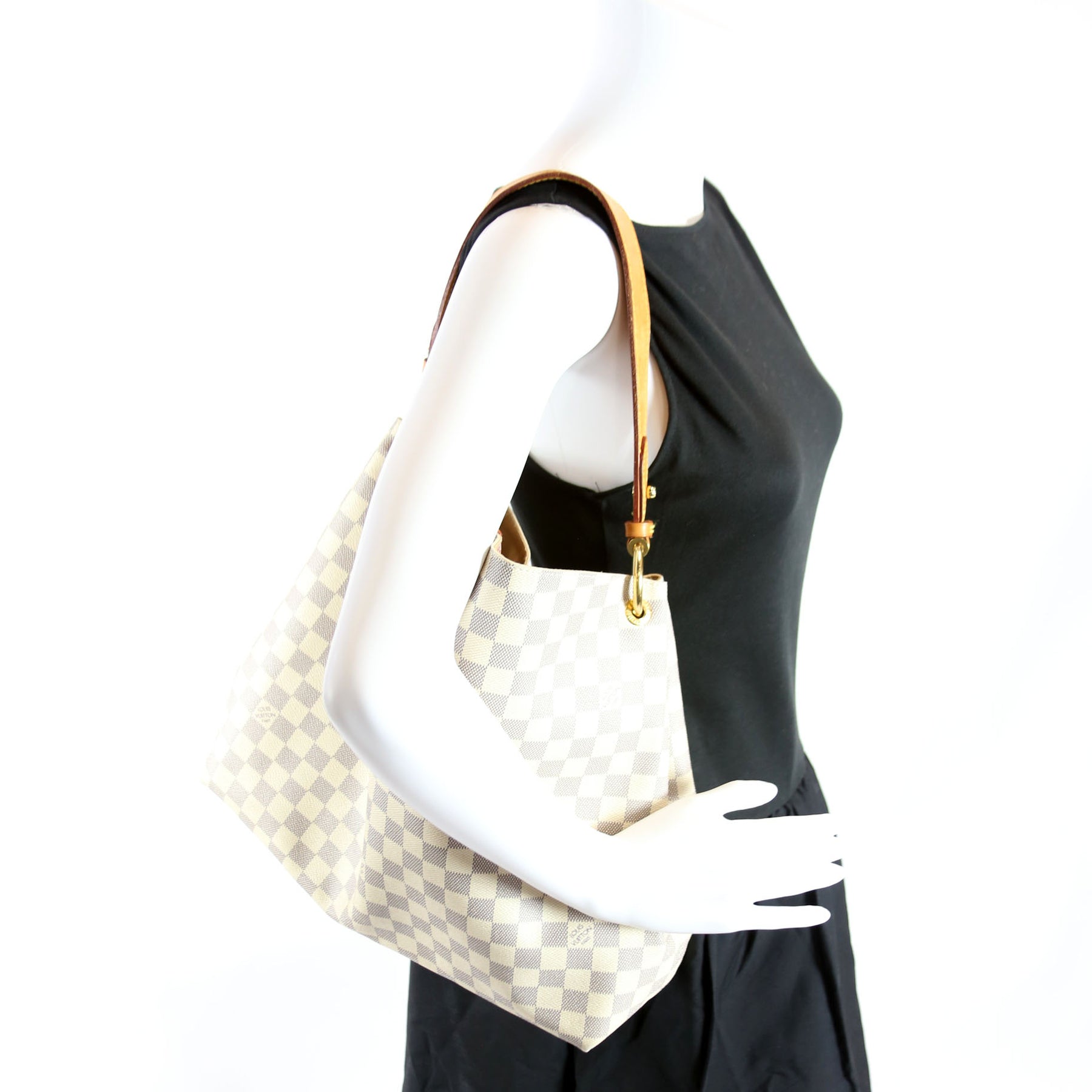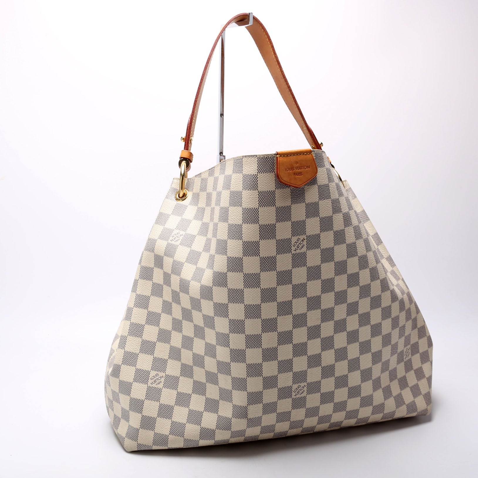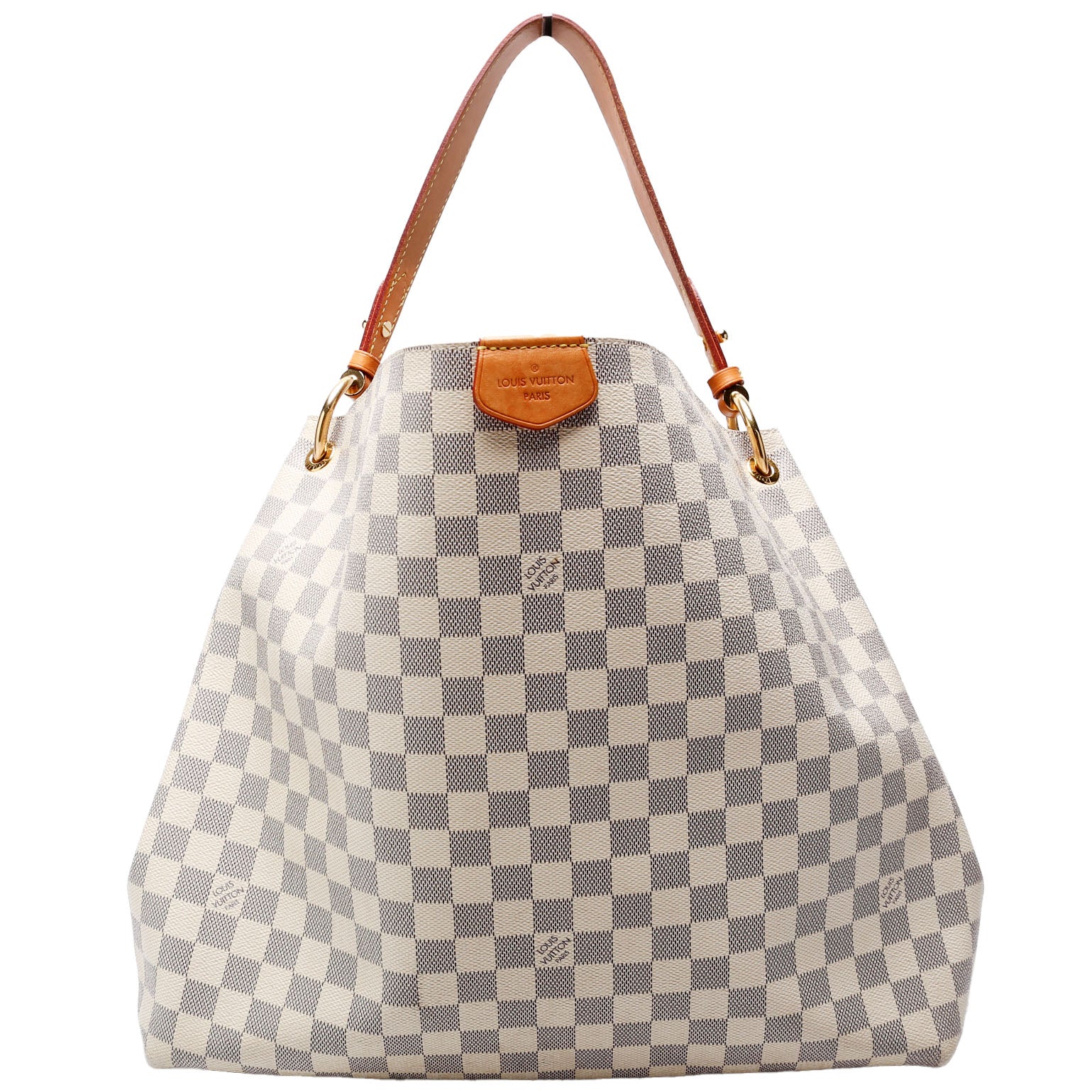 This pre-owned Louis Vuitton Graceful MM is guaranteed 100% authentic. The exterior is in the classic Louis Vuitton Damier Azur coated canvas.