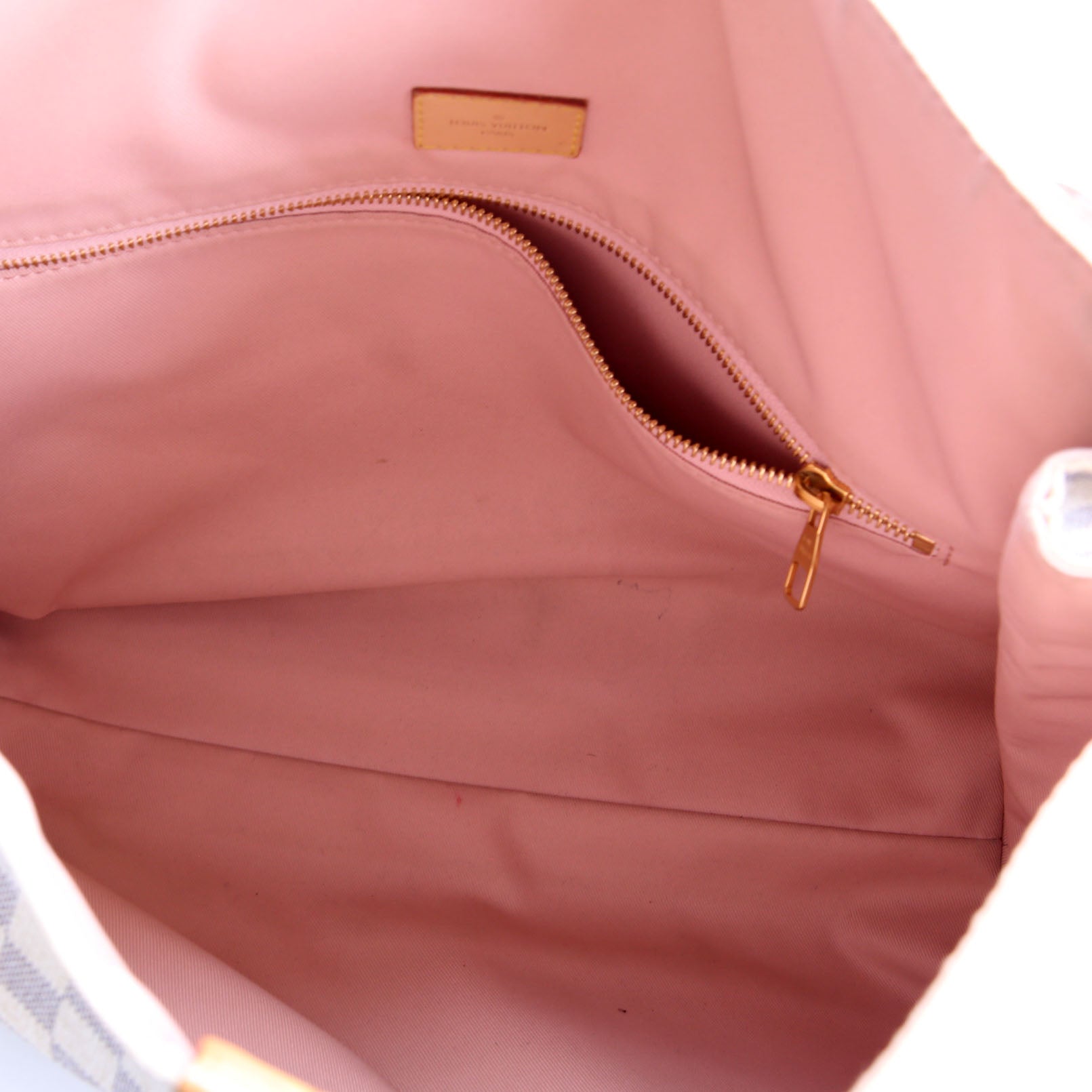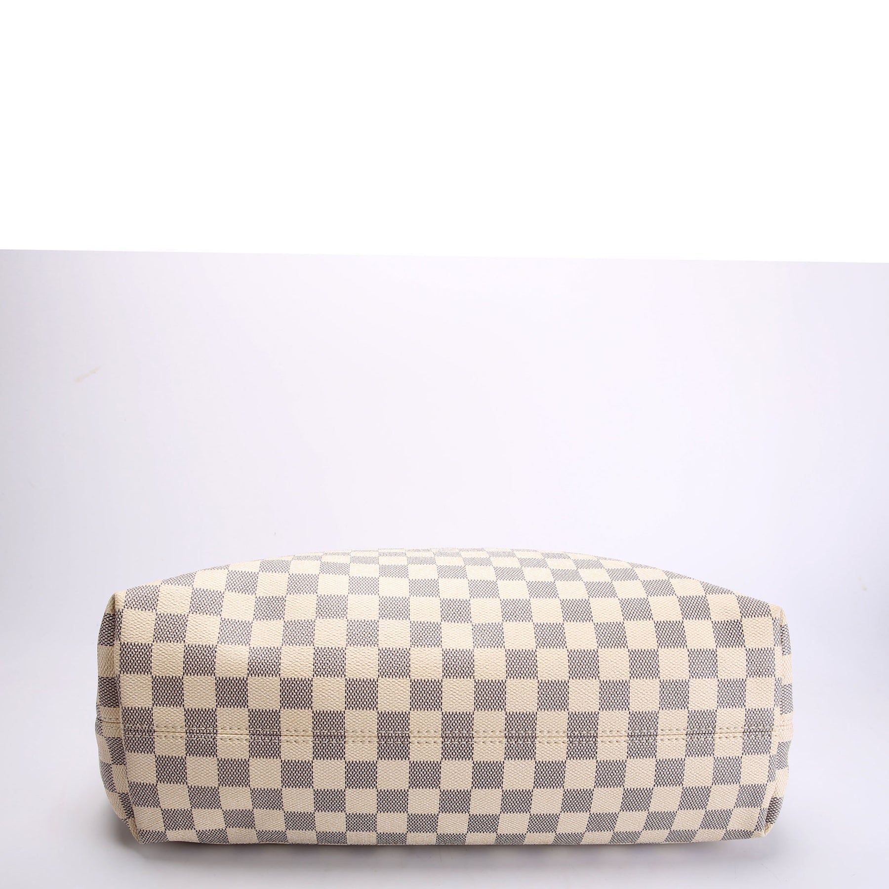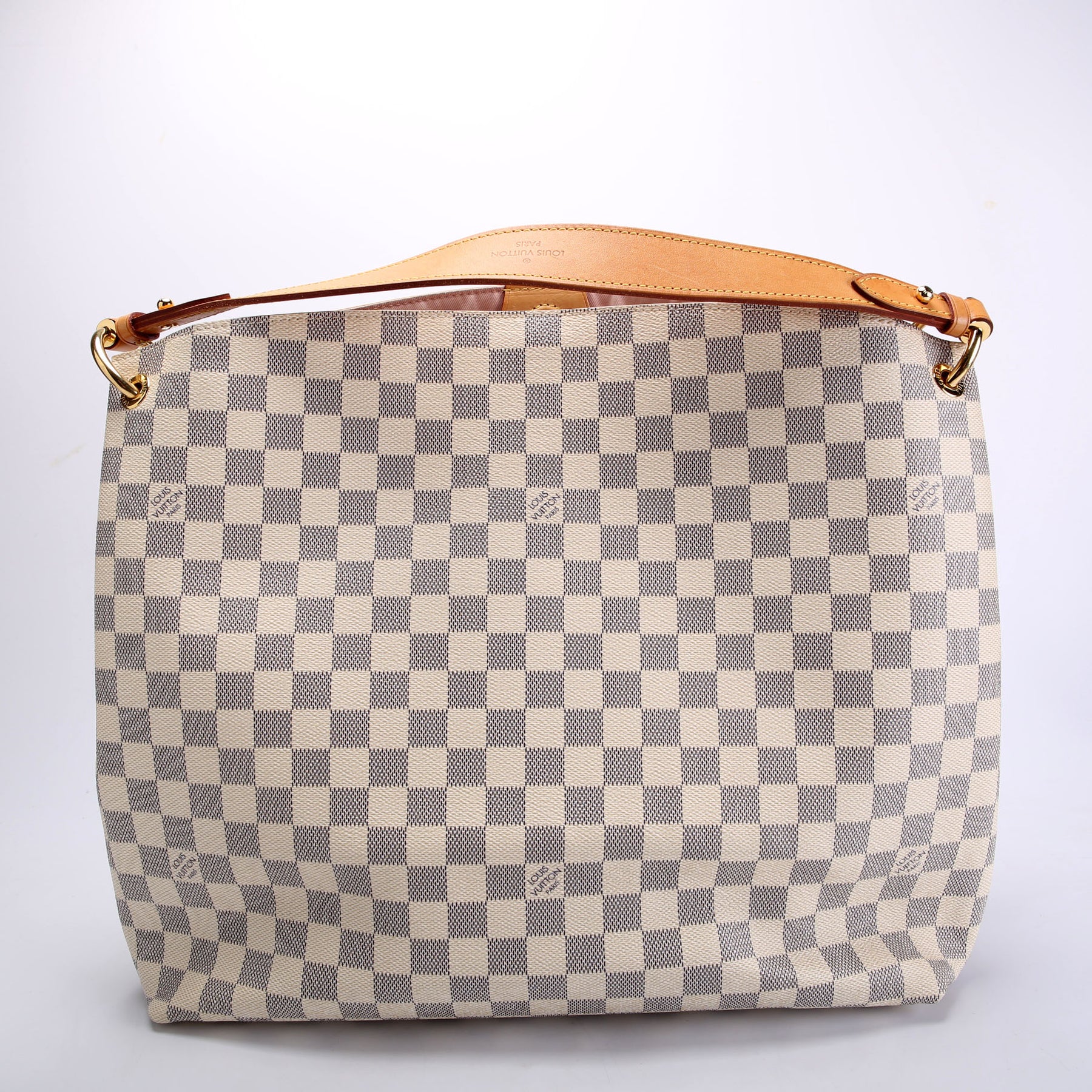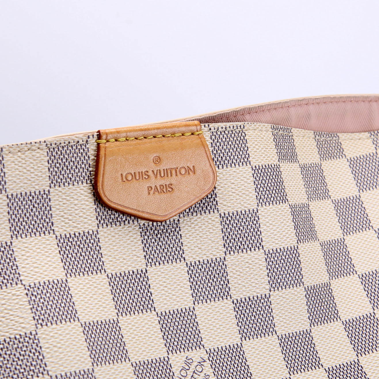 This pre-owned Louis Vuitton Gracefull MM is guaranteed 100% authentic. The exterior is in the classic Louis Vuitton Damier Azur coated canvas.