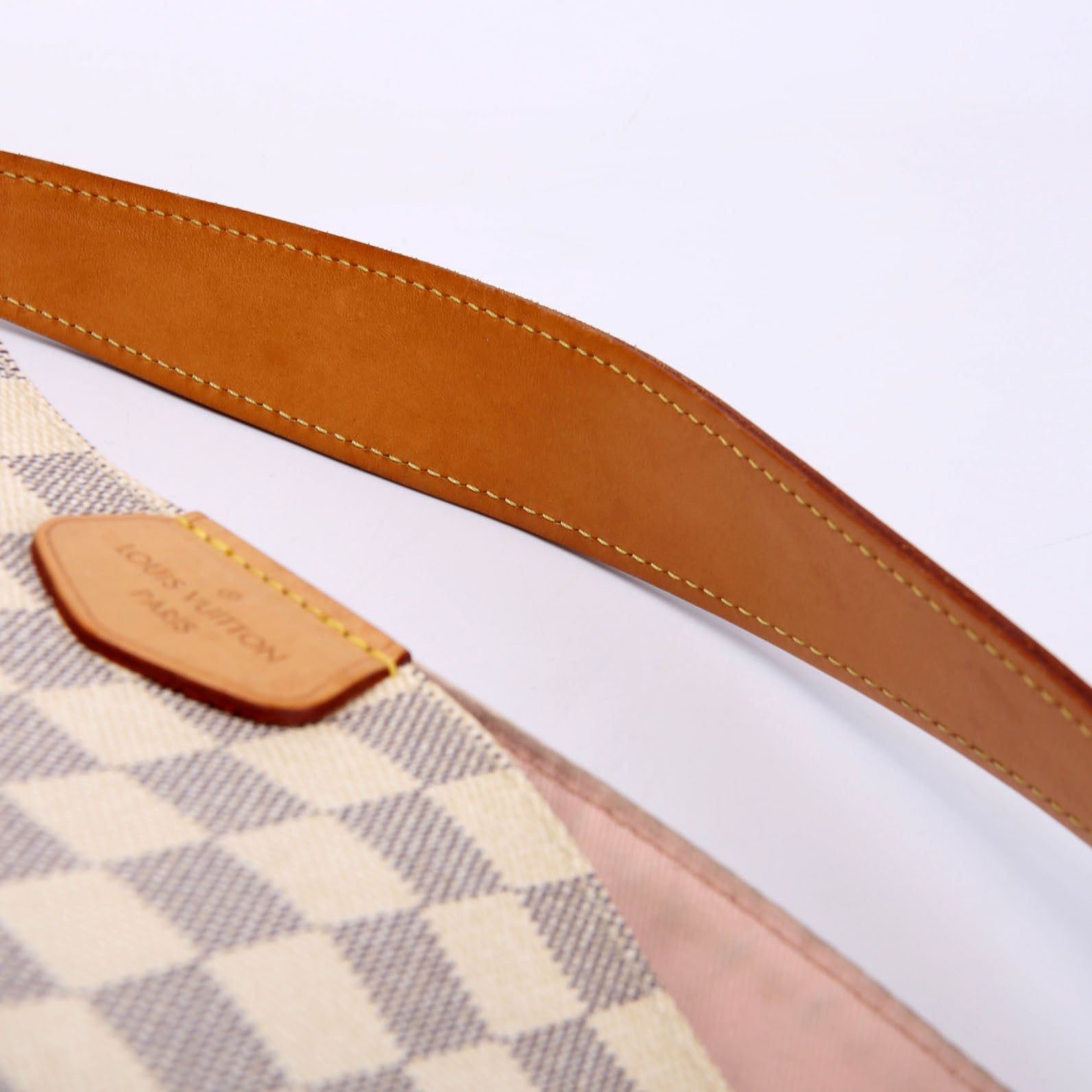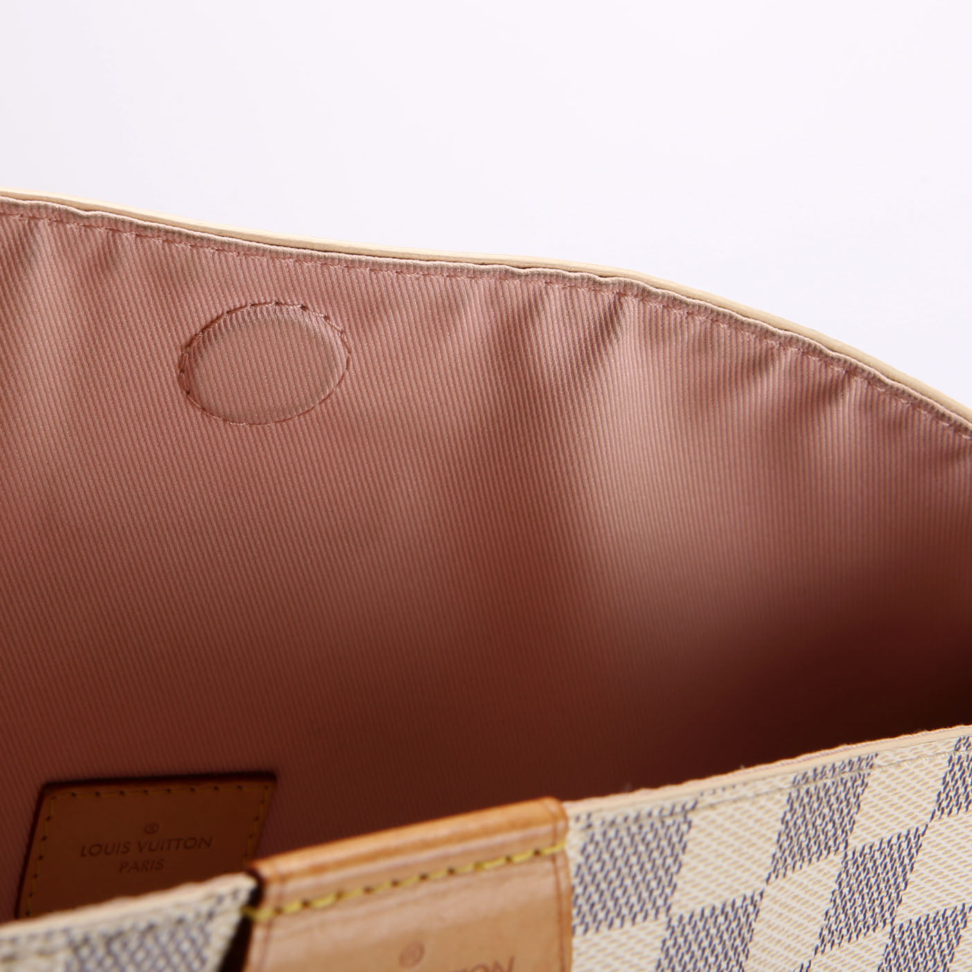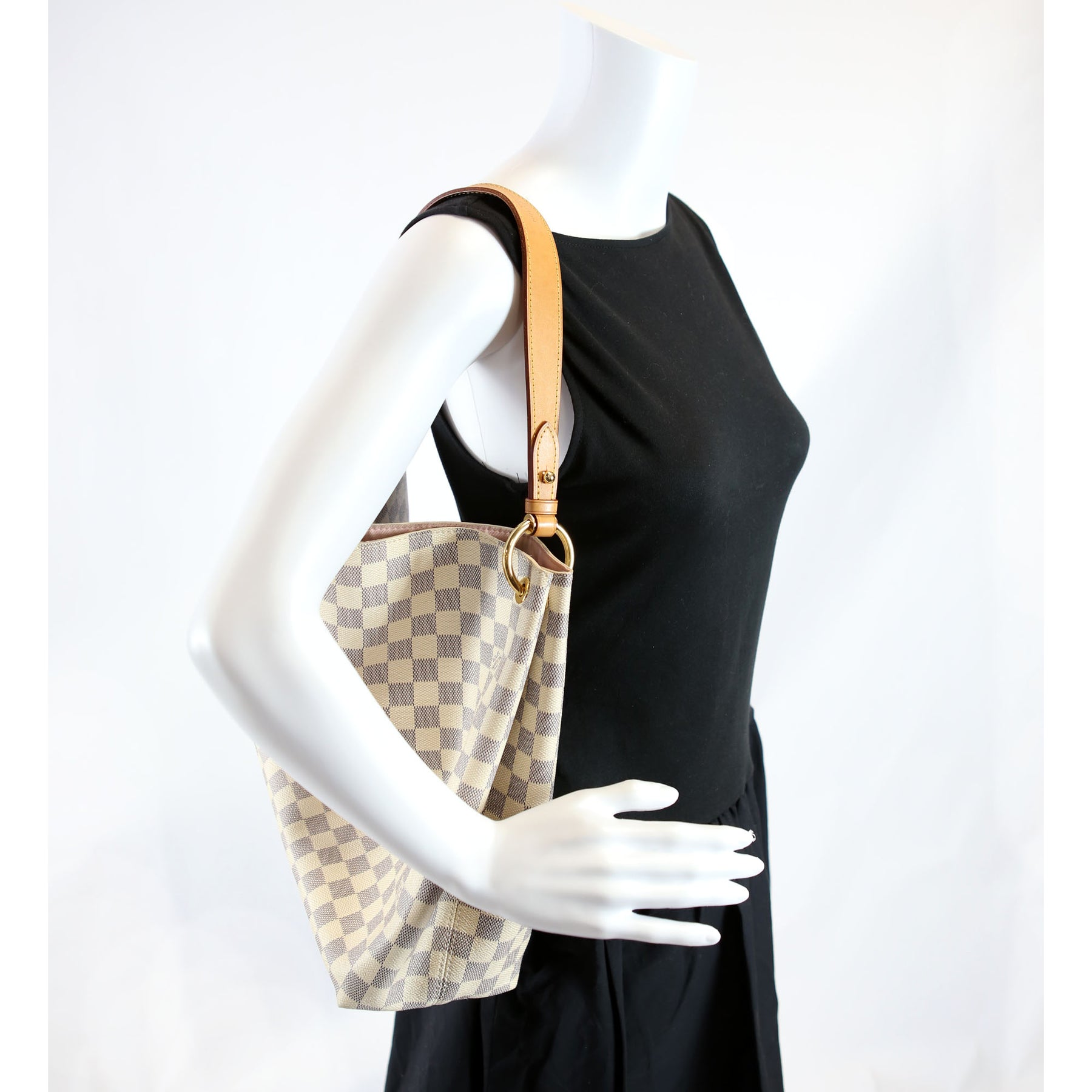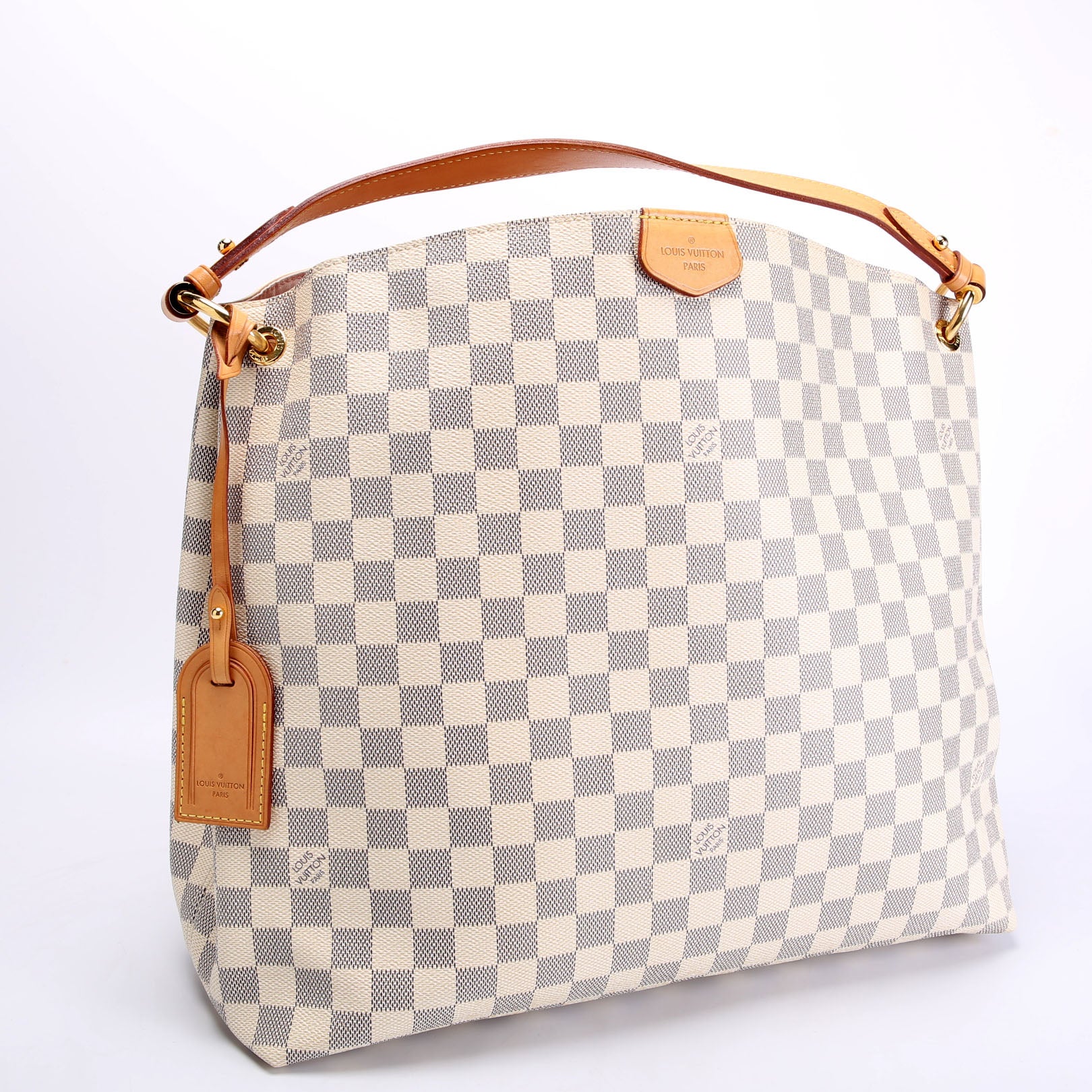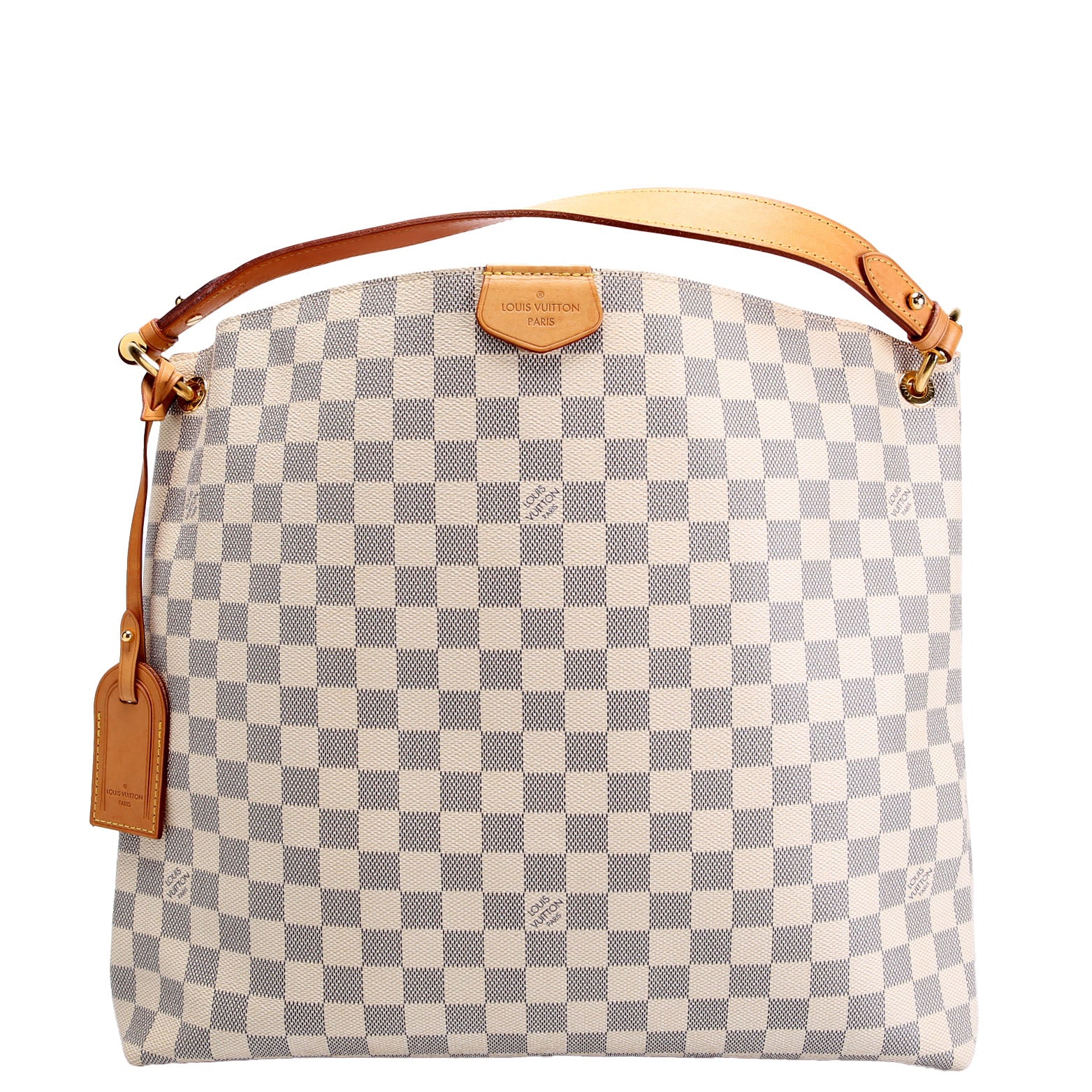 This pre-owned Louis Vuitton Gracefull MM is guaranteed 100% authentic. The exterior is in the classic Louis Vuitton Damier Azur coated canvas.