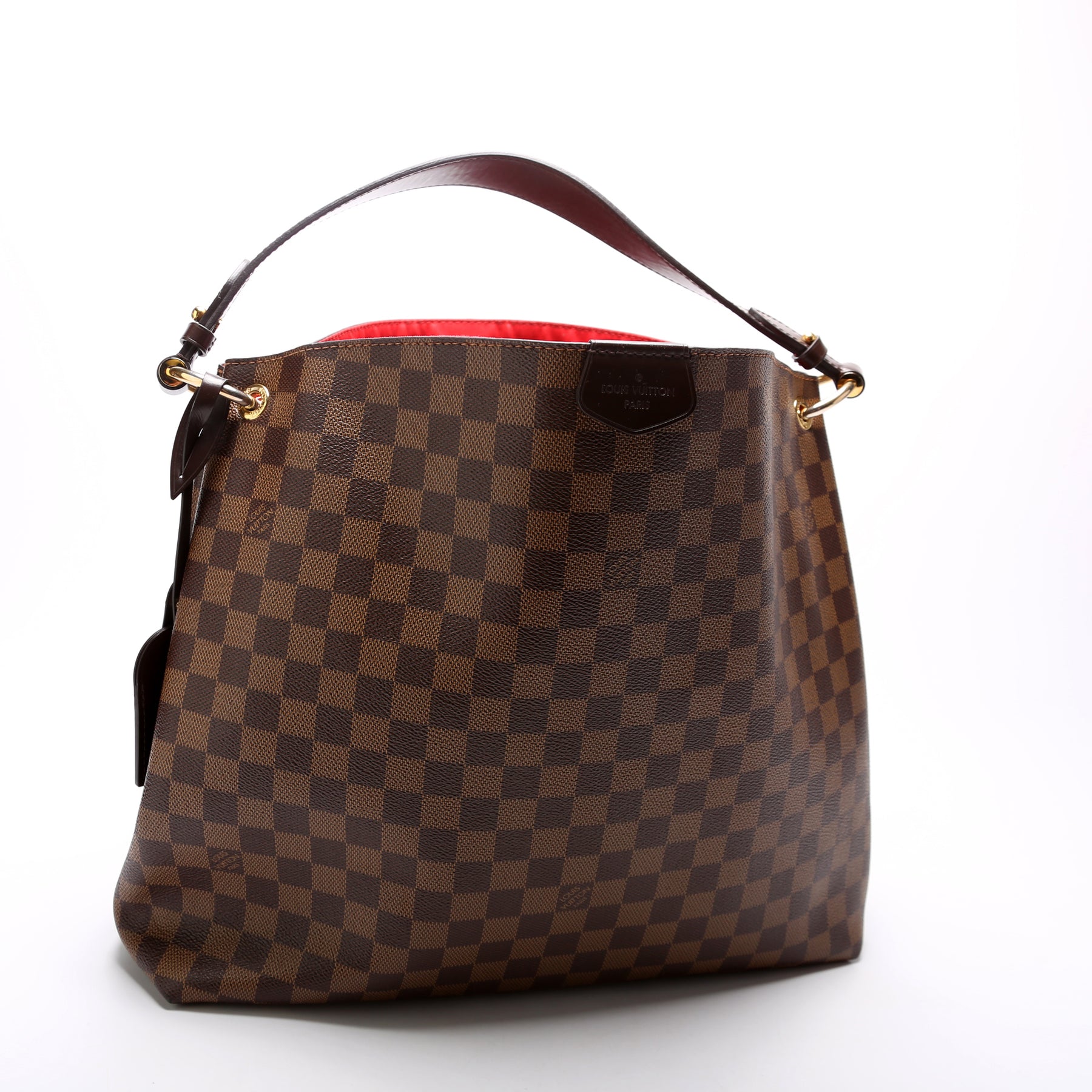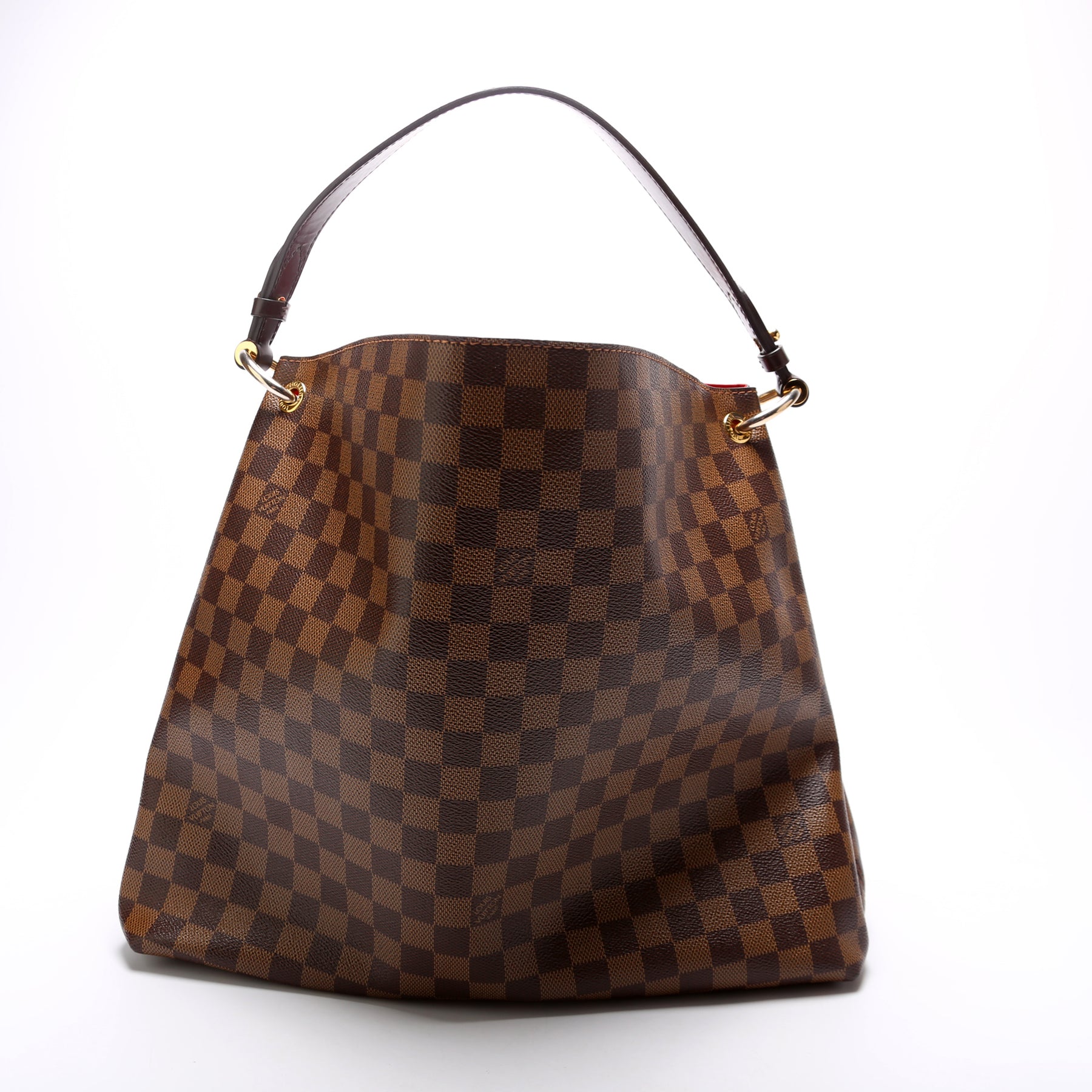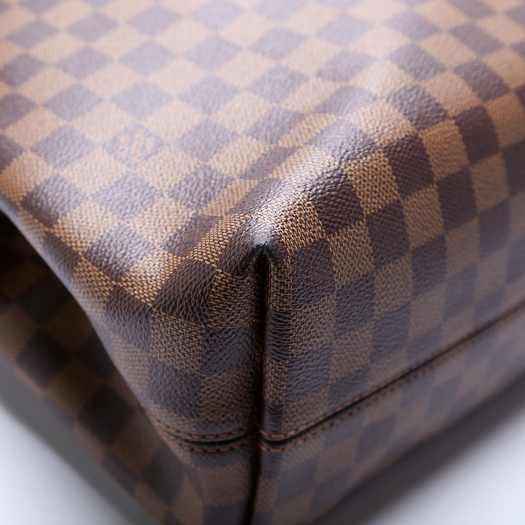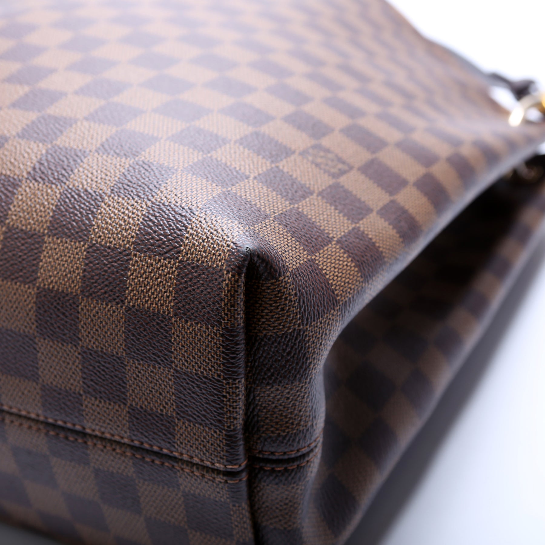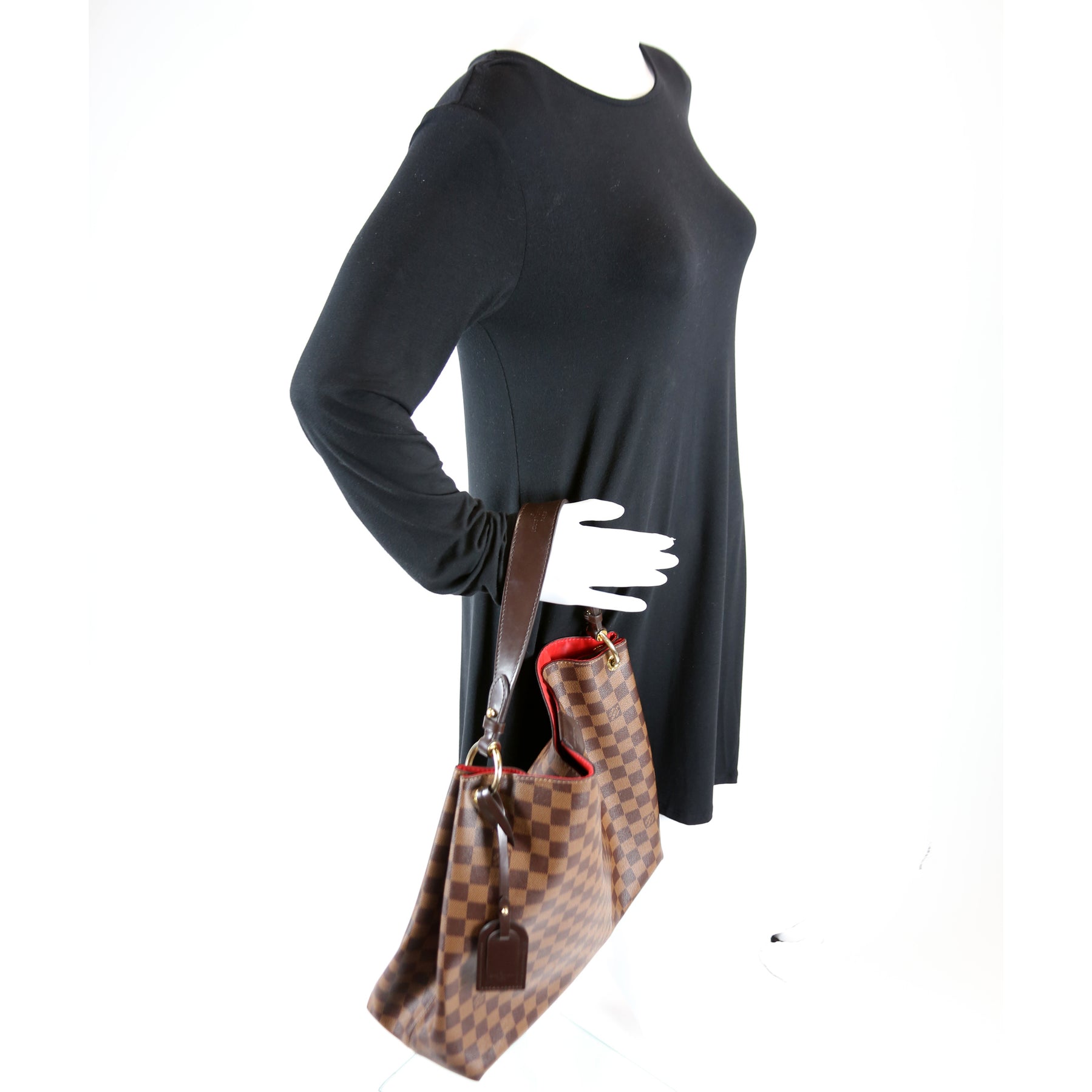 This pre-owned Louis Vuitton Graceful MM is guaranteed 100% authentic. The exterior is in the classic Louis Vuitton Damier Ebene coated canvas.