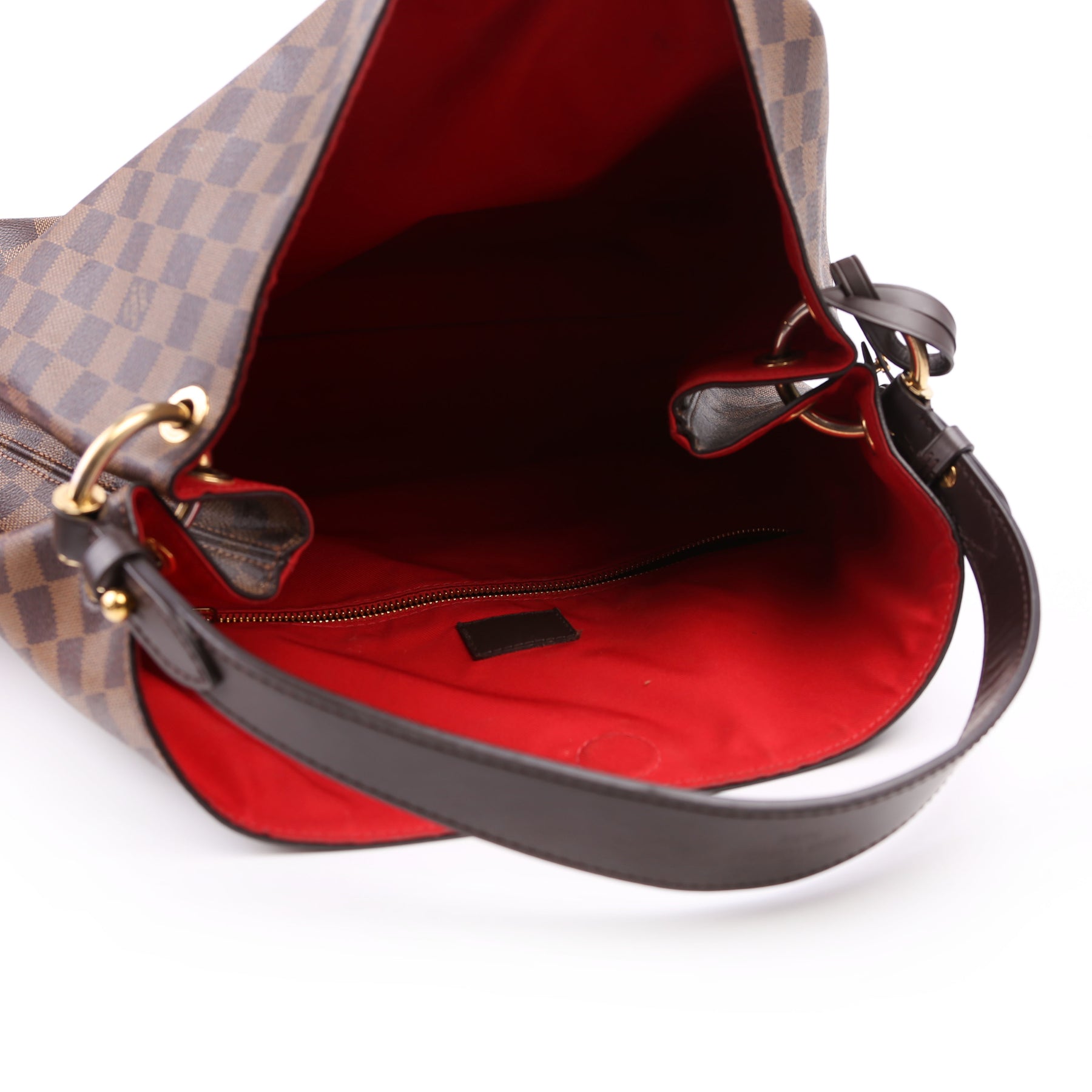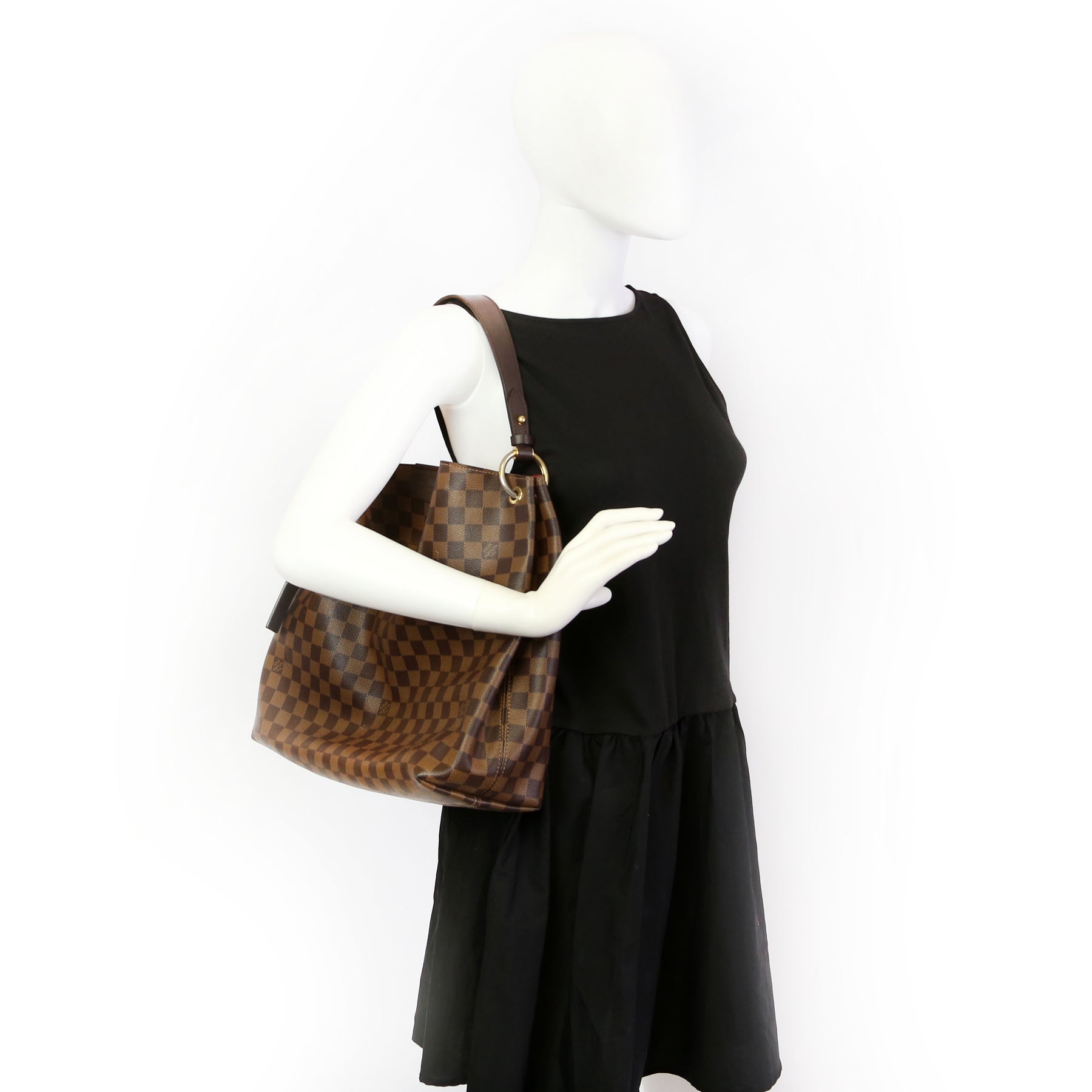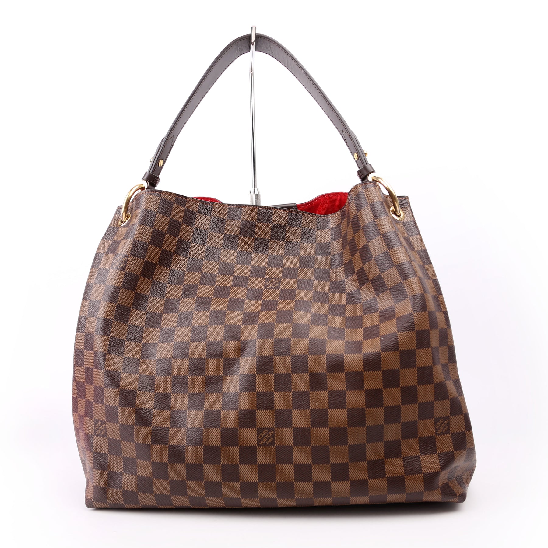 This pre-owned Louis Vuitton Graceful MM is guaranteed 100% authentic. The exterior is in the classic Louis Vuitton Damier Ebene coated canvas.