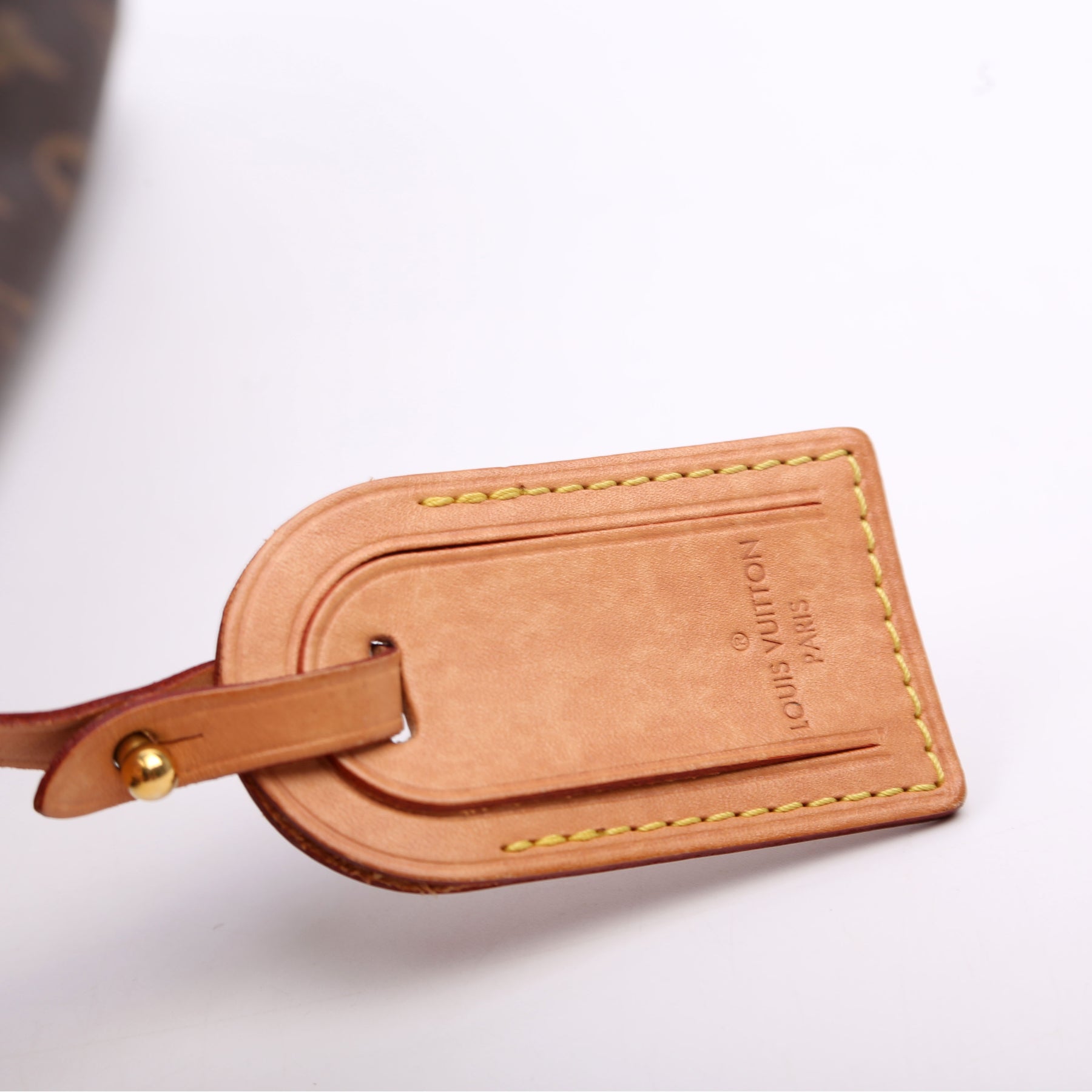 Handle: The handle shows minor wear and discoloration. The leather luggage tag shows minor wear and discoloration.