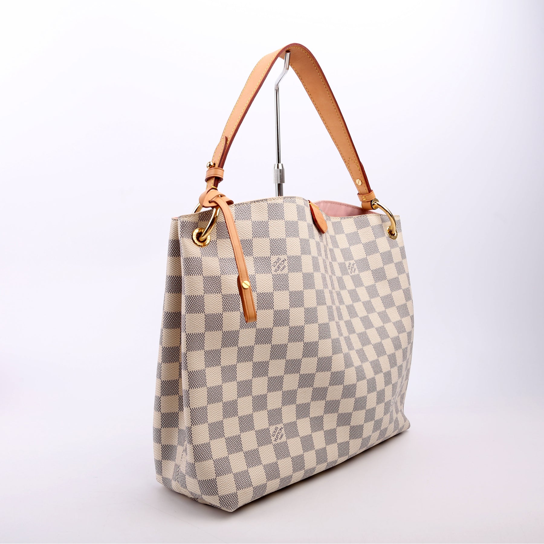 This pre-owned Louis Vuitton Graceful PM is guaranteed 100% authentic. The exterior is in the classic Louis Vuitton Damier Azur coated canvas.