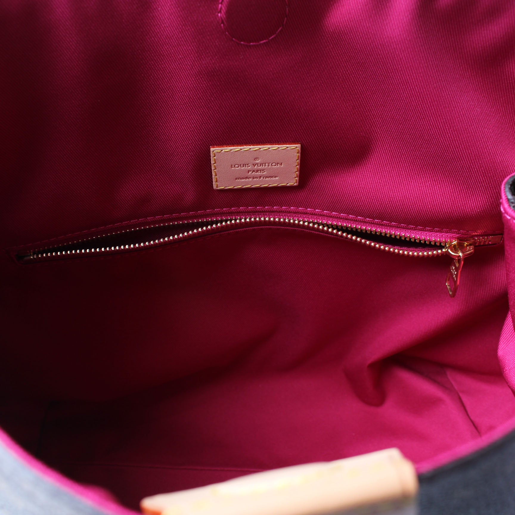 Interior: The interior is free of rips or tears. The interior features one zip closure pocket.