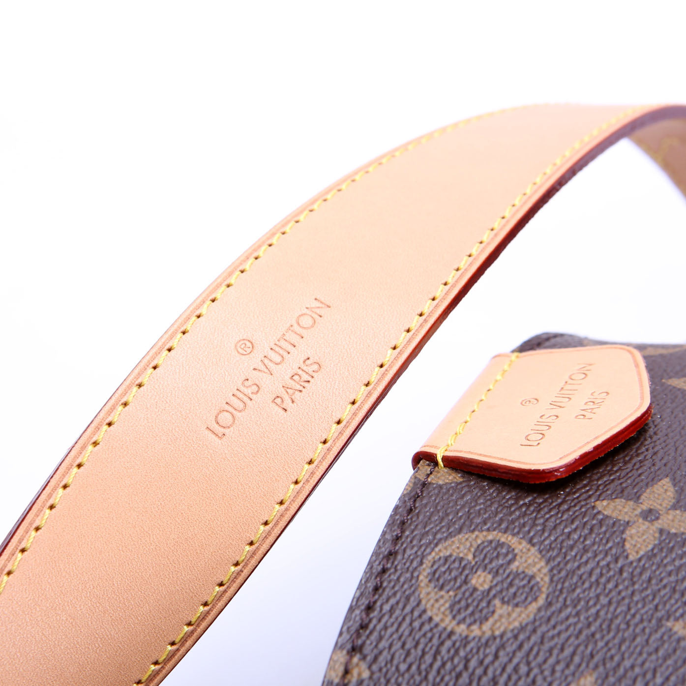 Handle: The leather handle shows minor wear, discoloration, and scratching.
