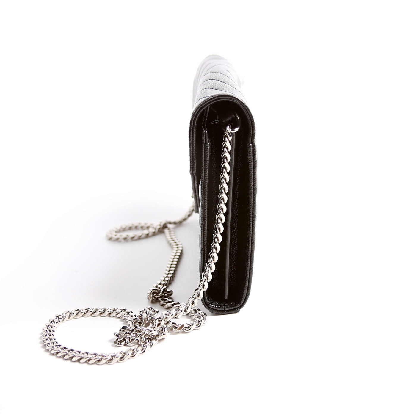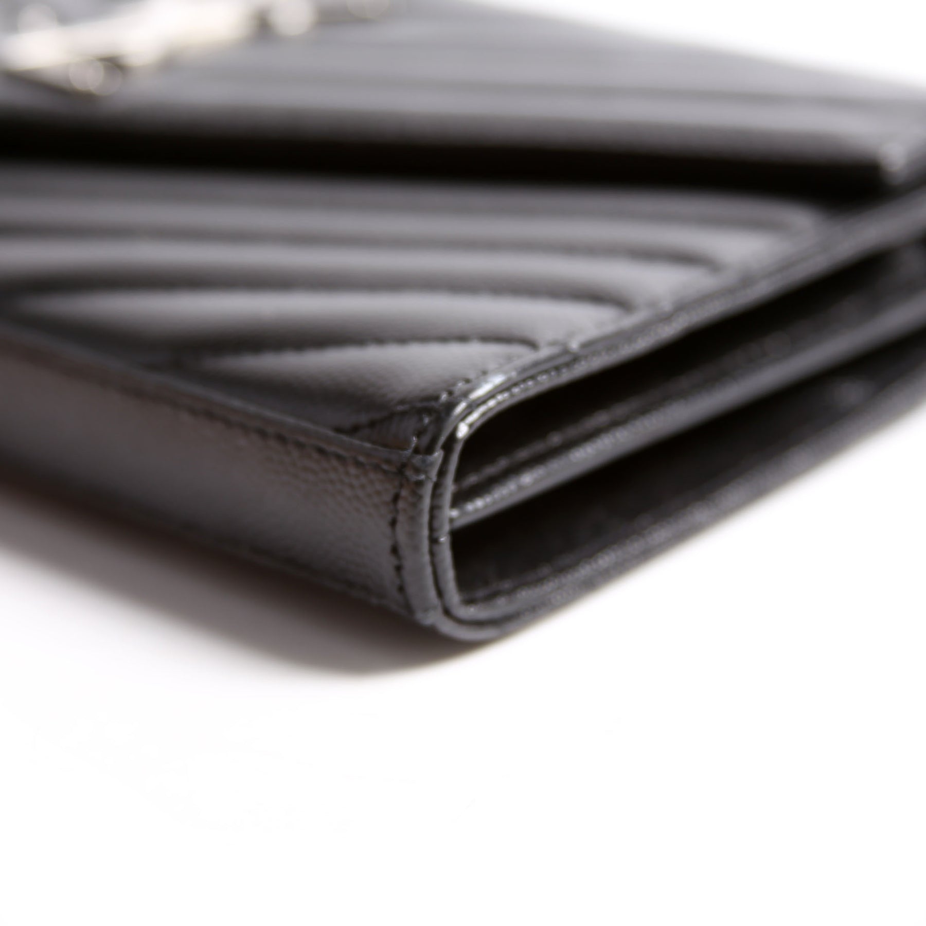 This pre-owned Saint Laurent Grain De Chain Wallet is guaranteed 100% authentic. The exterior is in the classic Saint Laurent Grain De Poudre leather.