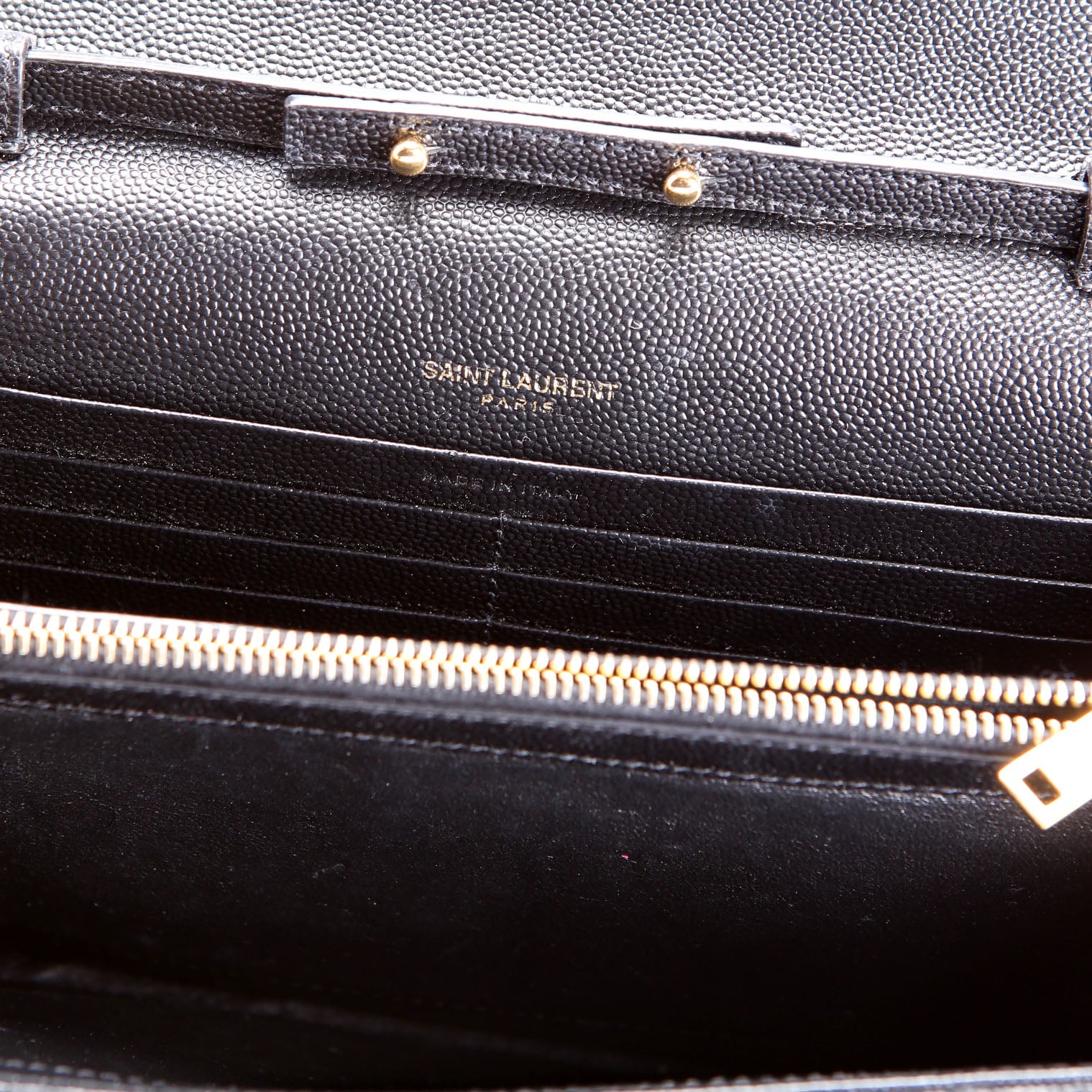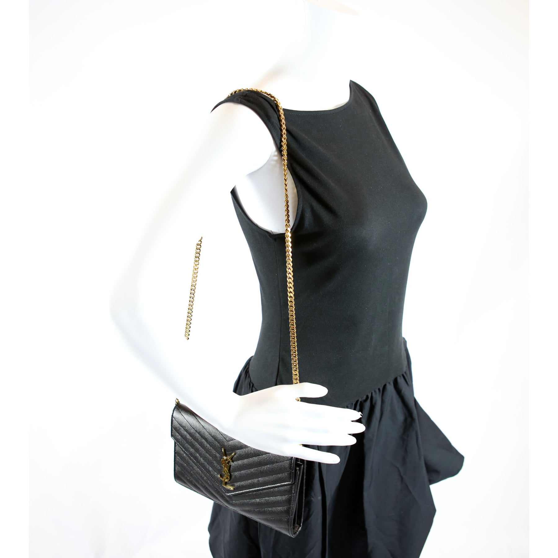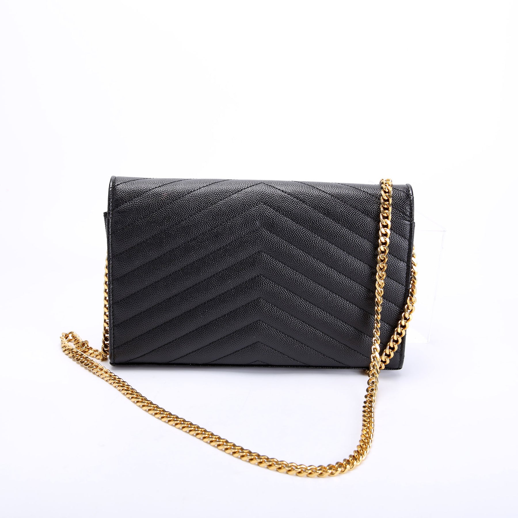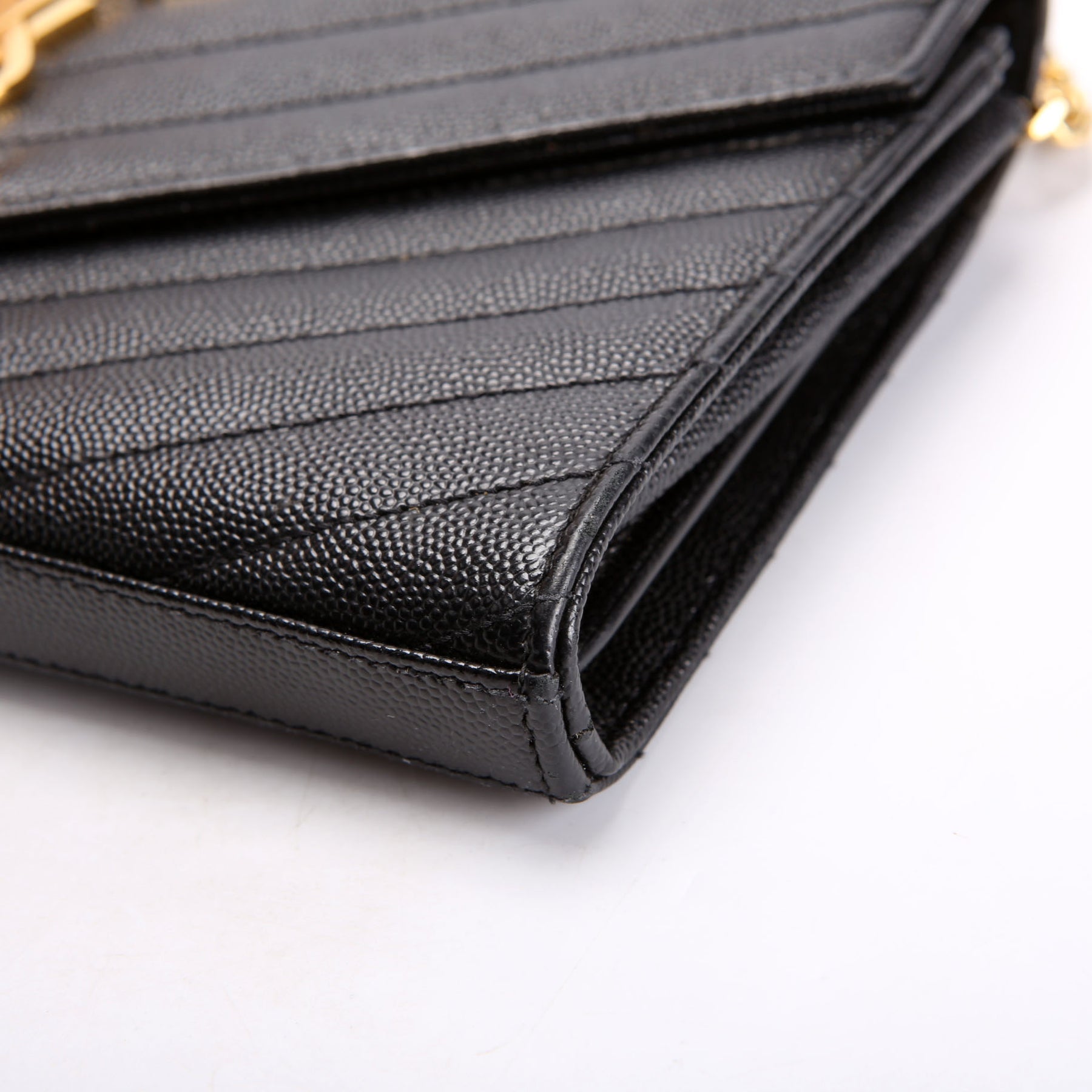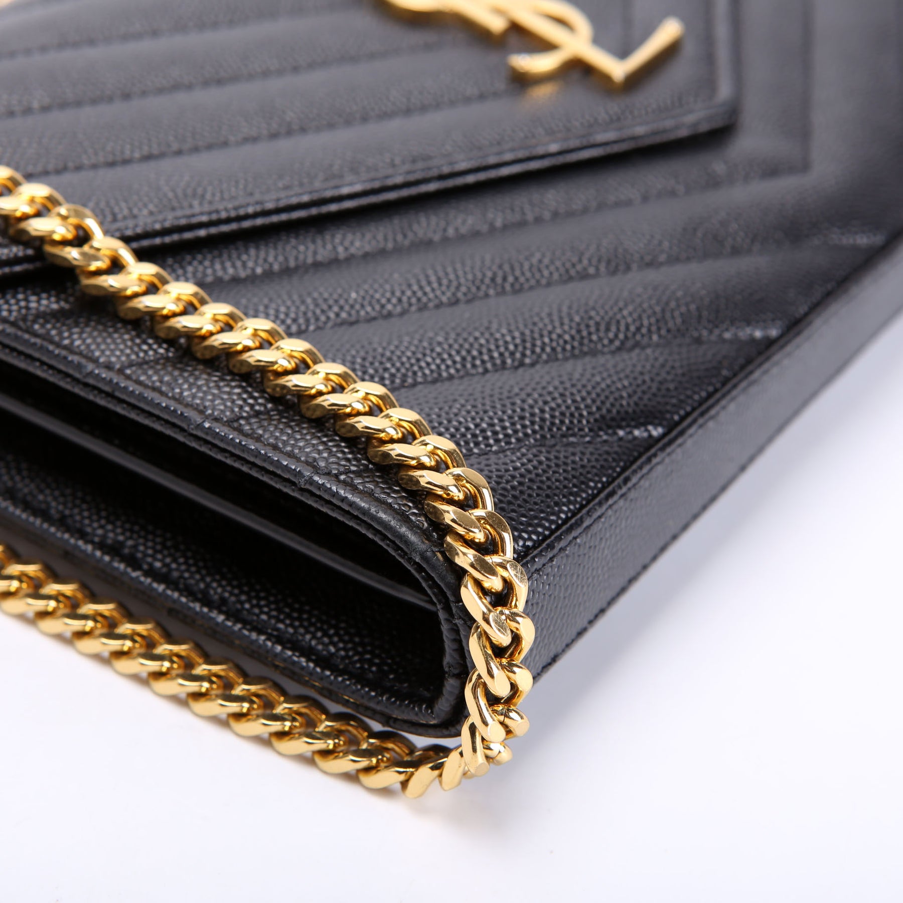 This pre-owned Saint Laurent Chain Wallet is guaranteed 100% authentic. The exterior is in the classic Saint Laurent Grain De Poudre leather.