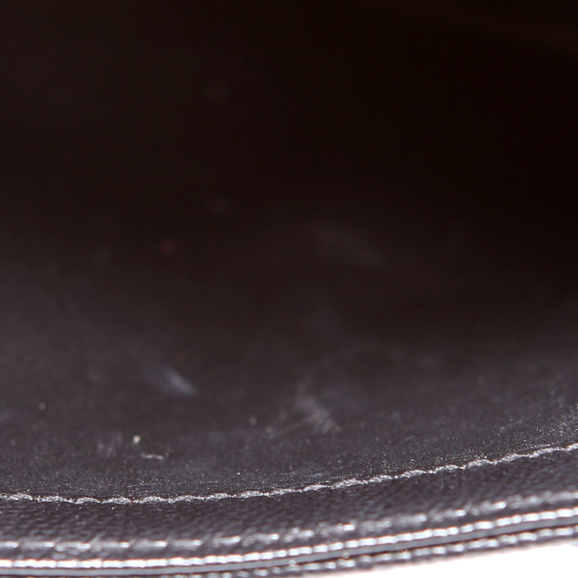 Interior: The interior shows light scuffs and scratches to the leather. It features ten card slots, two open sections, one open pocket, and one zip closure pocket.