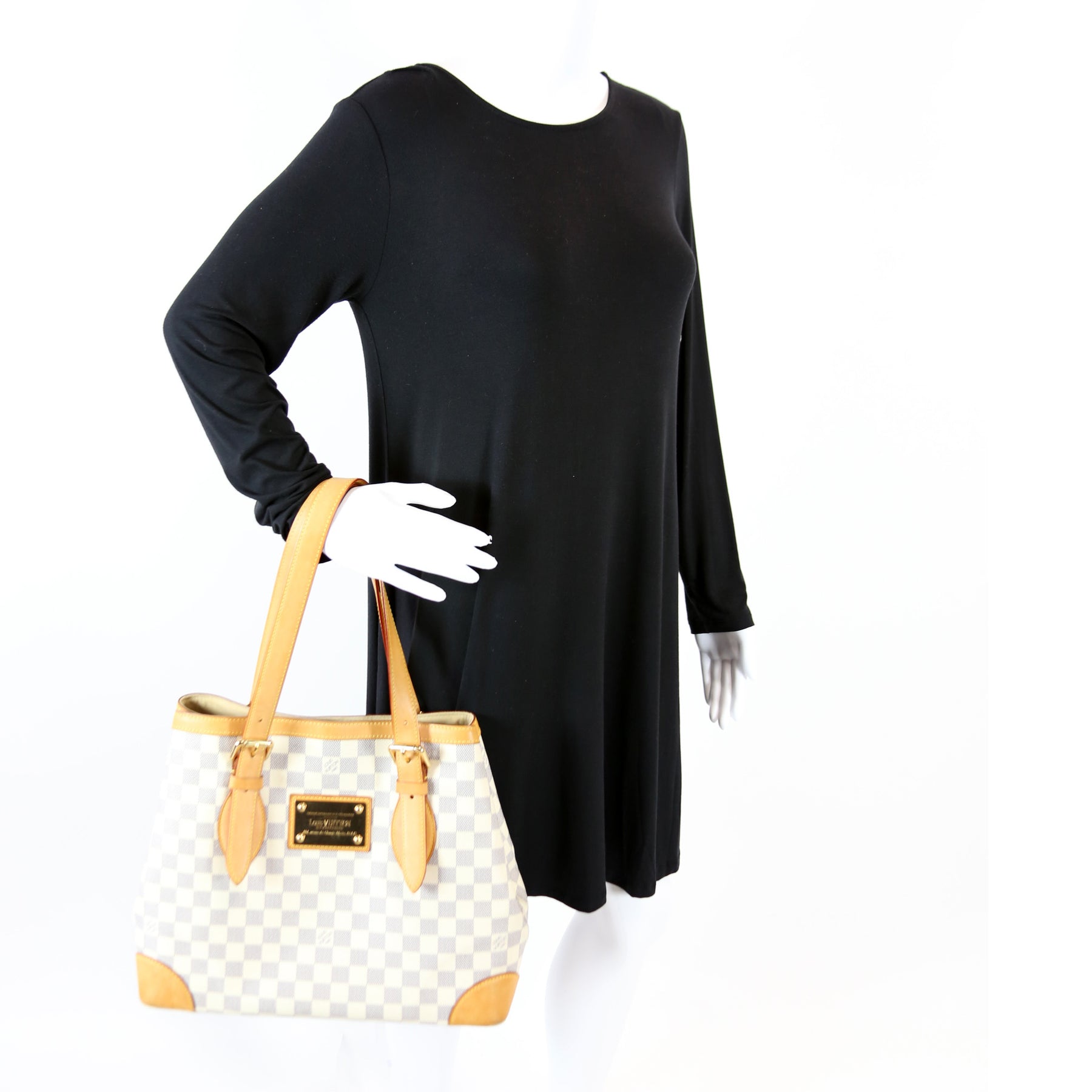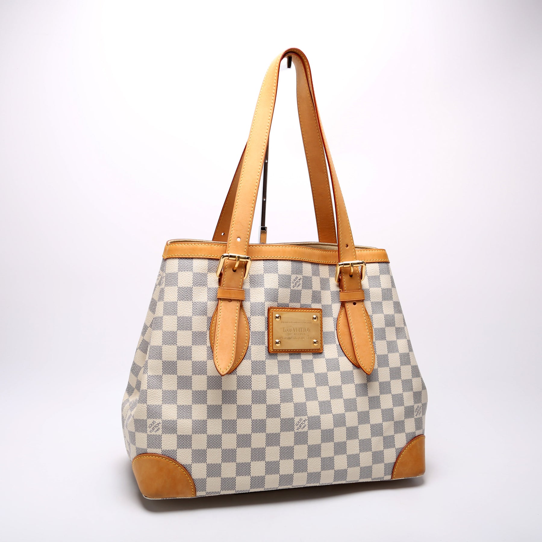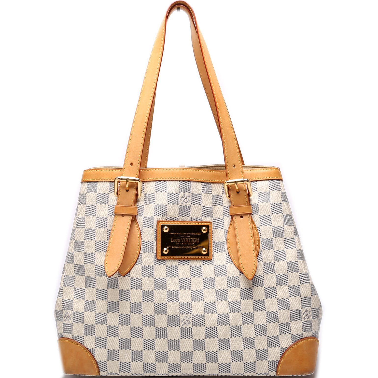 This pre-owned Louis Vuitton Hampstead MM is guaranteed 100% authentic. The exterior is in the classic Louis Vuitton Damier Azur coated canvas.