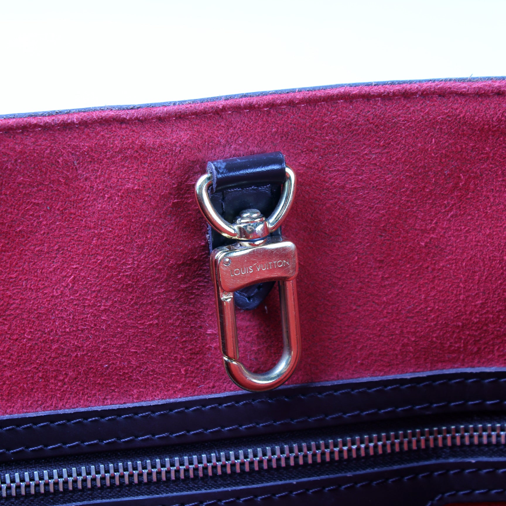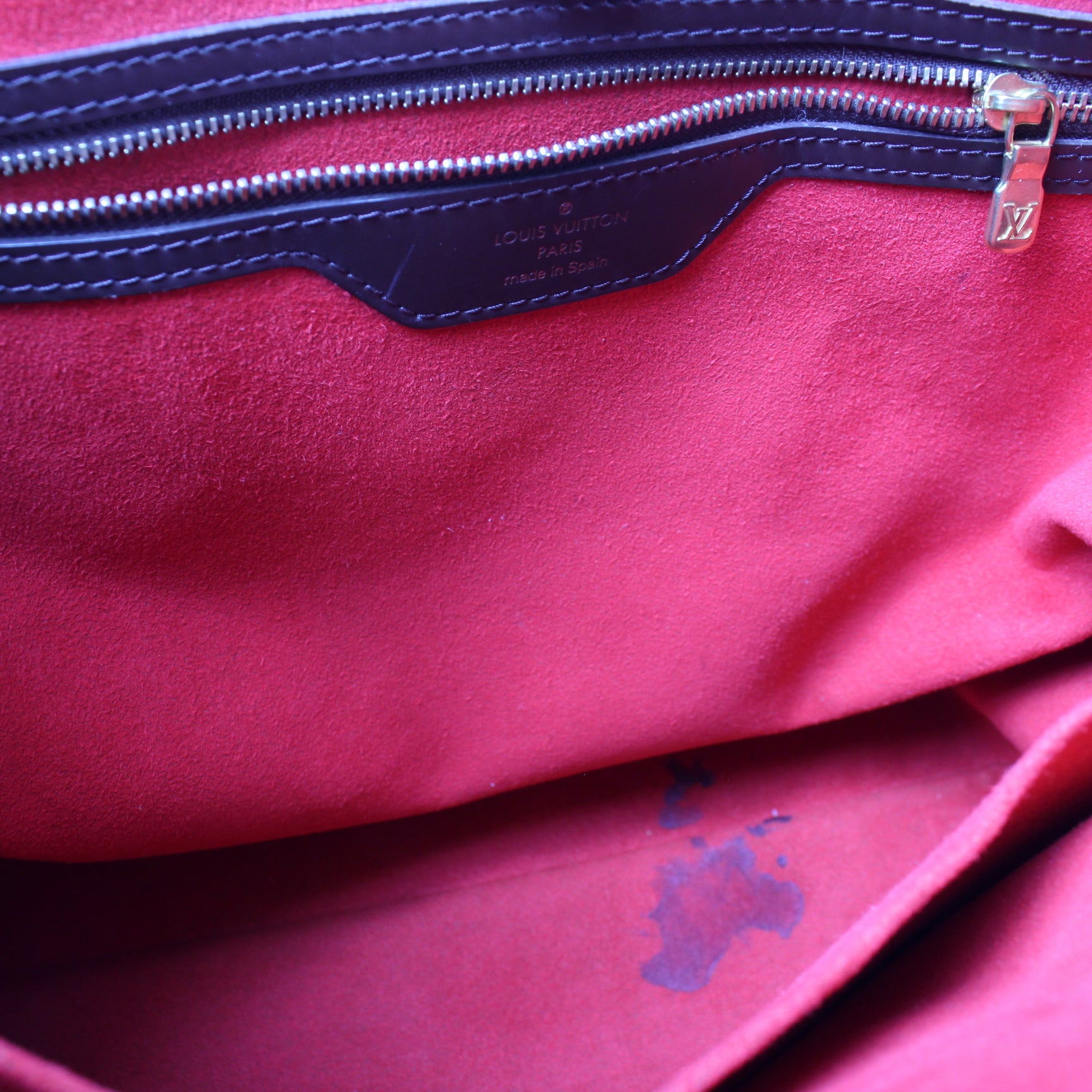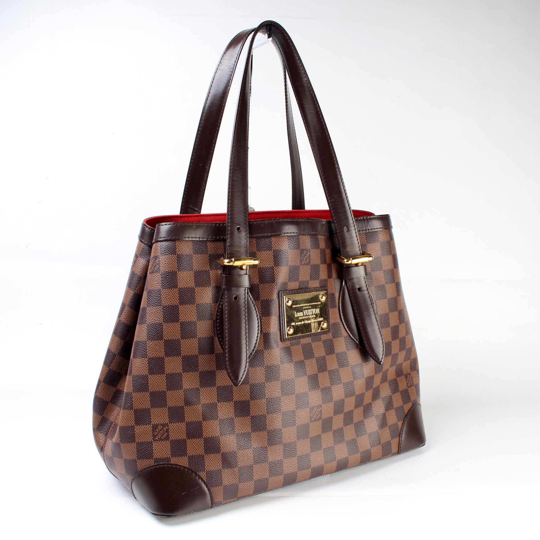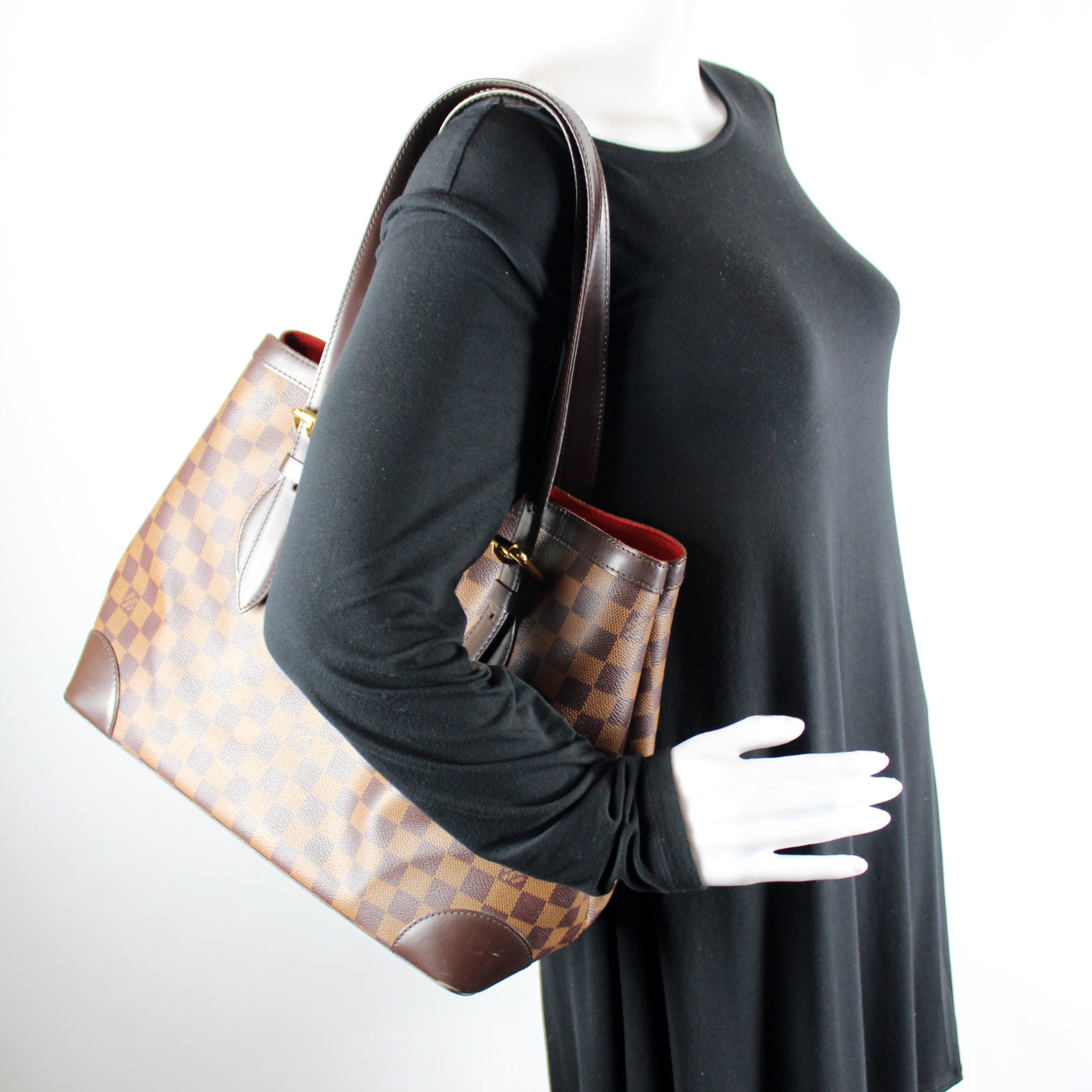 This pre-owned Louis Vuitton Hampstead MM is guaranteed 100% authentic. The exterior is in the classic Louis Vuitton Damier Ebene coated canvas.