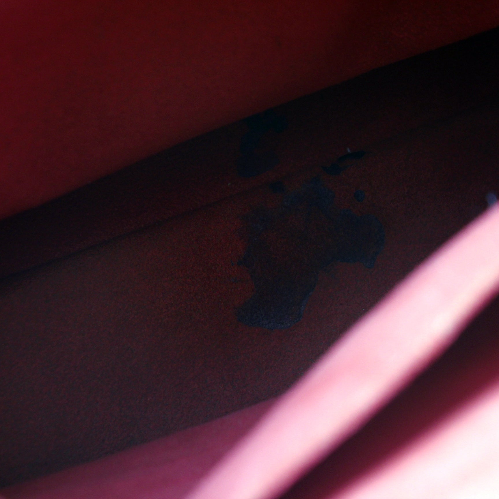 Interior: The interior has a large stain on the bottom, and is free of rips or tears. The interior features two open pockets and one zip closure pocket.