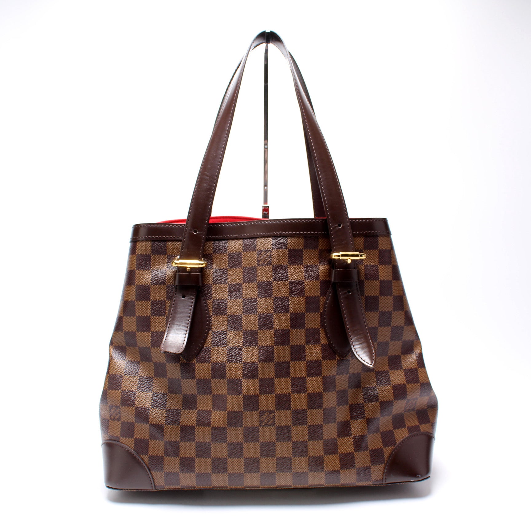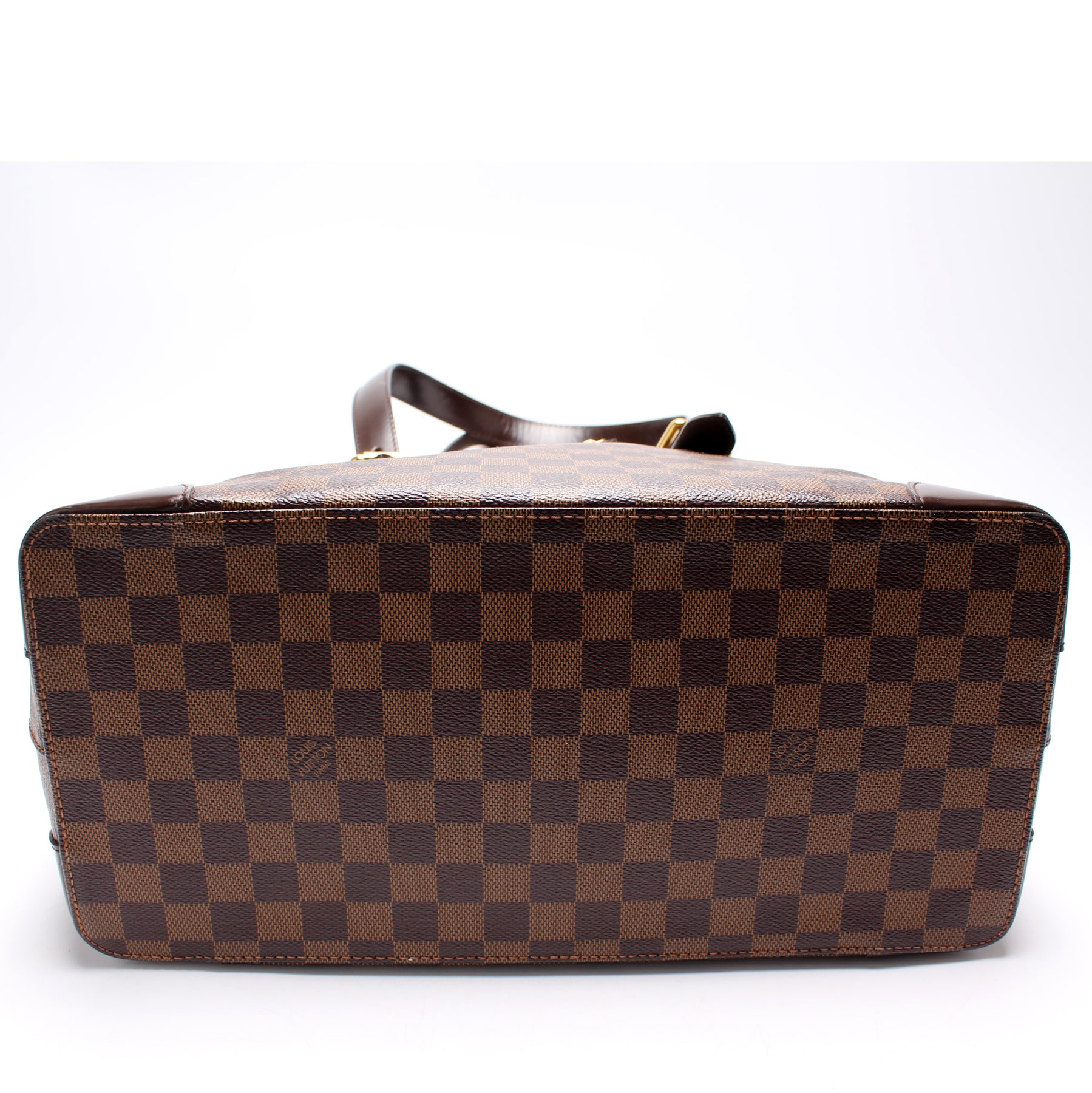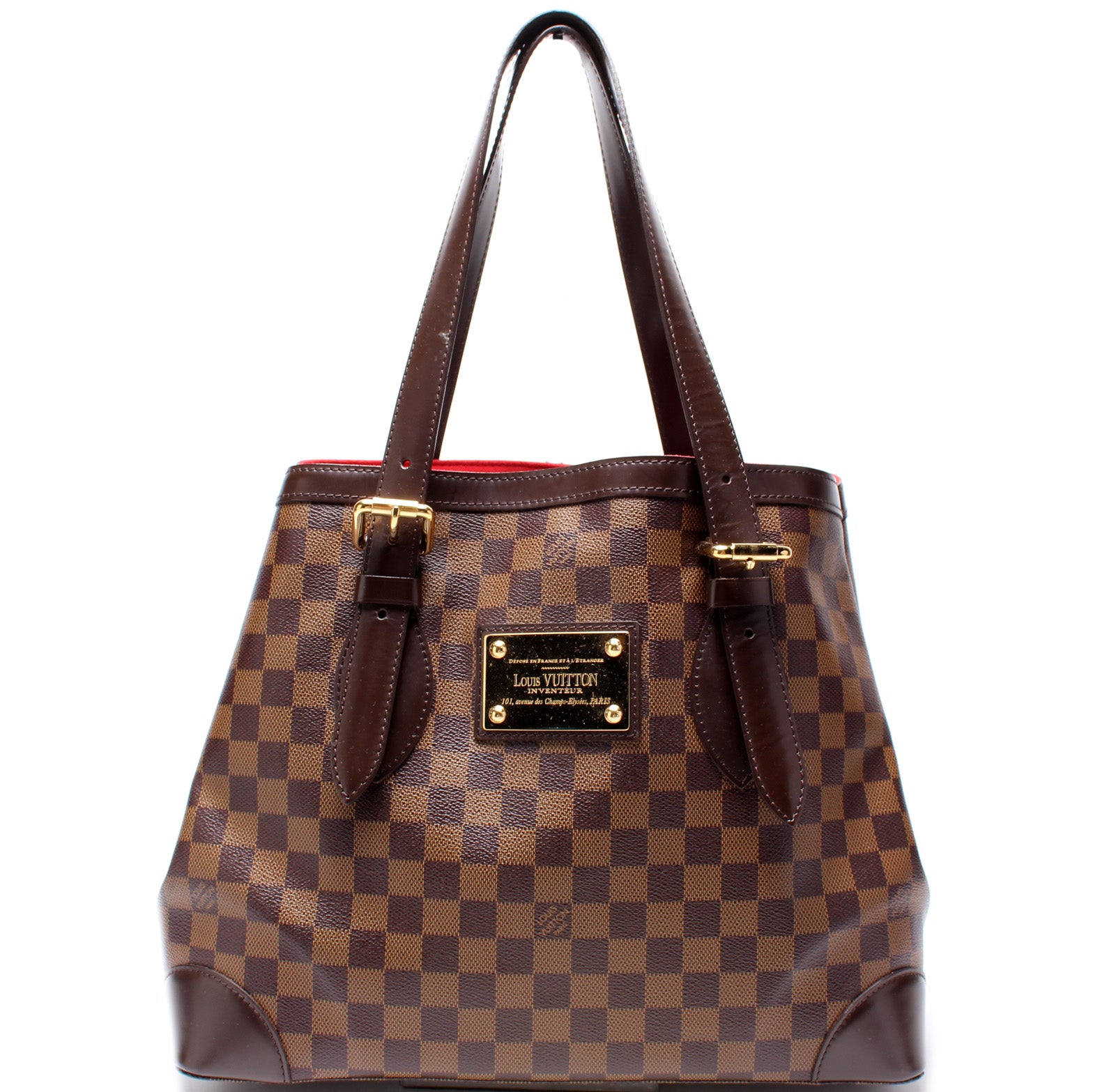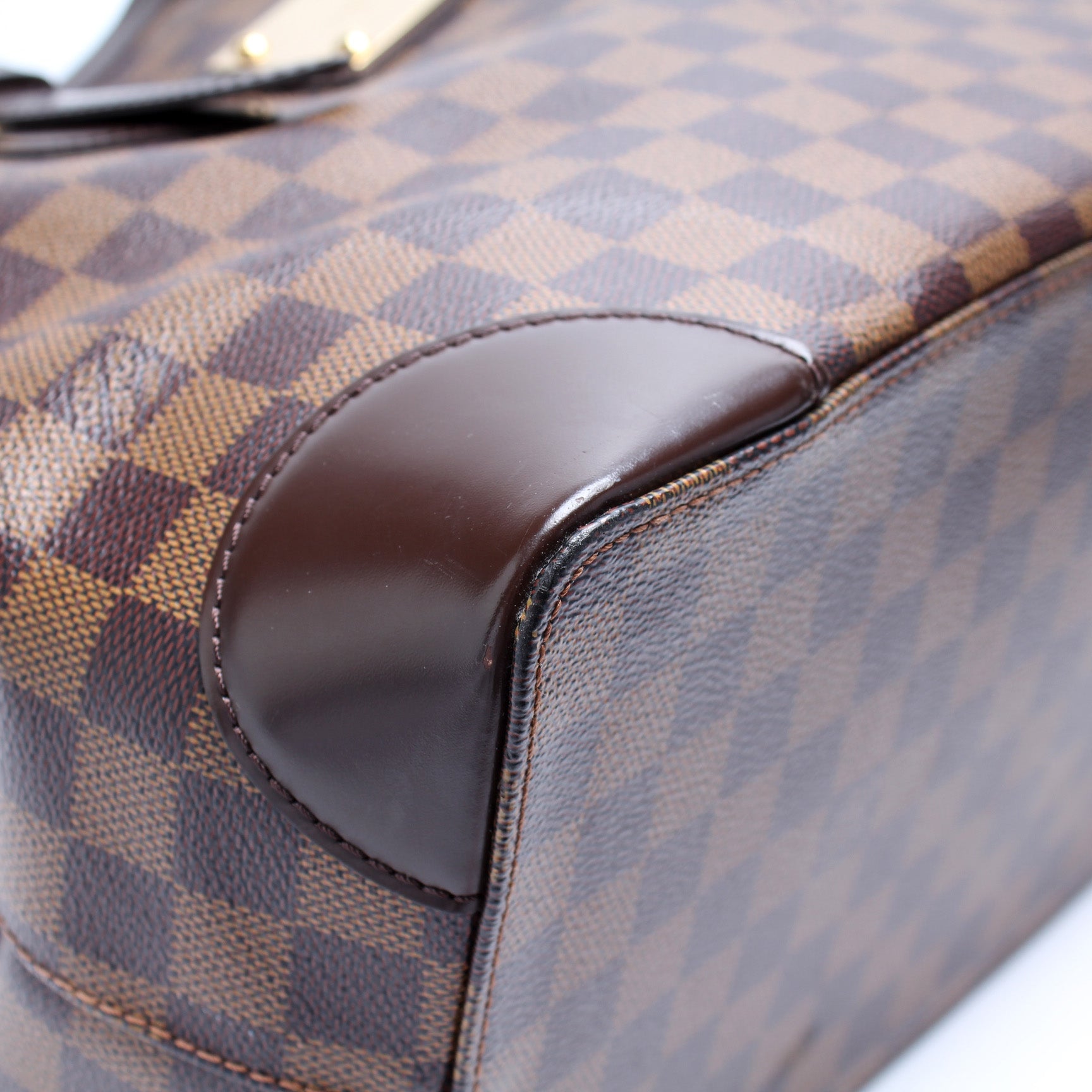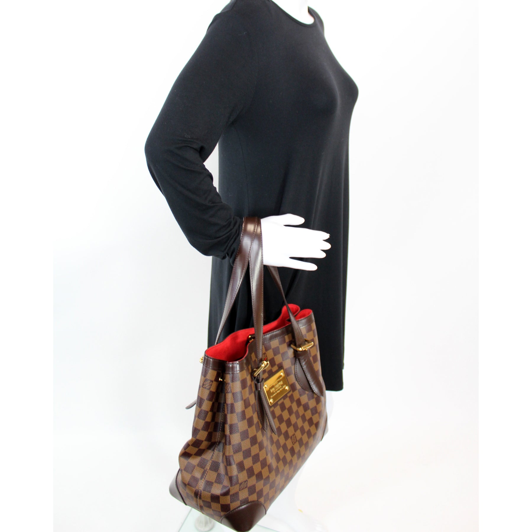This pre-owned Louis Vuitton Hampstead MM is guaranteed 100% authentic. The exterior is in the classic Louis Vuitton Damier Ebene coated canvas.