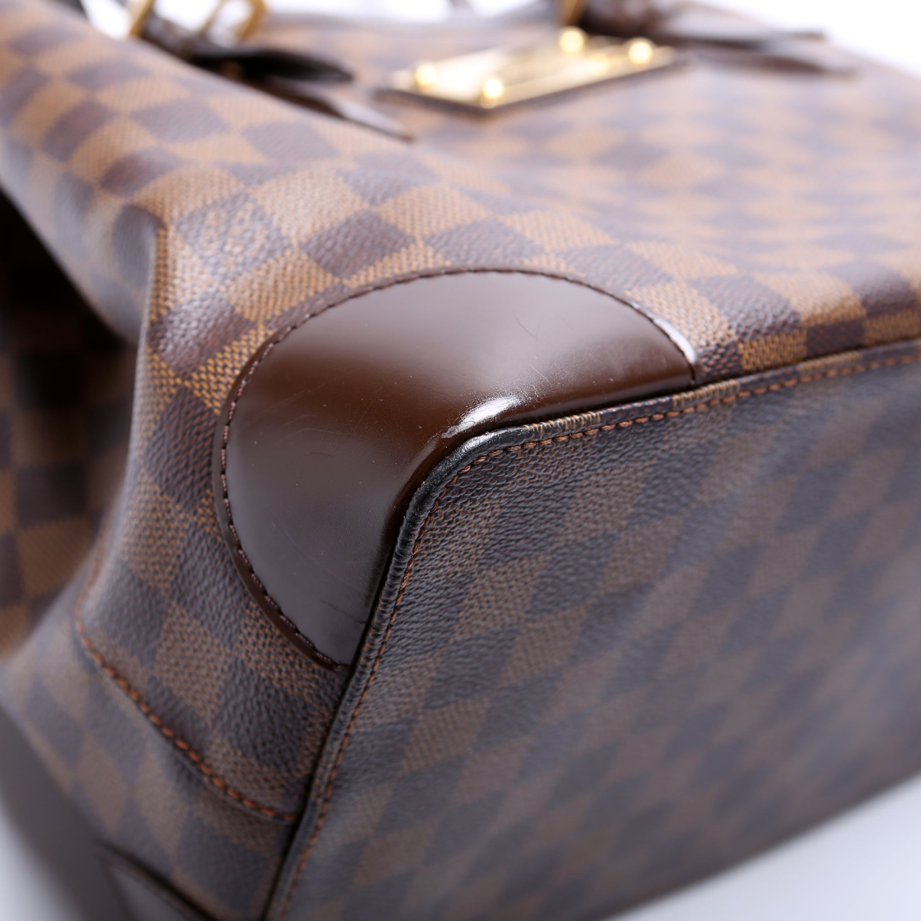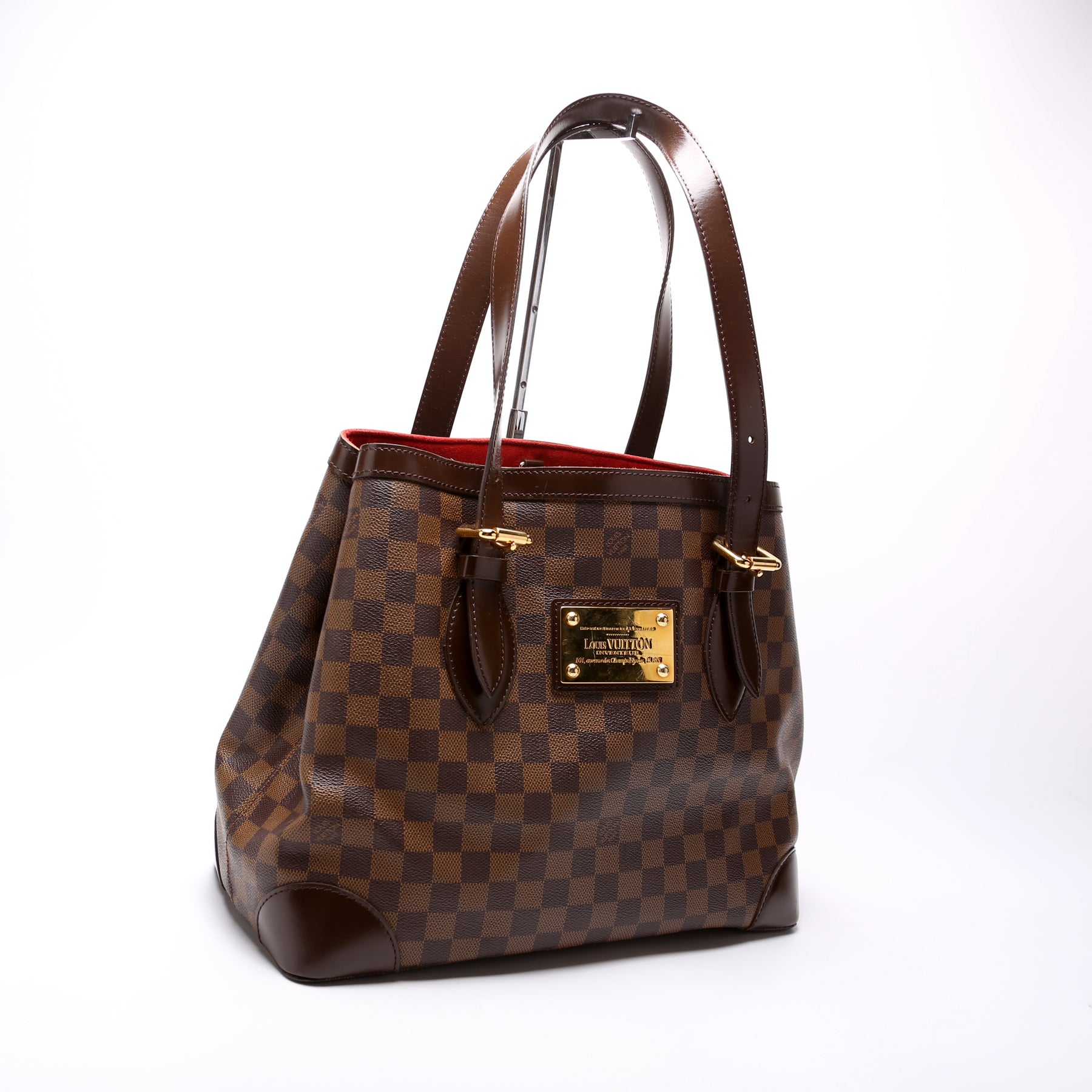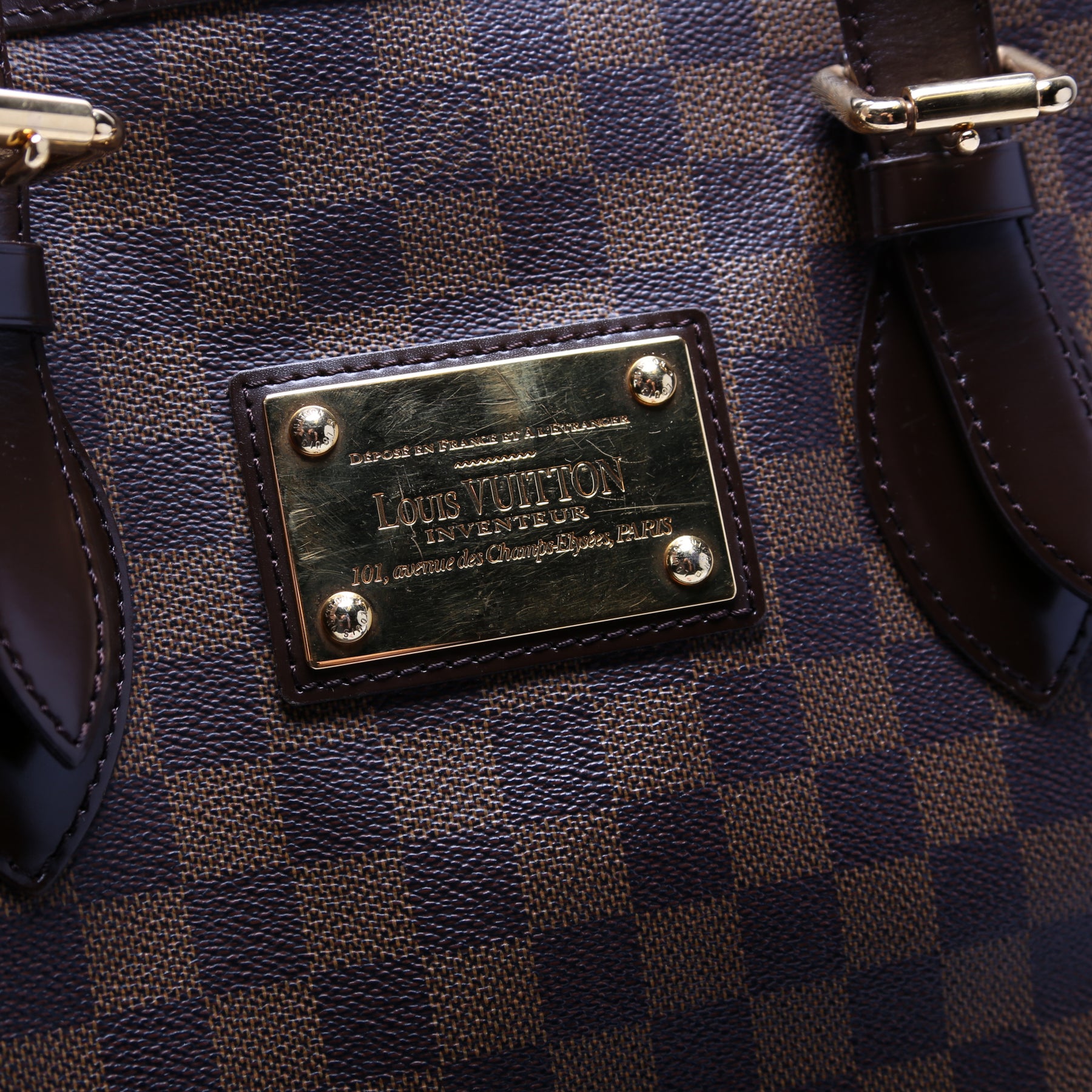 This pre-owned Louis Vuitton Hampstead MM is guaranteed 100% authentic. The exterior is in the classic Louis Vuitton Damier Ebene coated canvas.