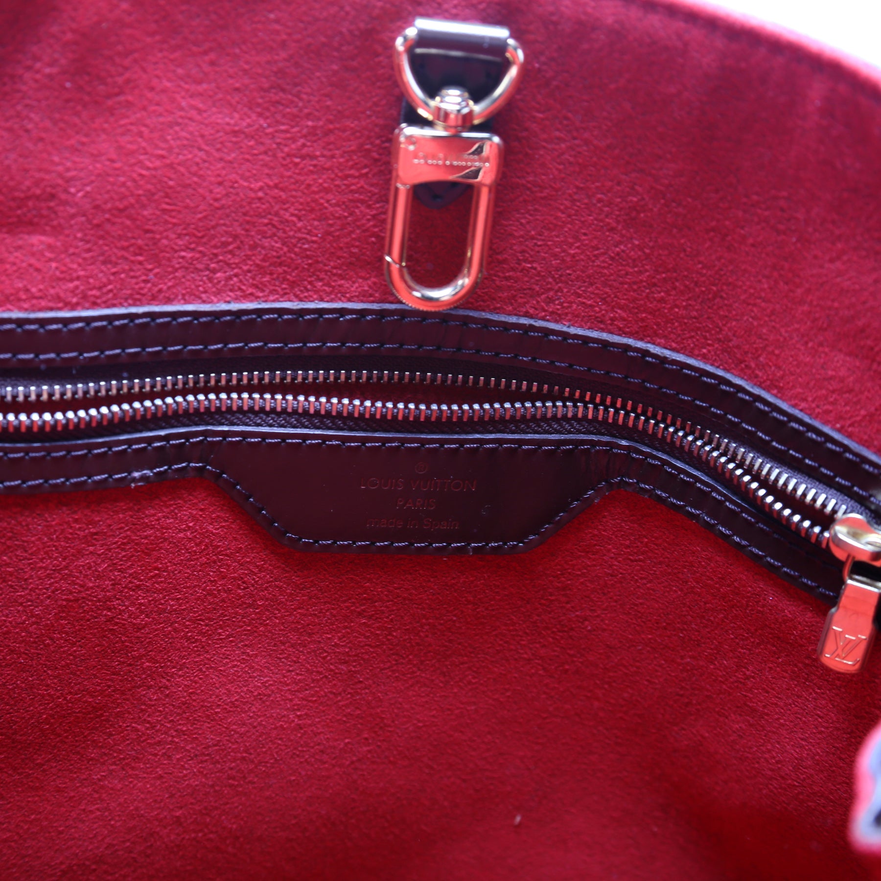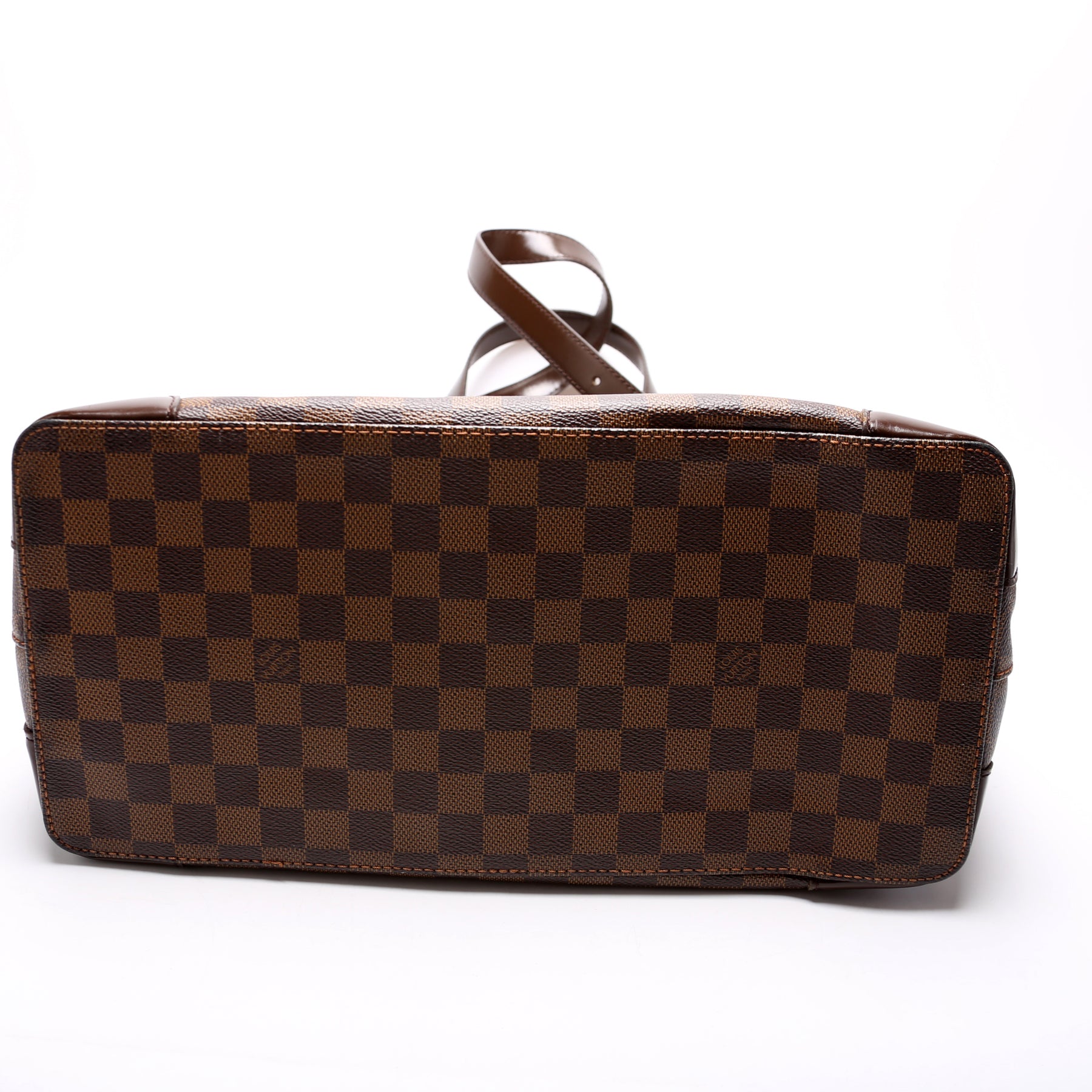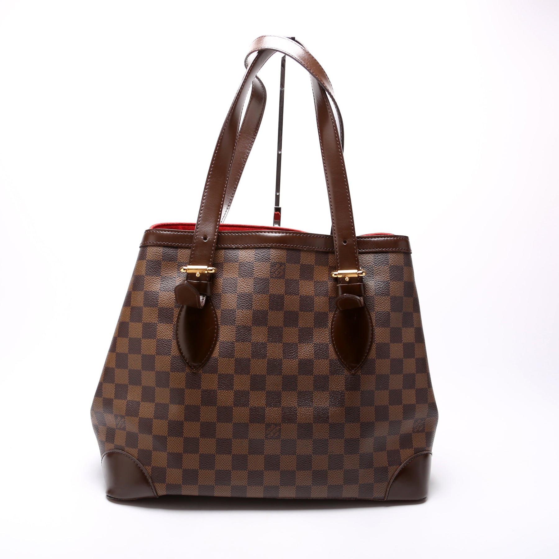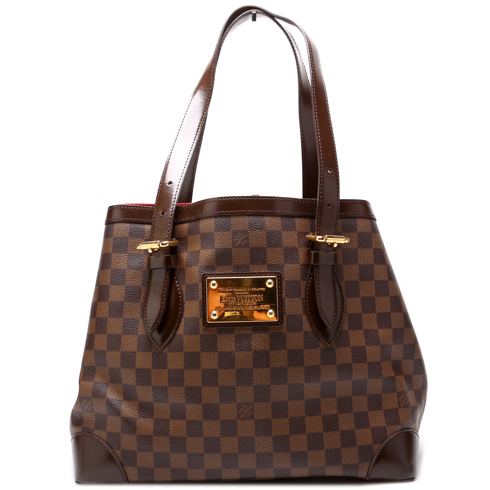 This pre-owned Louis Vuitton Hampstead MM is guaranteed 100% authentic. The exterior is in the classic Louis Vuitton Damier Ebene coated canvas.