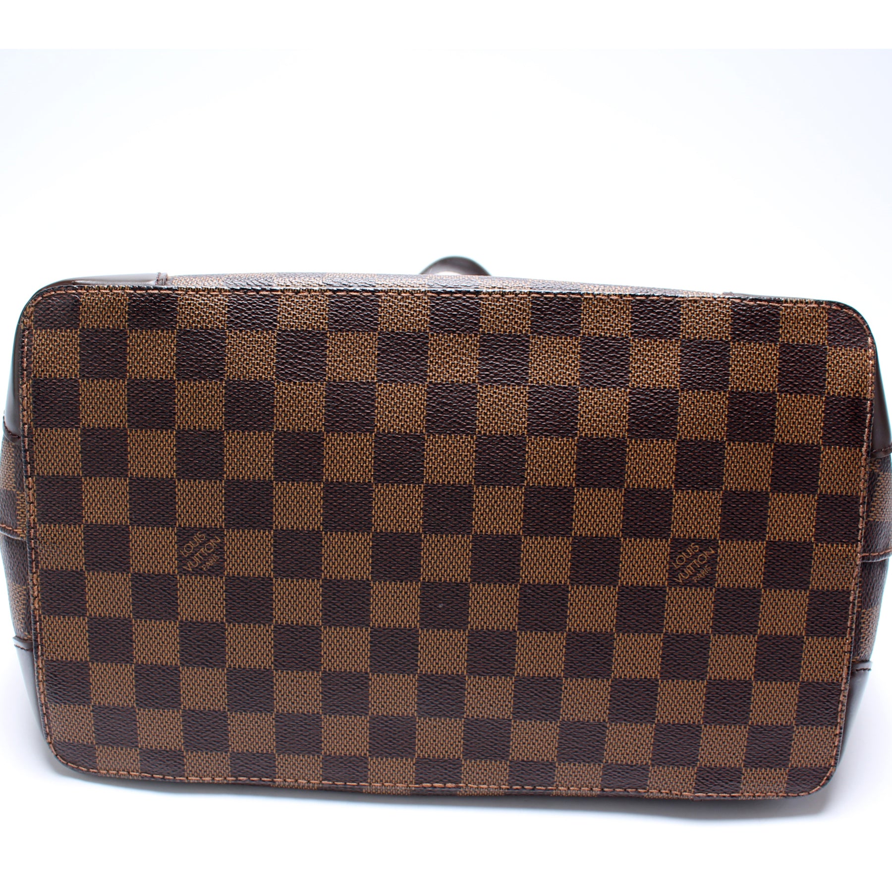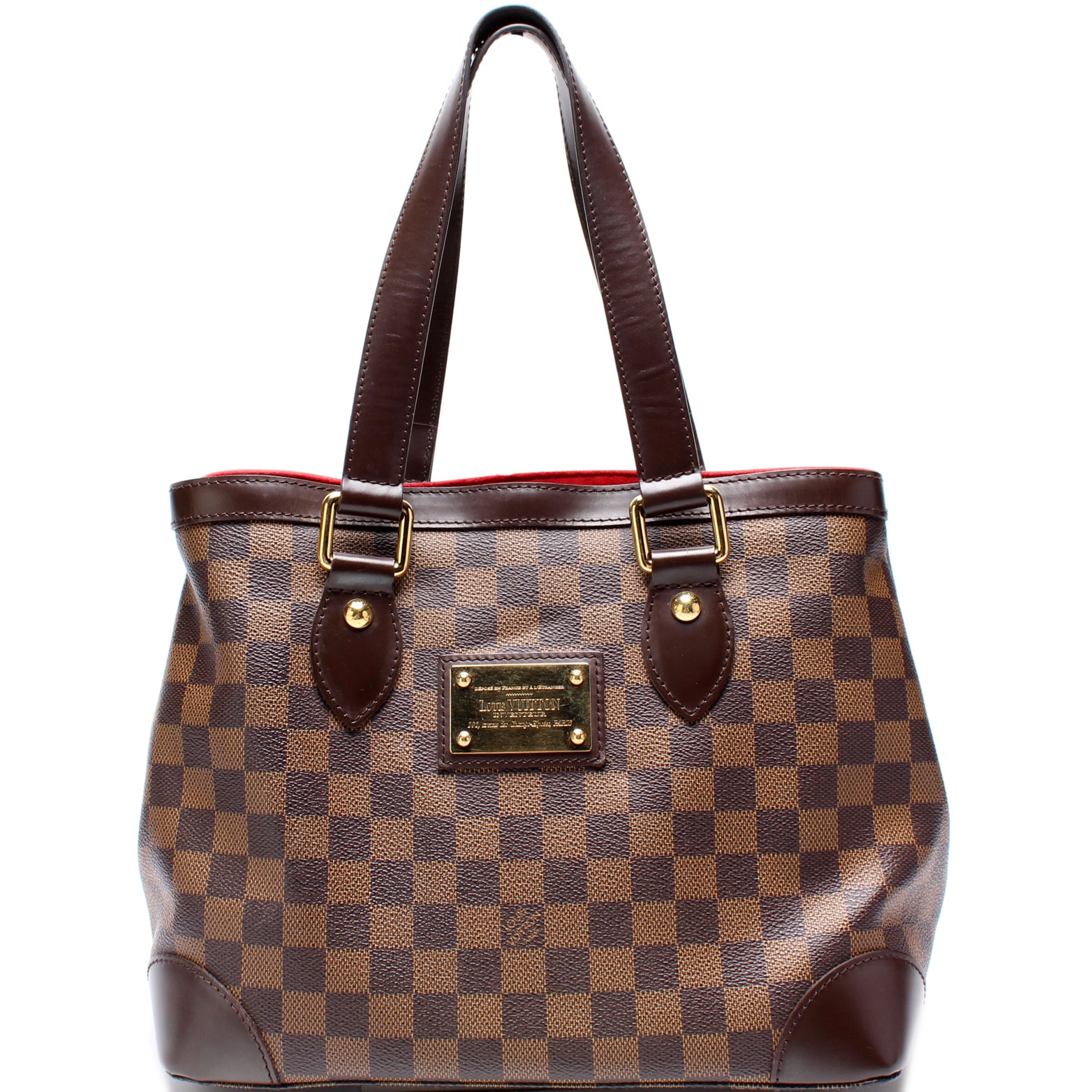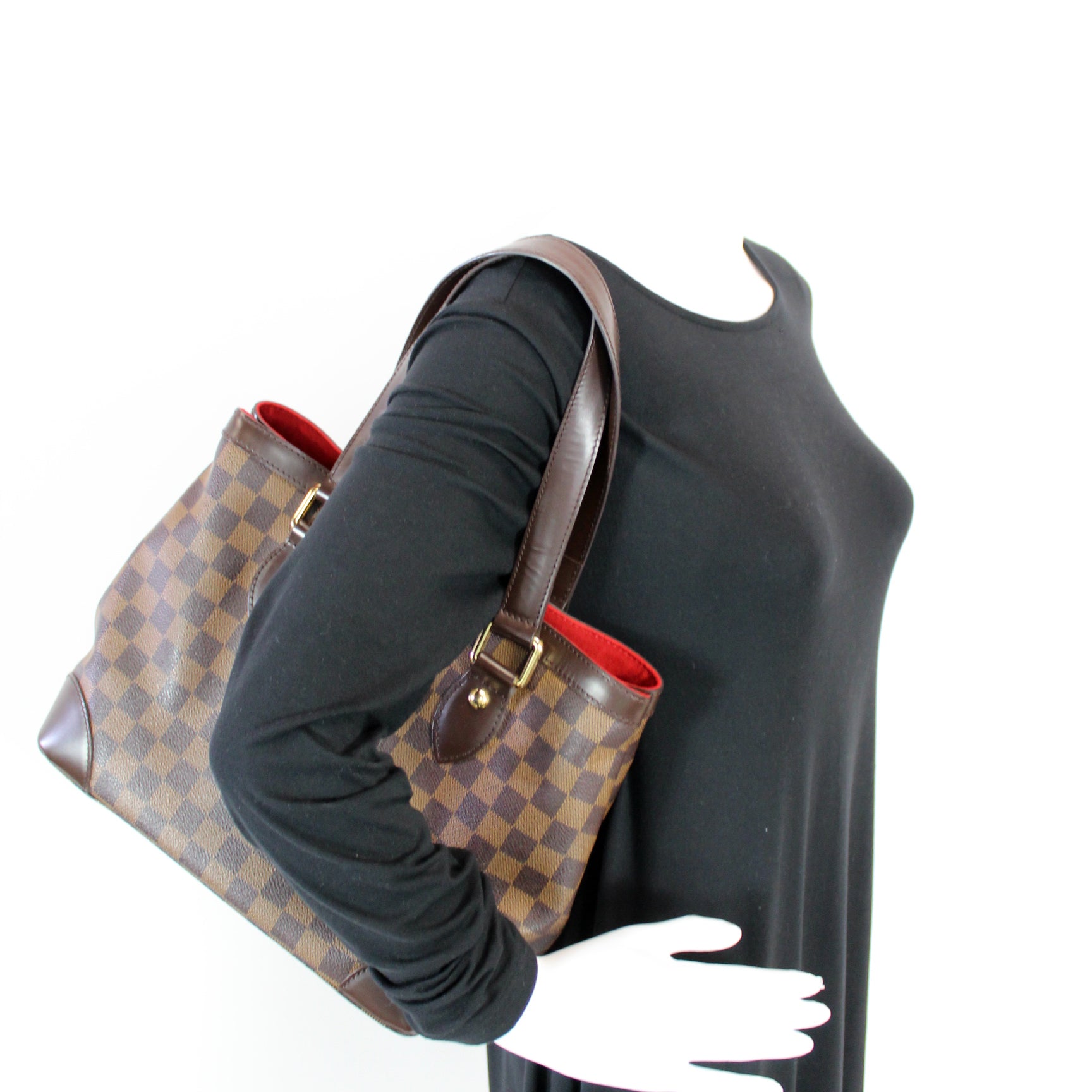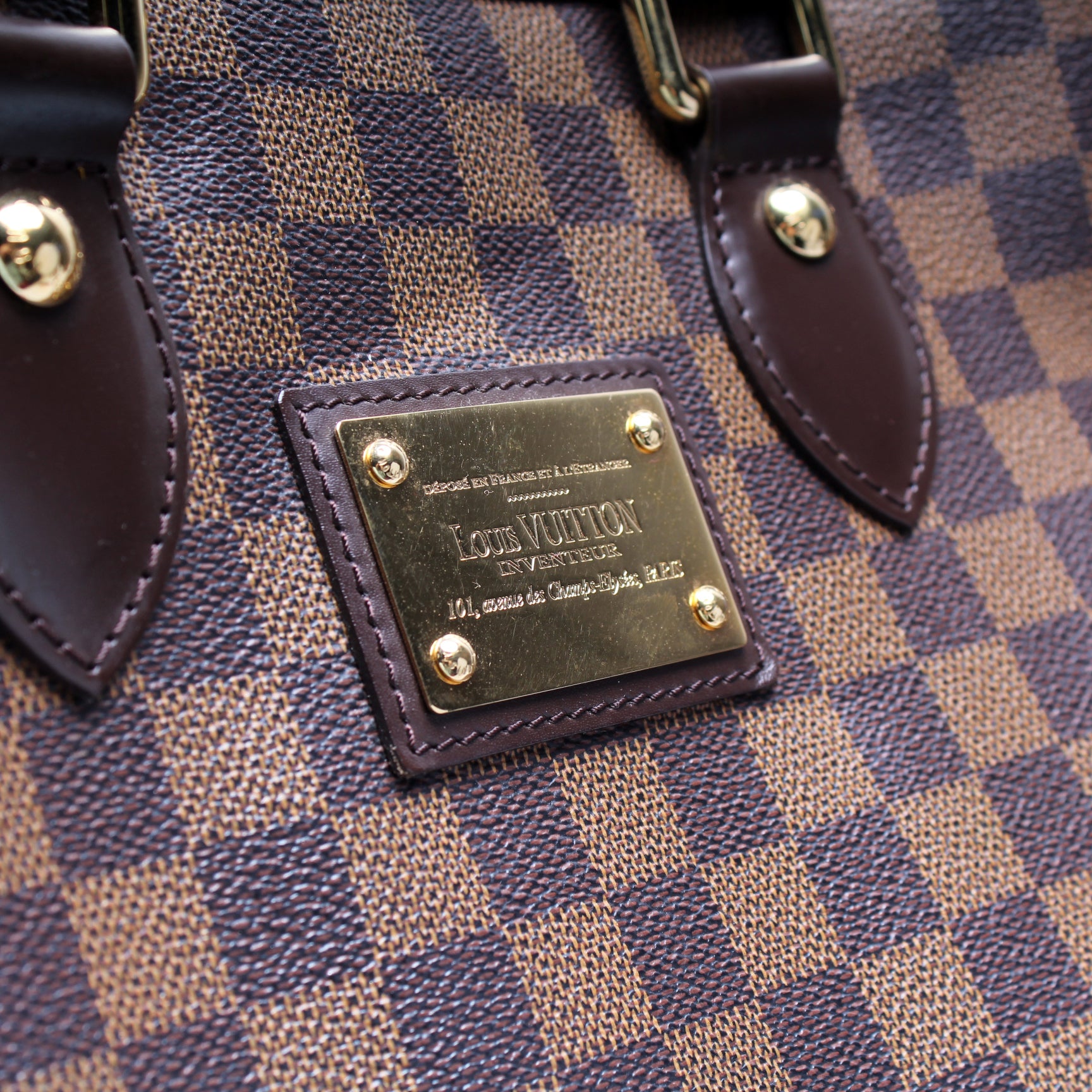 This pre-owned Louis Vuitton Hampstead PM is guaranteed 100% authentic. The exterior is in the classic Louis Vuitton Damier Ebene coated canvas.