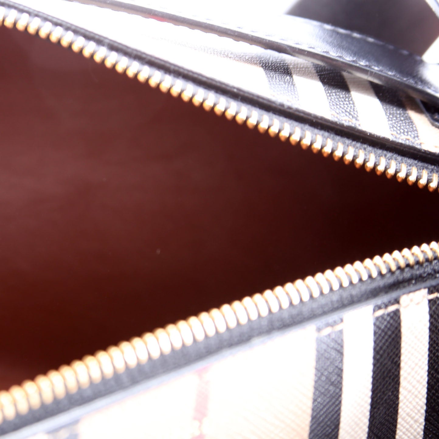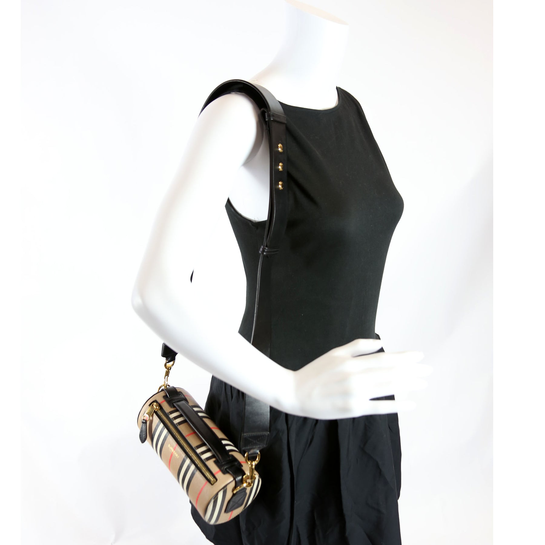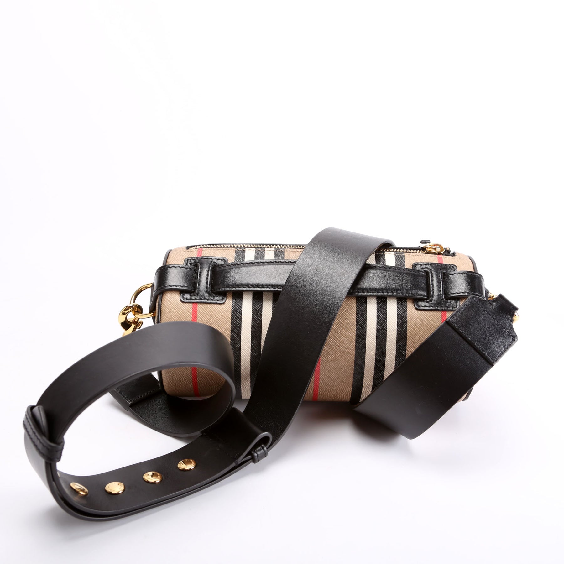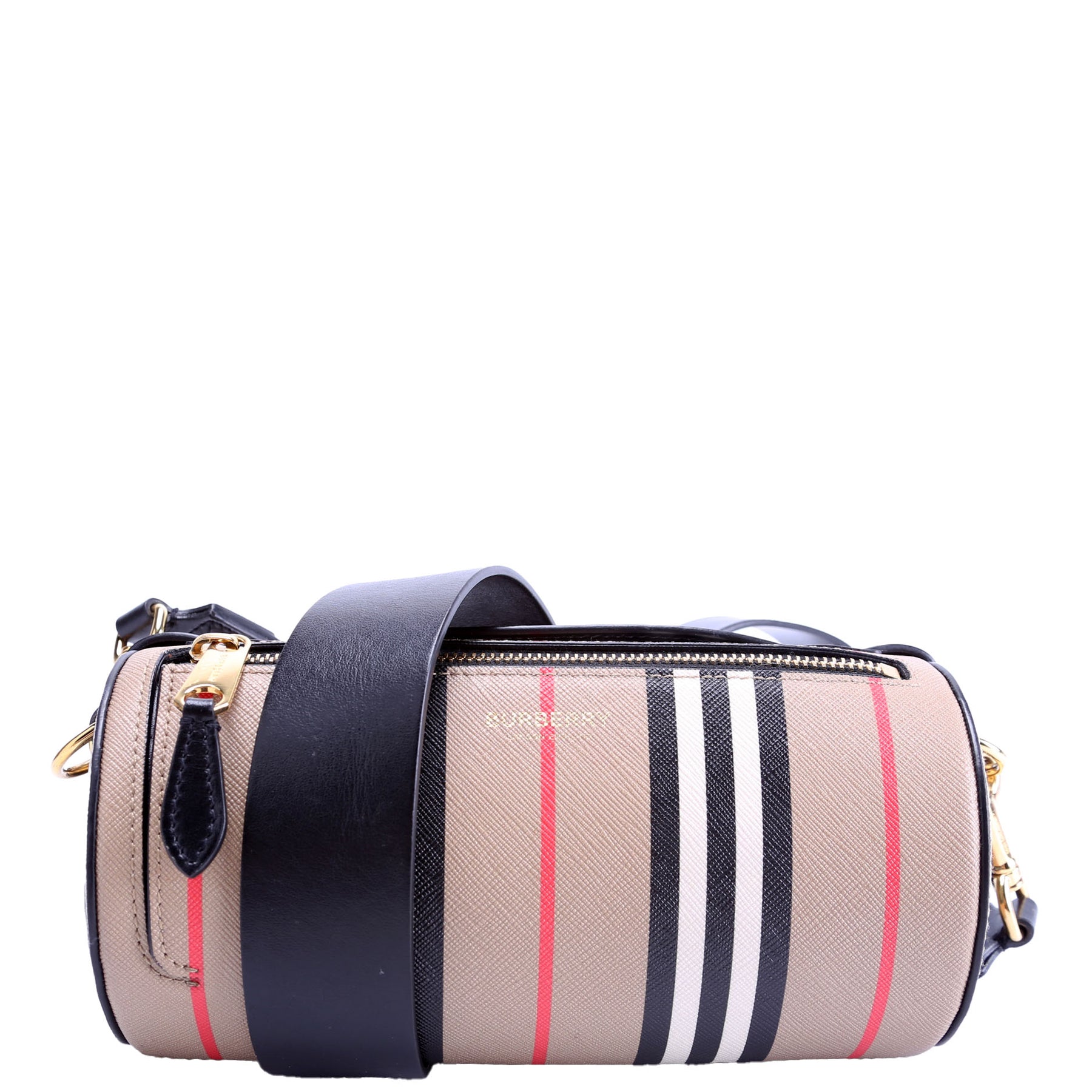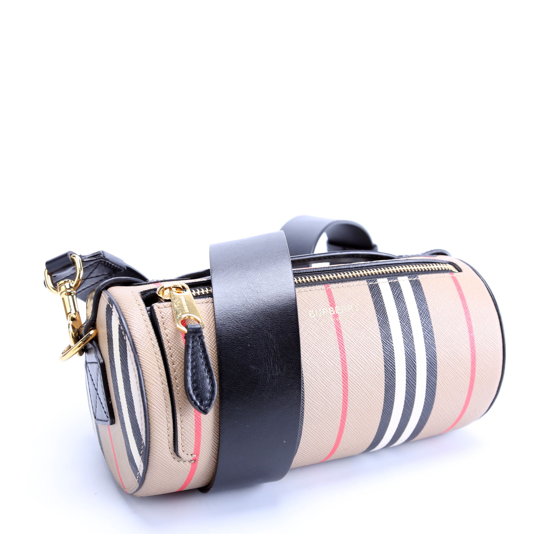 This pre-owned Burberry Icon Stripe E-Canvas Barrel Bag is guaranteed 100% authentic.