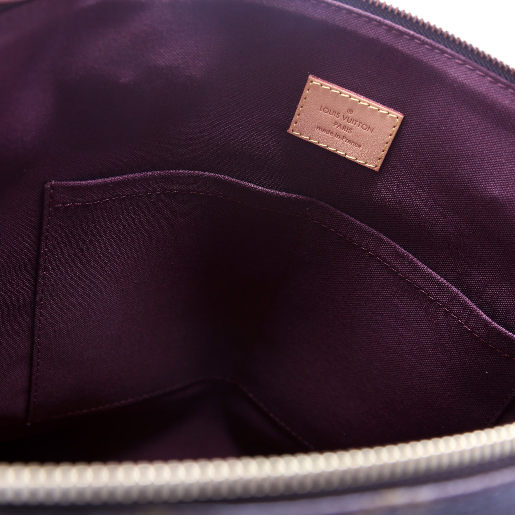 Exterior: The exterior coated canvas is free of any rips or cracks. The corners show light rubbing. The leather tabs show light wear and discoloration. The exterior features one zip closure pocket.