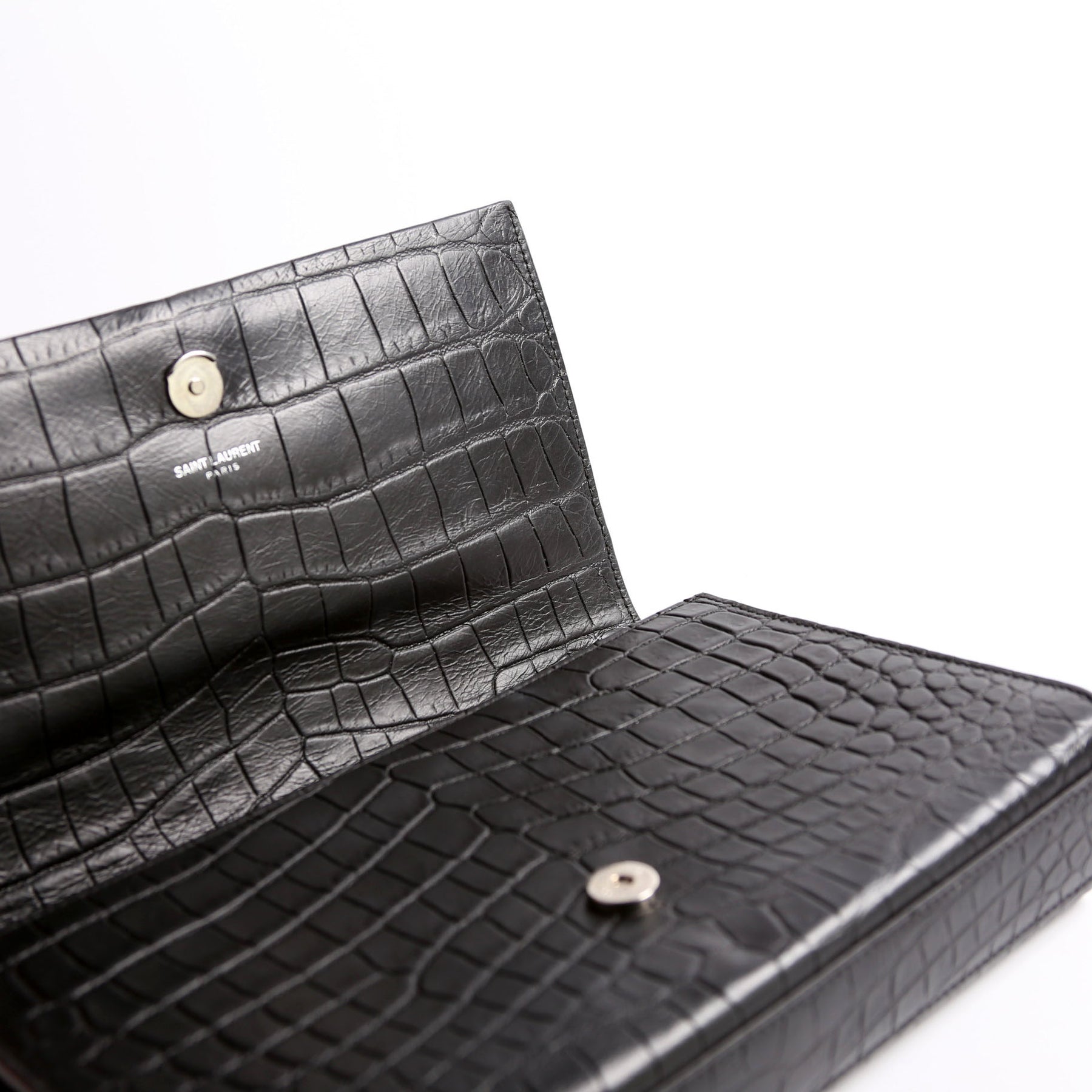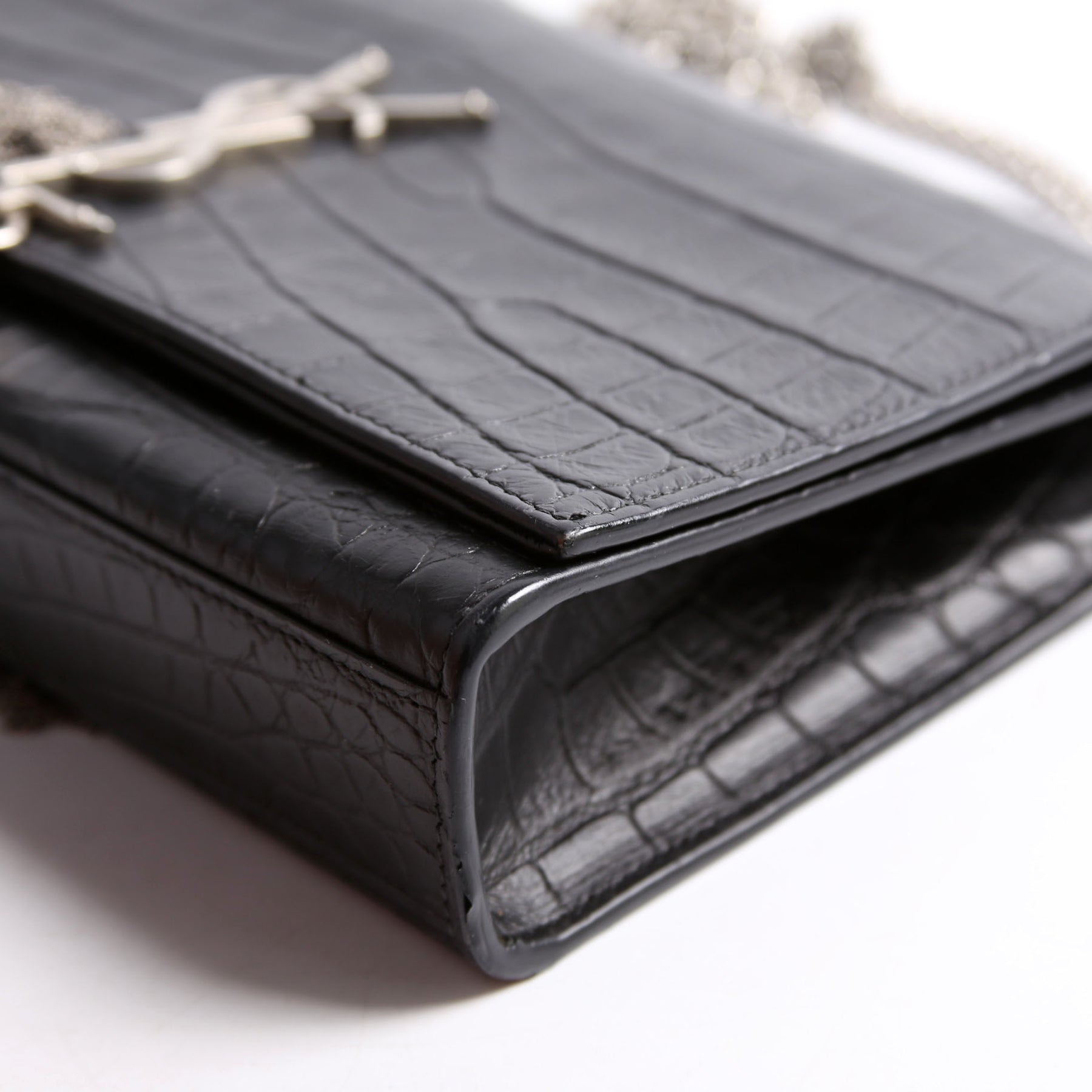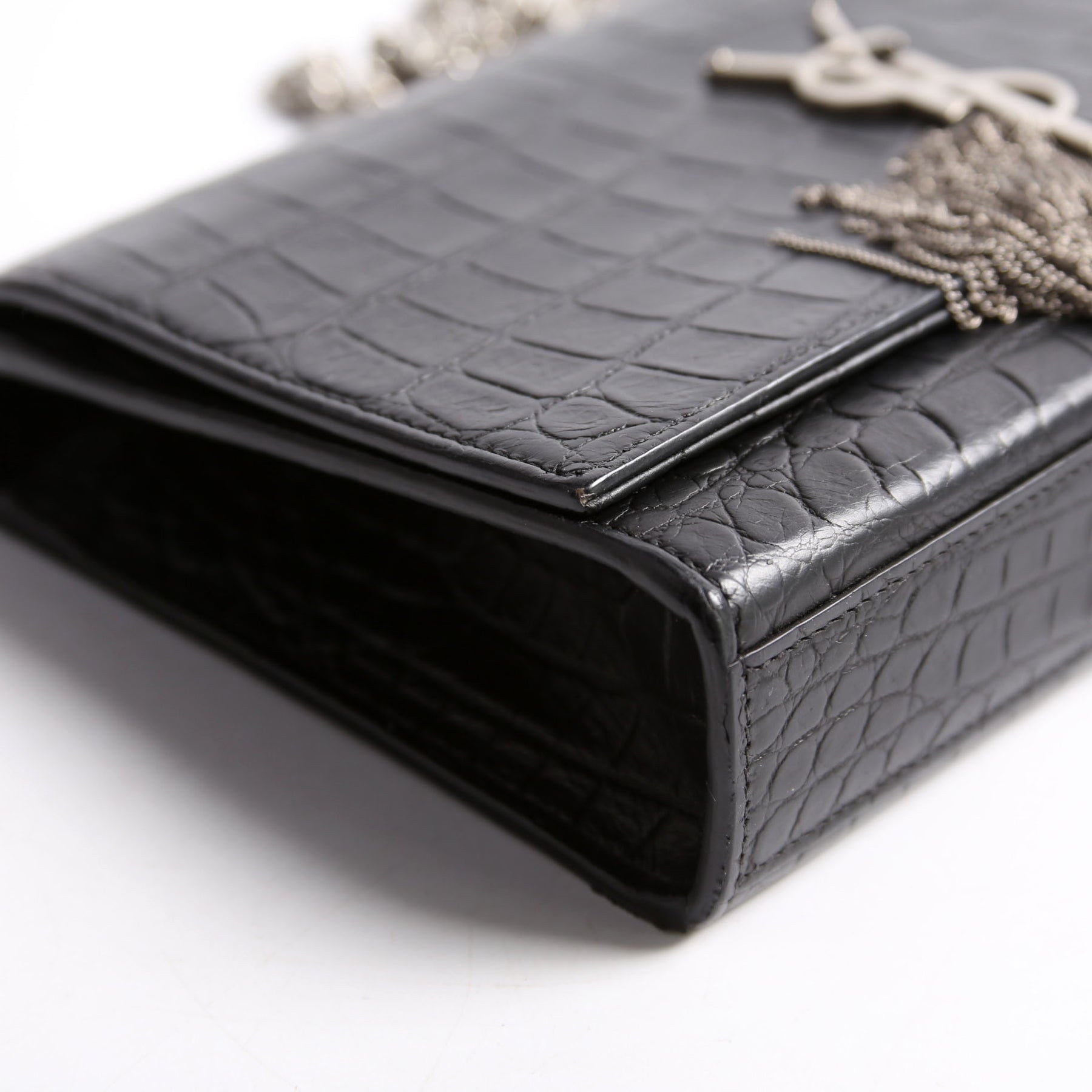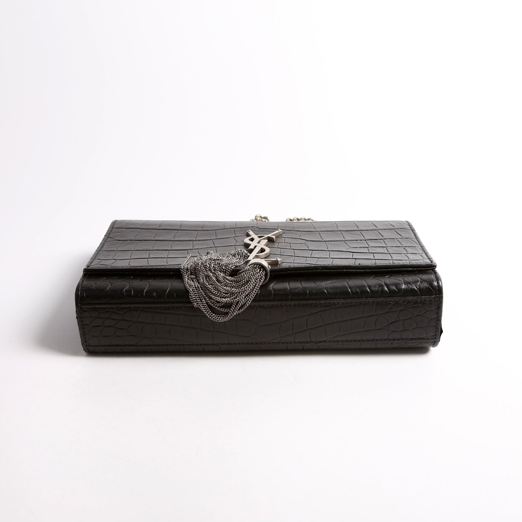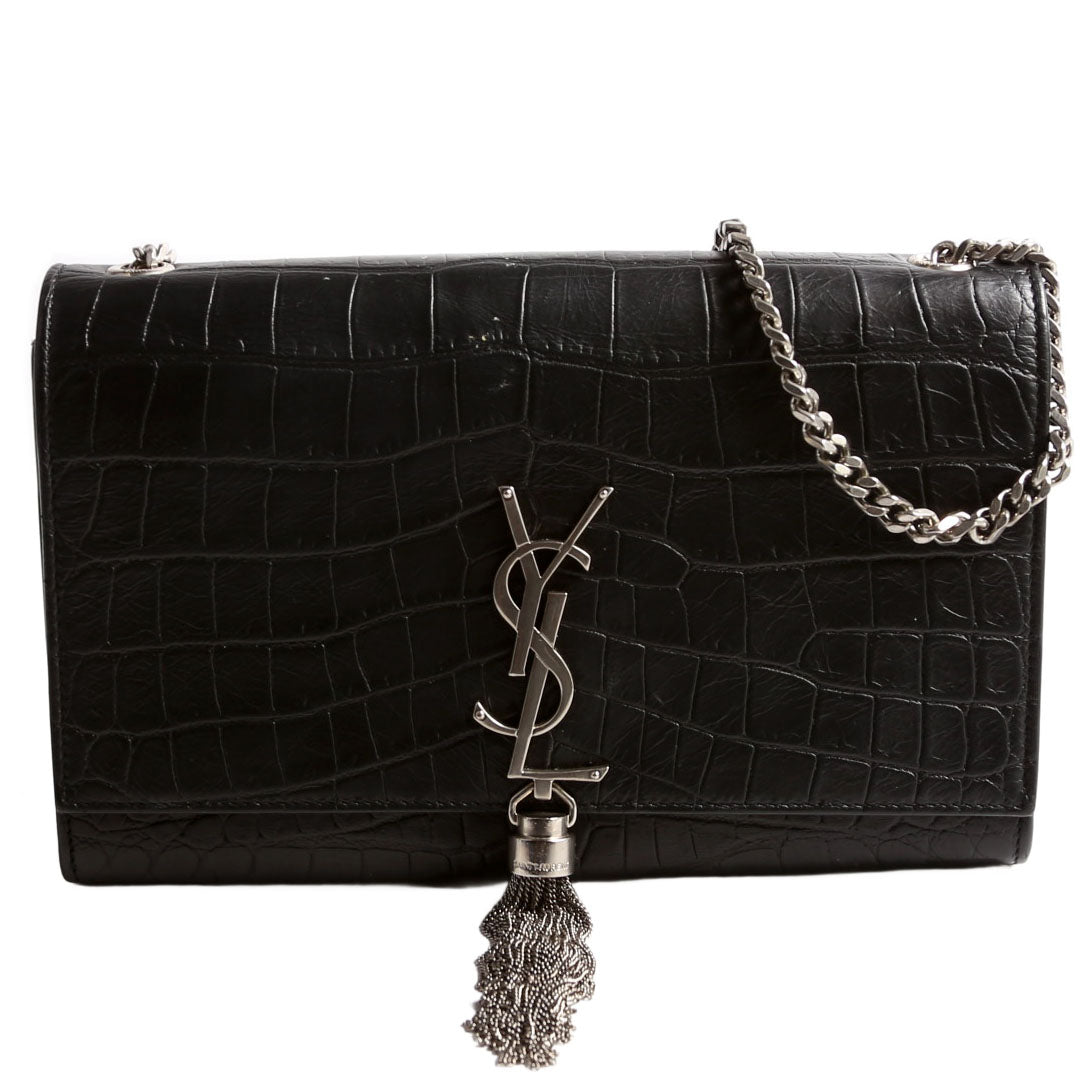 This pre-owned Saint Laurent Kate Tassel Satchel Medium Crocodile Embossed Bag is guaranteed 100% authentic. The exterior is in the classic Saint Laurent Leather.